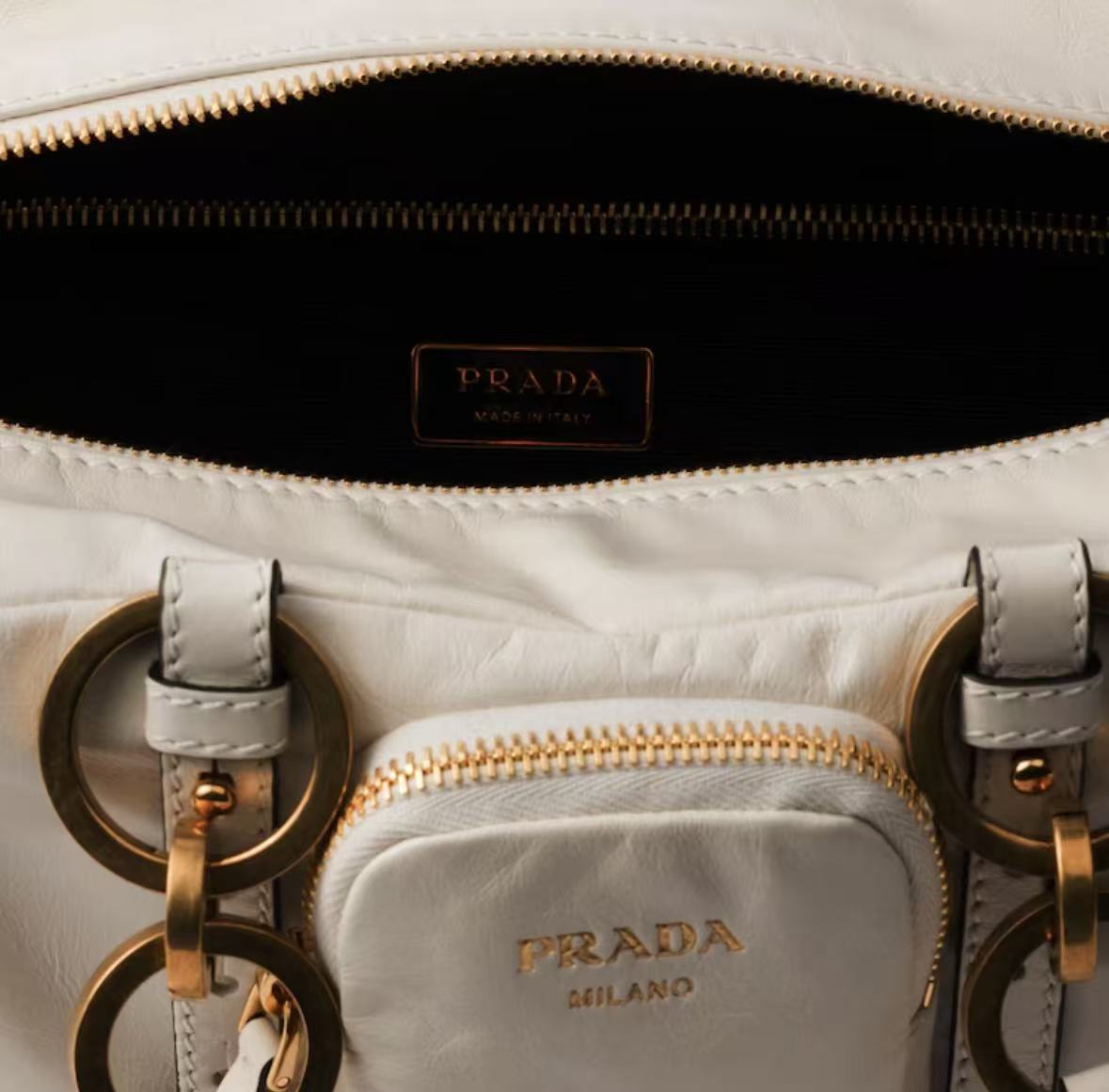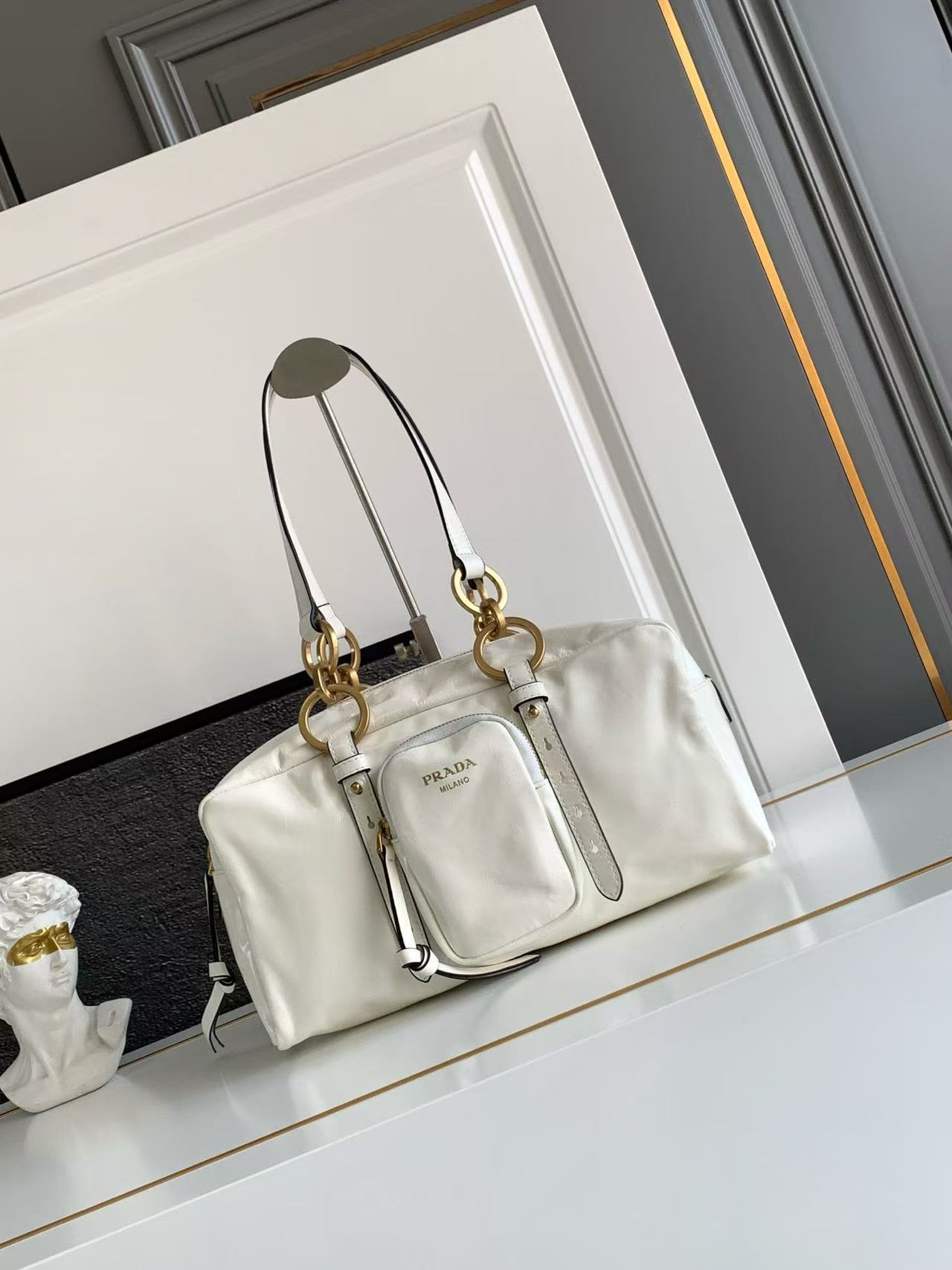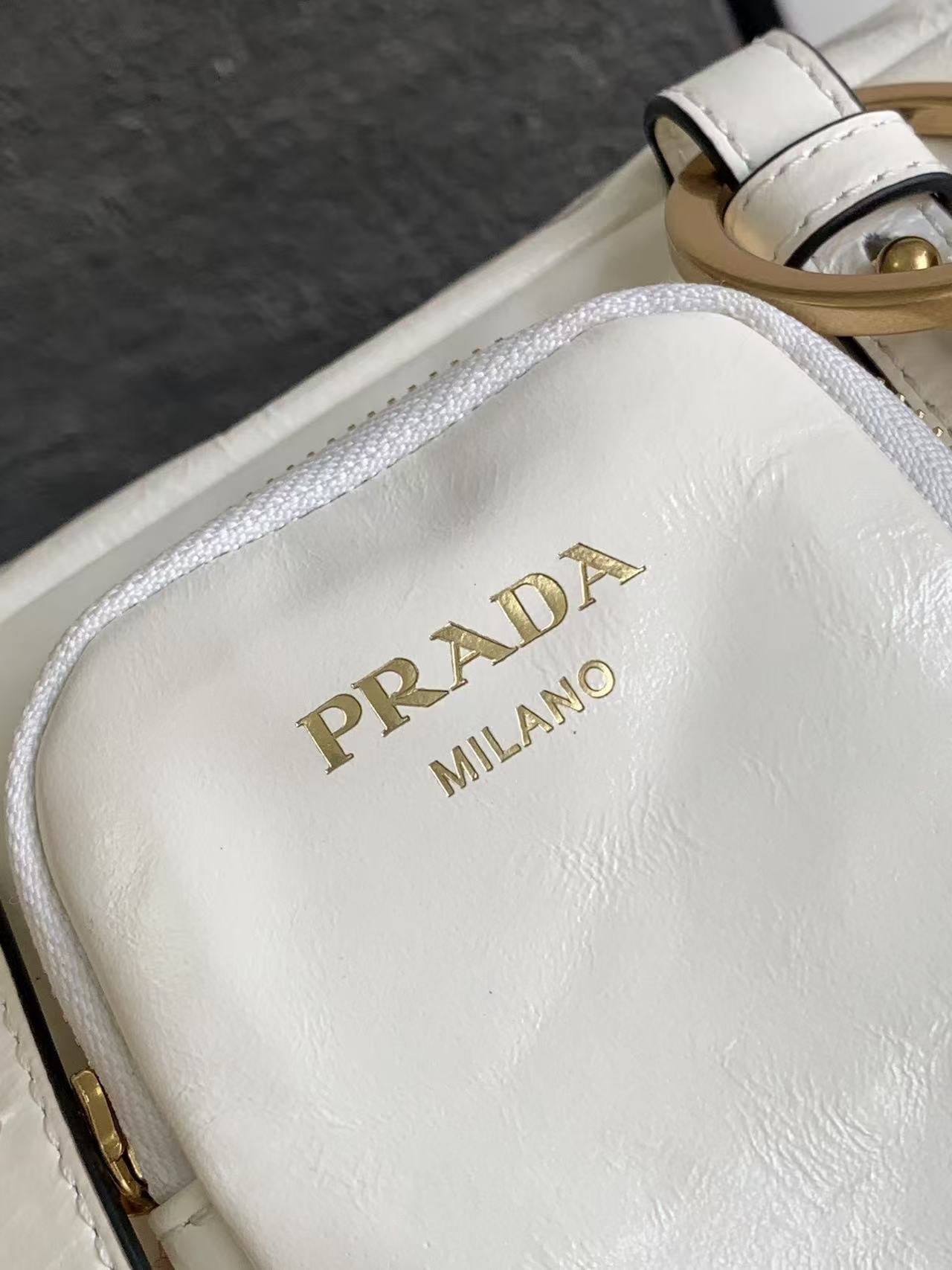 A medium-sized white women\'s handbag with a classic long-handled design from the PRADA Dangle brand