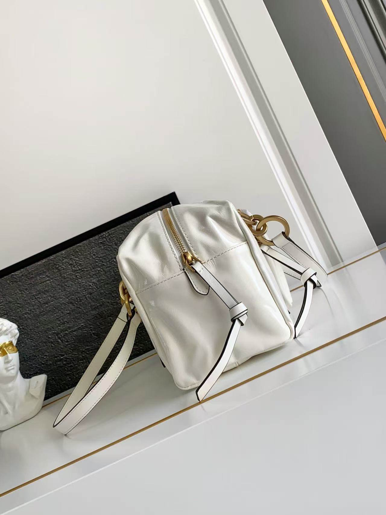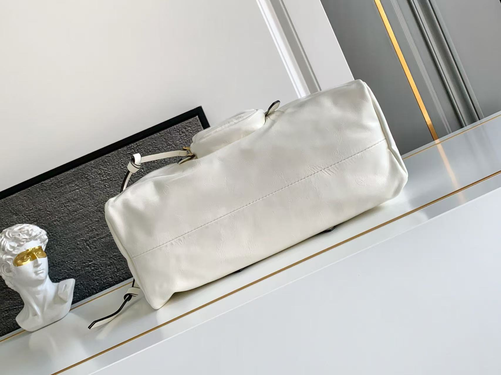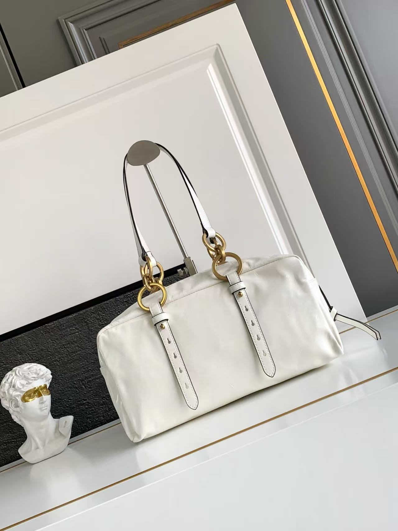 A medium-sized white women\'s handbag with a classic long-handled design from the PRADA Dangle brand