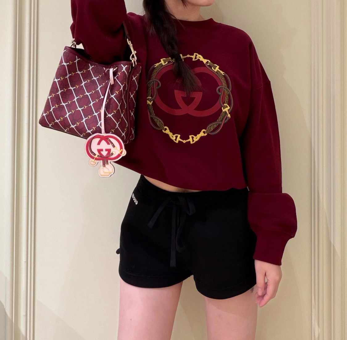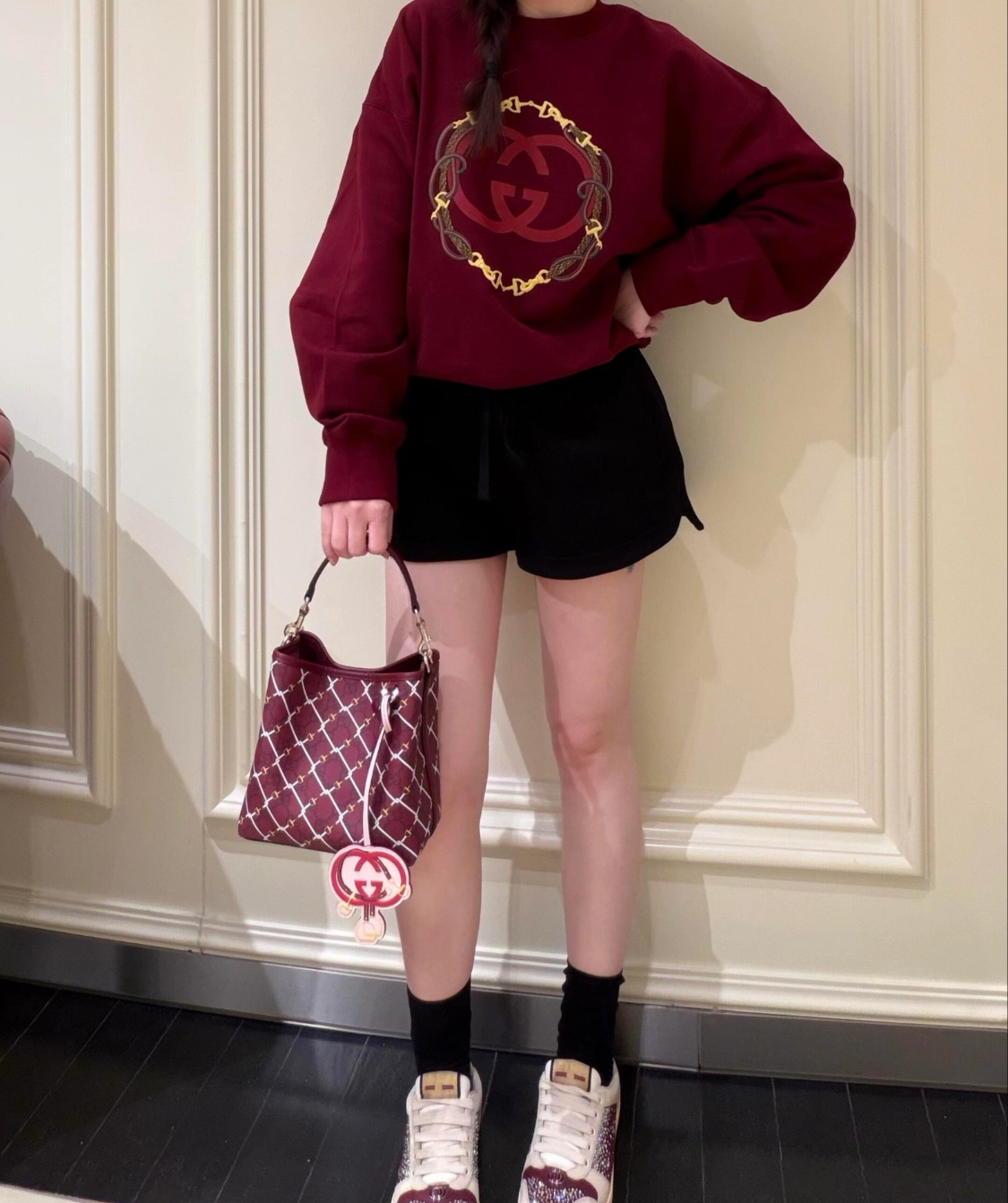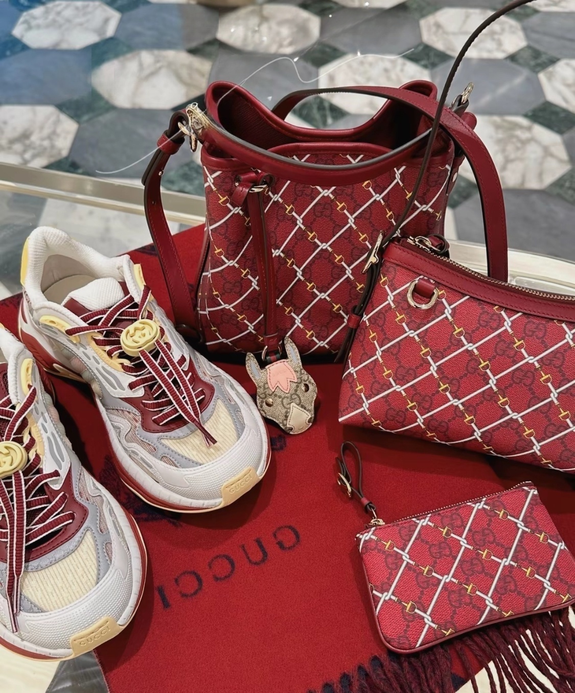 GUCCI GG Emblem GG interwoven pattern, gold hardware bucket bag, single-shoulder handbag, small size for women, red