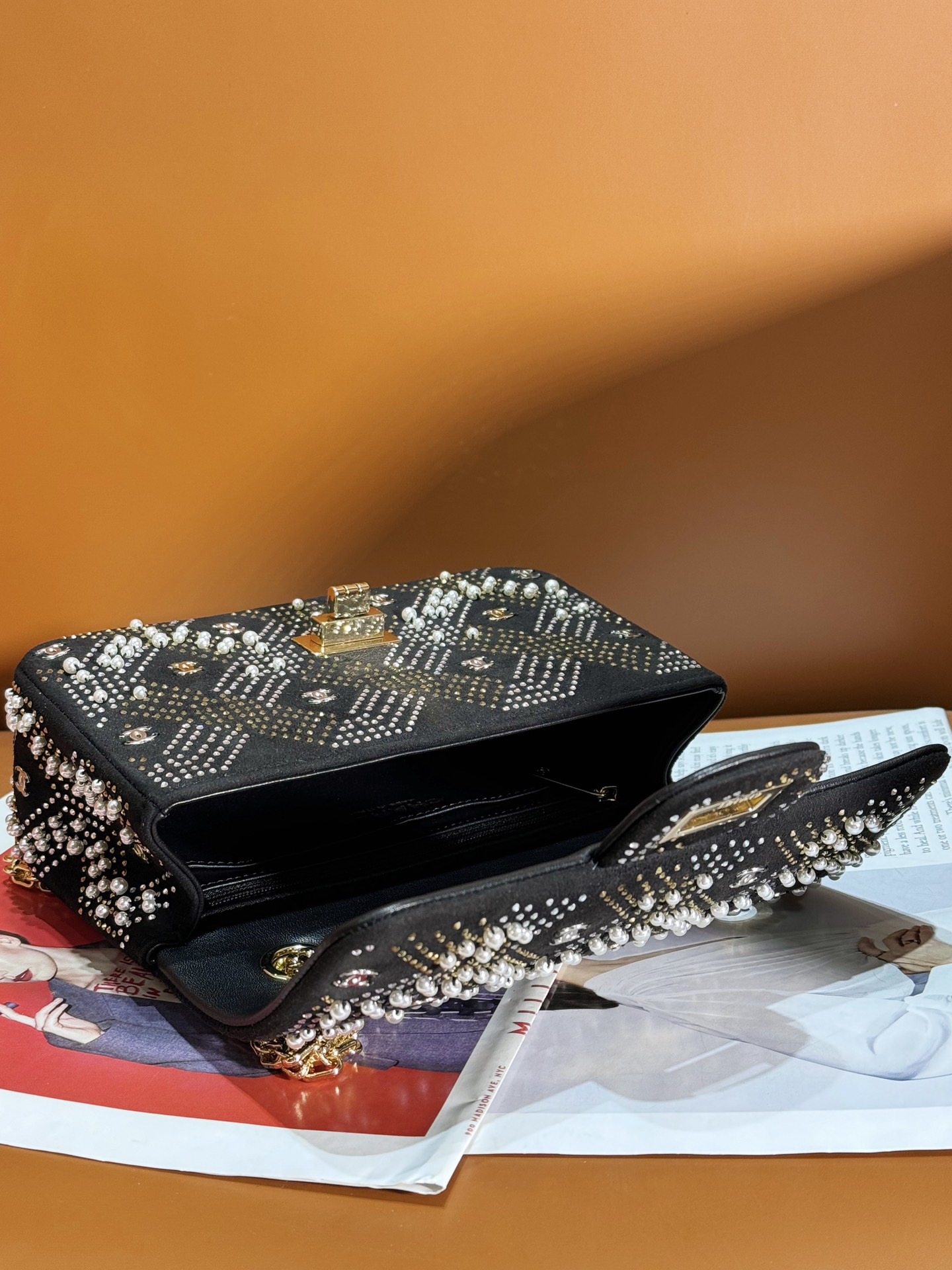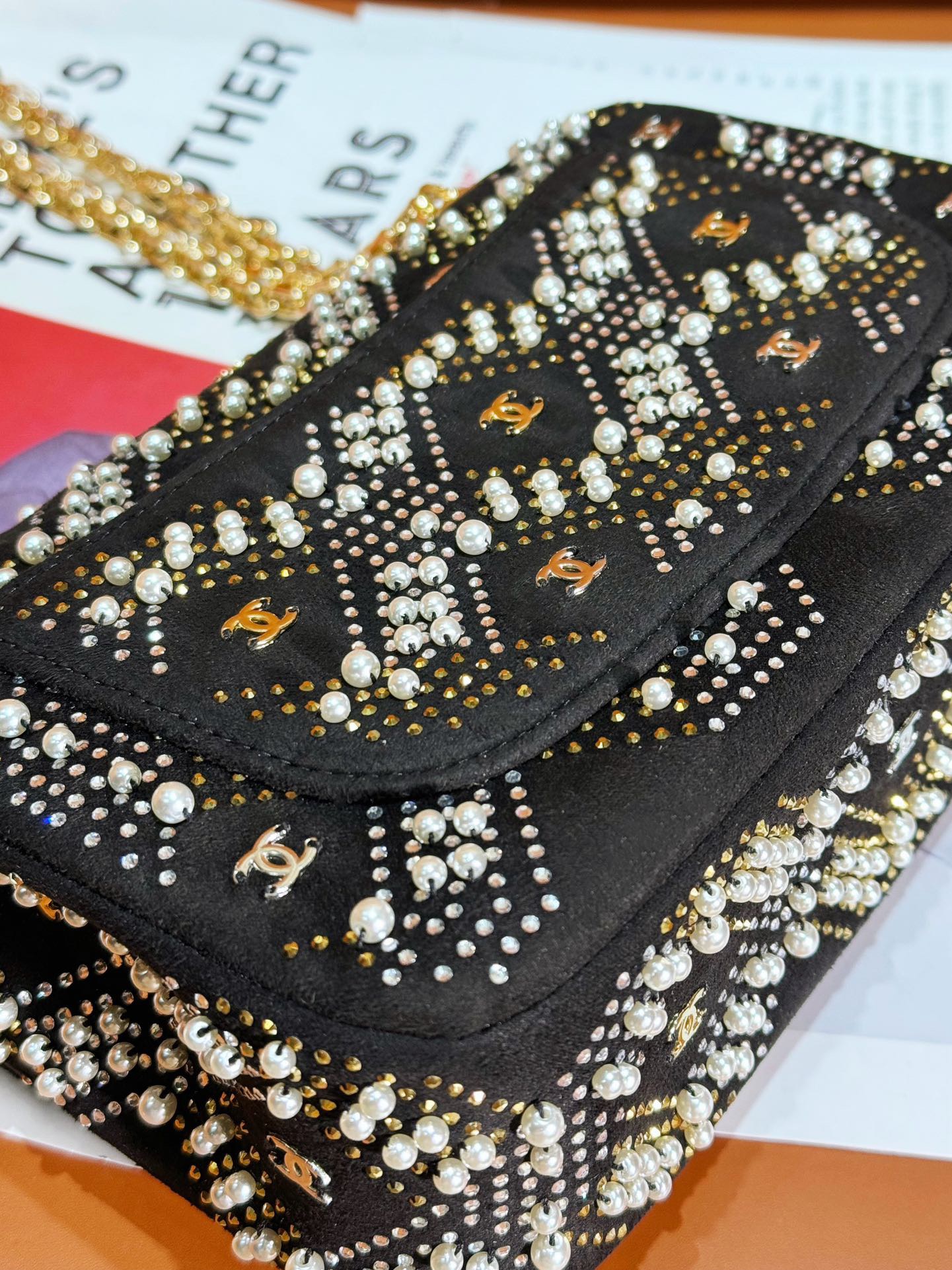 CHANEL velvet crystal pearl Double C Logo metal lid single-shoulder crossbody bag mini black
