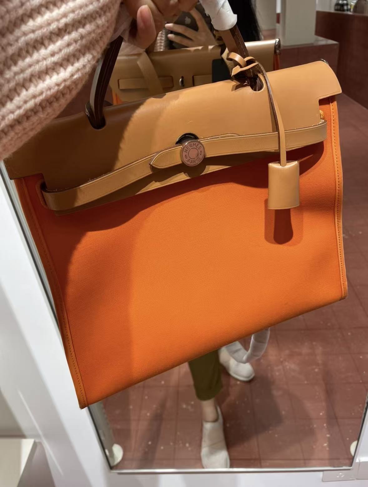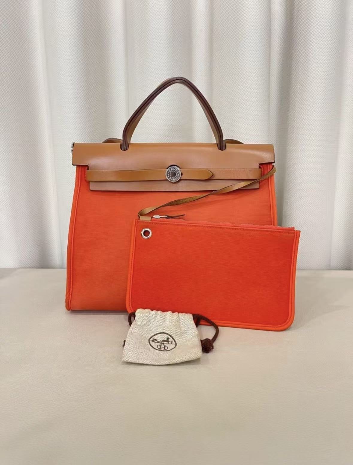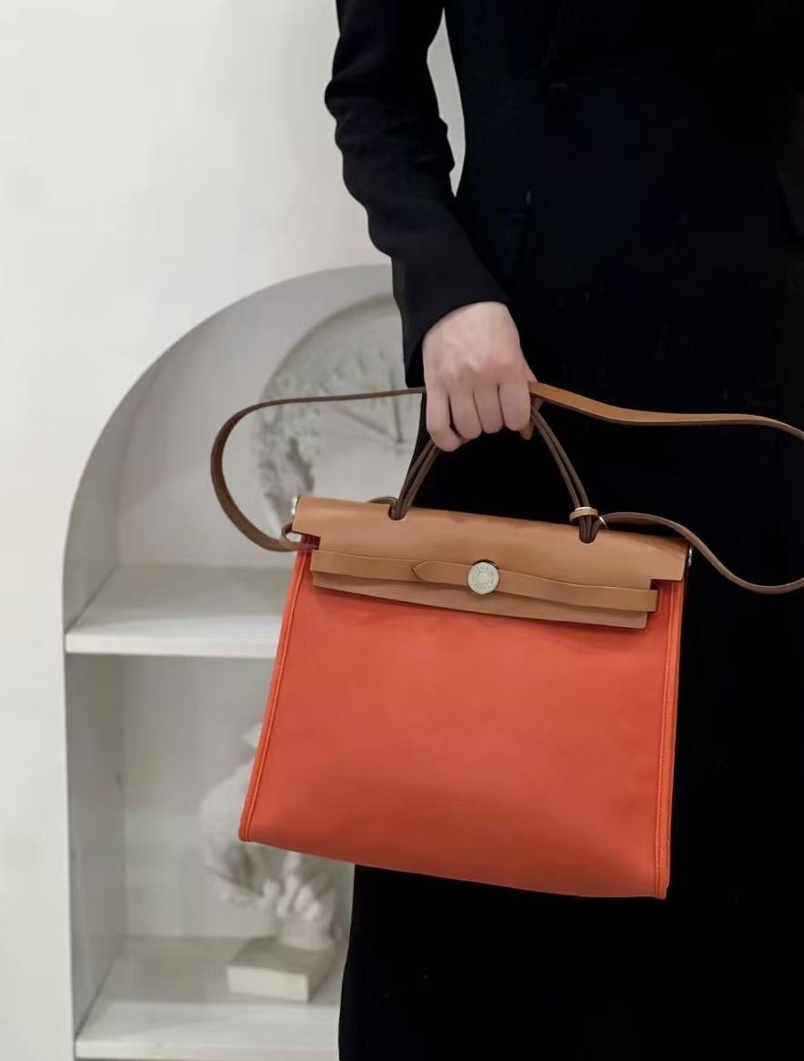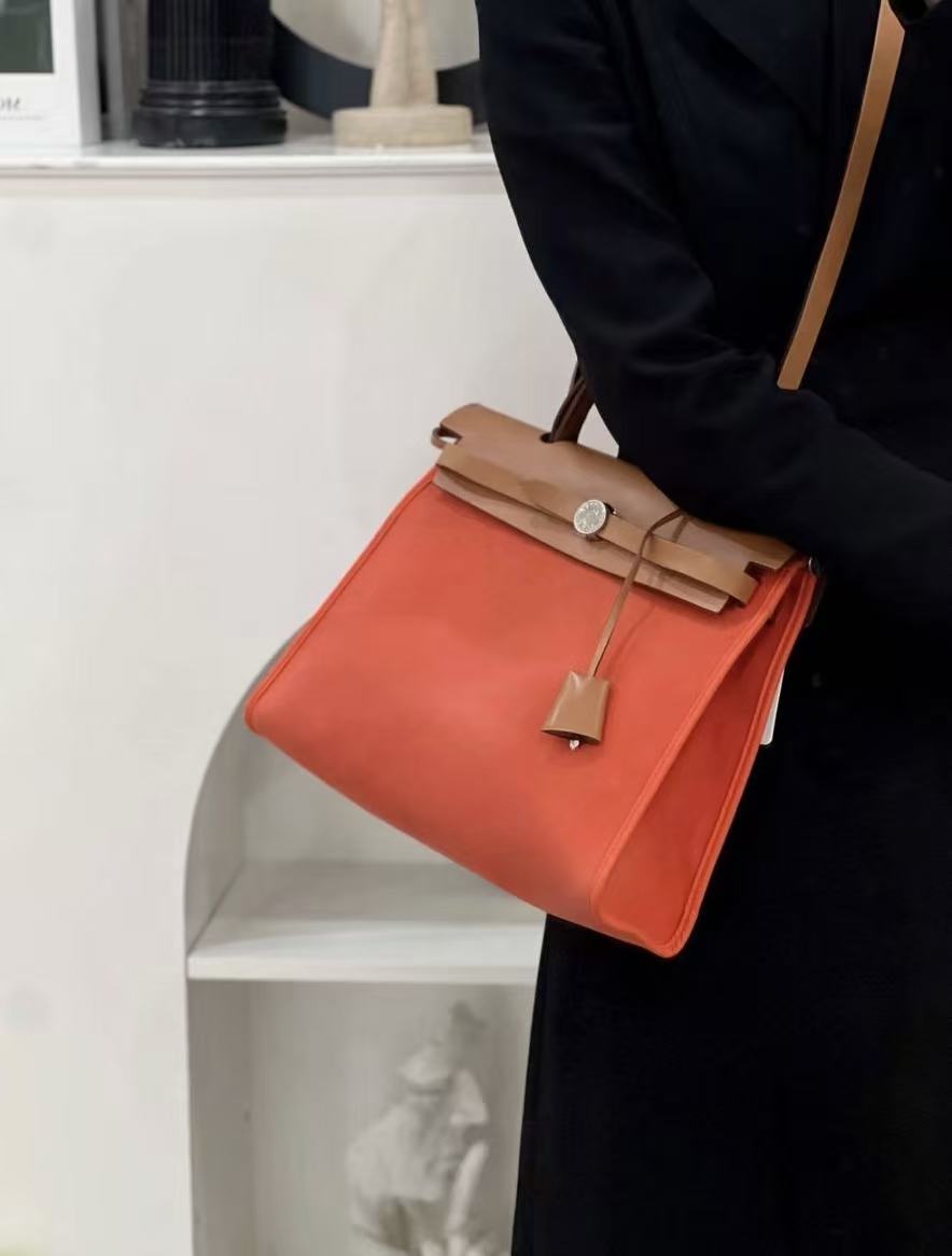 HERMES Herbag Zip 31 Silver buckle single-shoulder crossbody handbag 31 Unisex Couple Style Flame Orange with Gold Brown