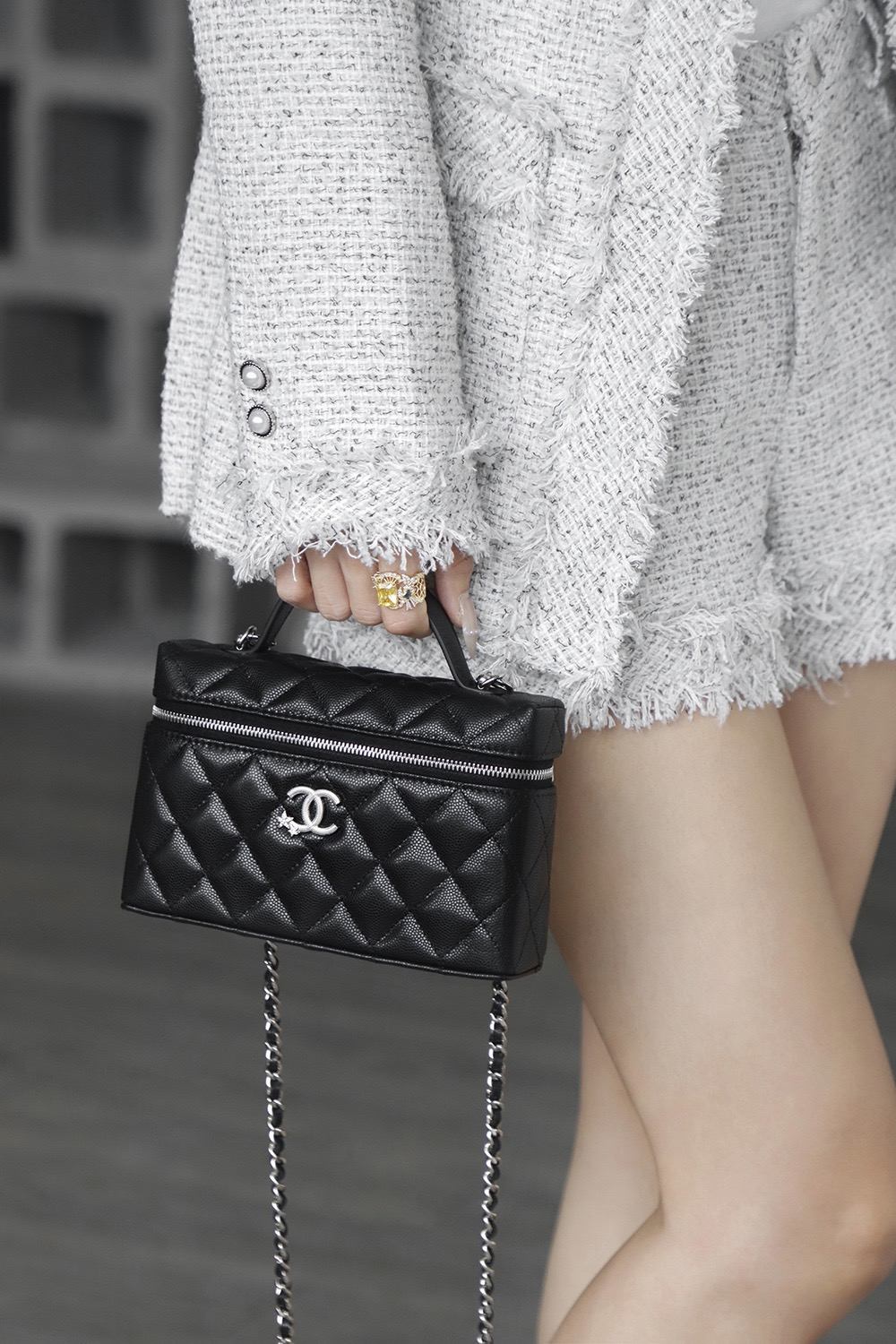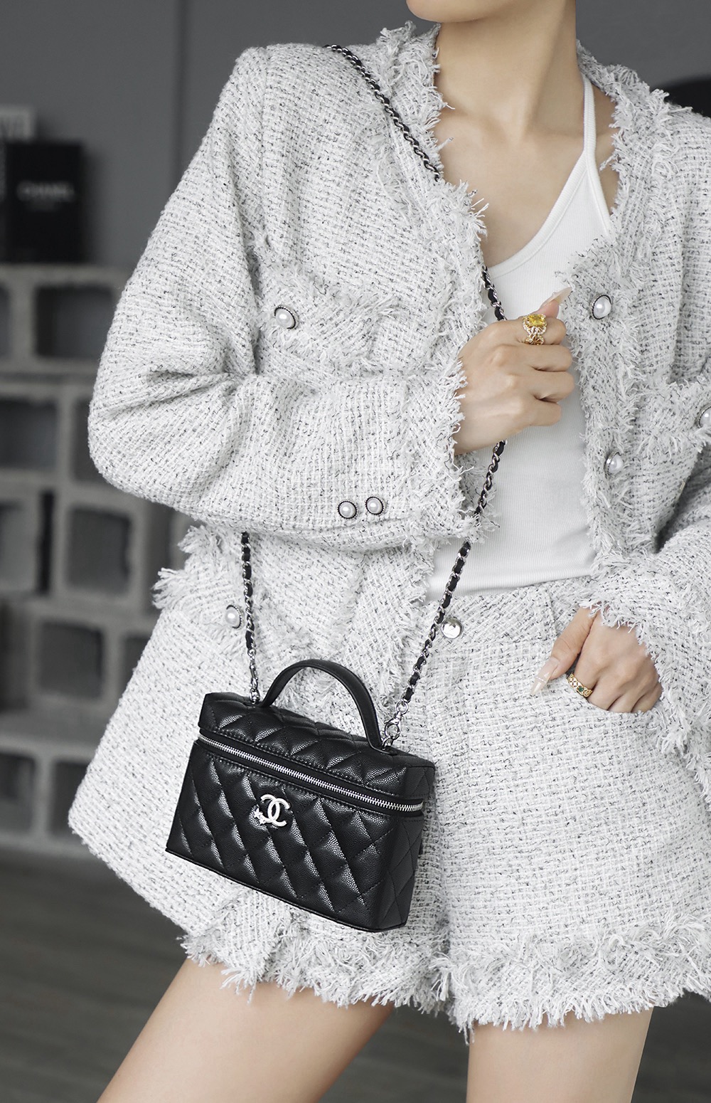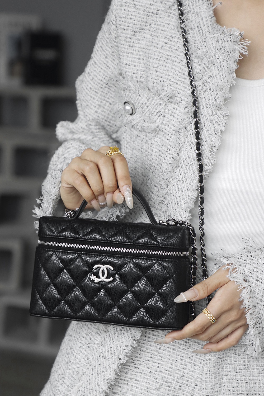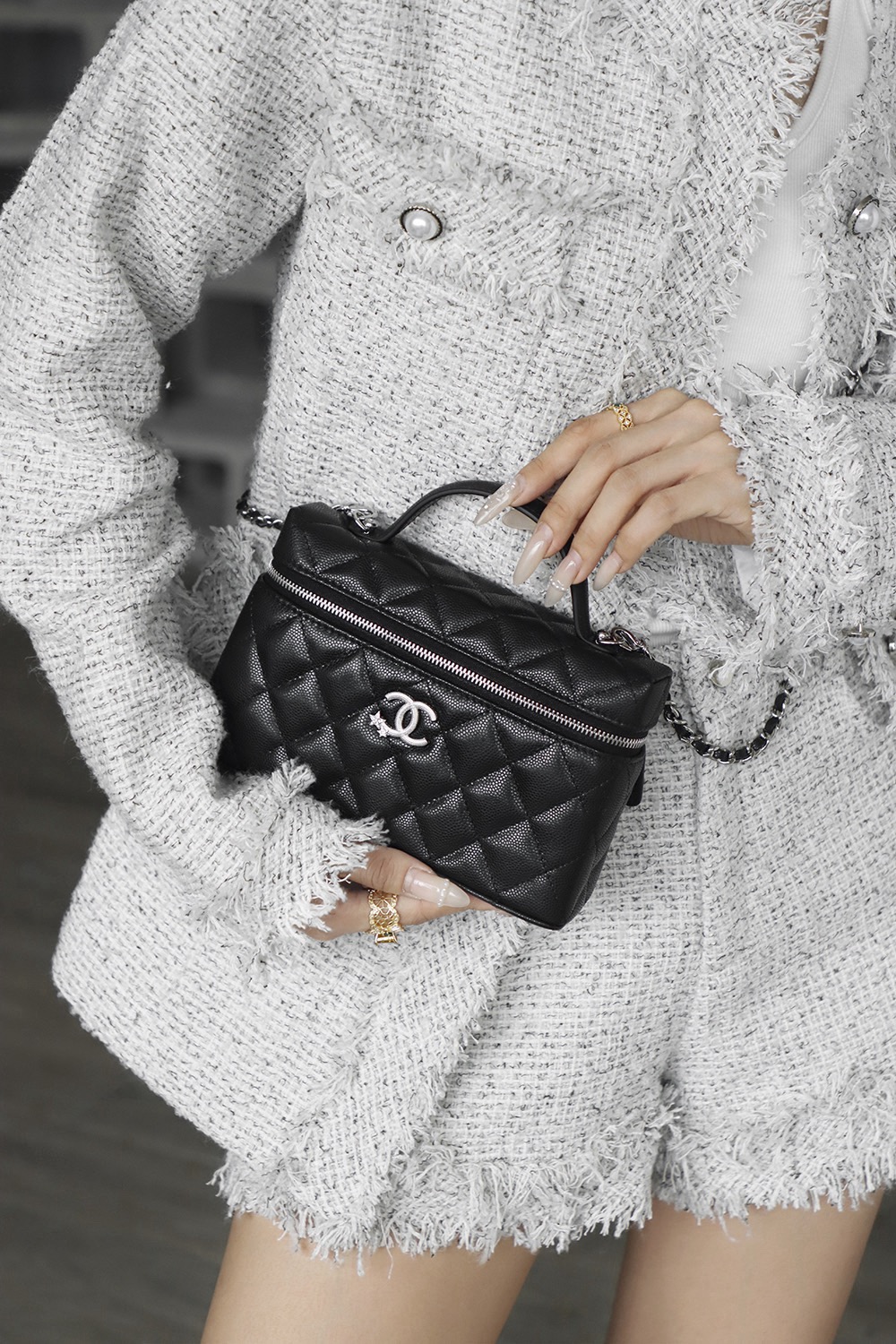 CHANEL 25B Star Series brand Logo water diamond leather chain grain material silver chain hand-held cosmetic bag black