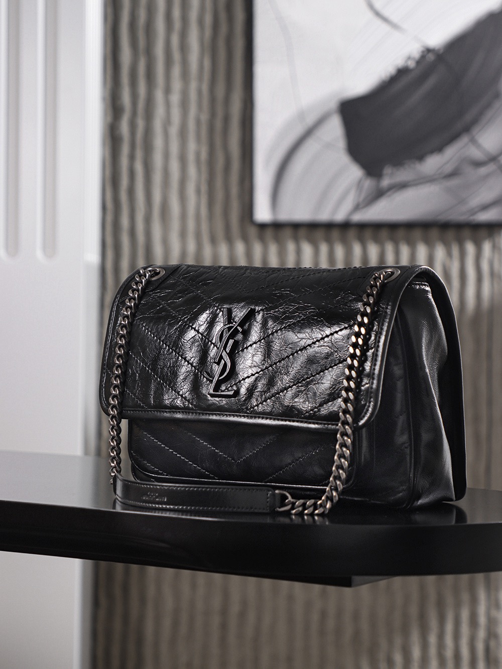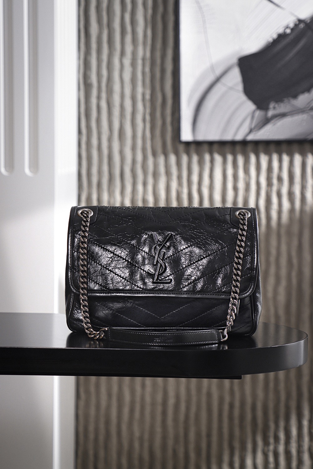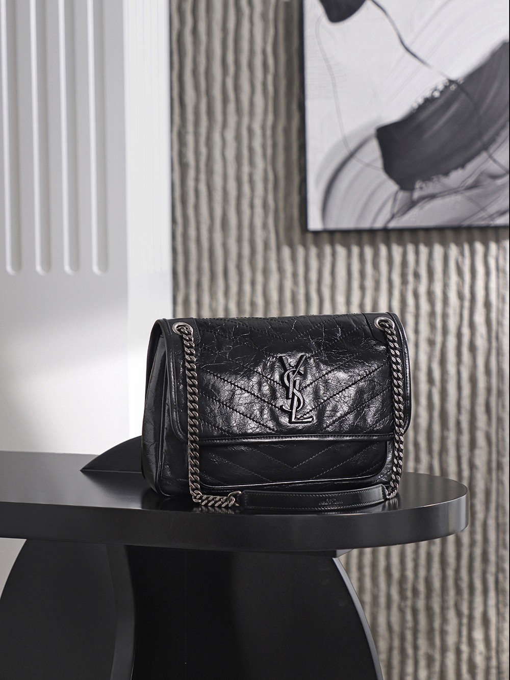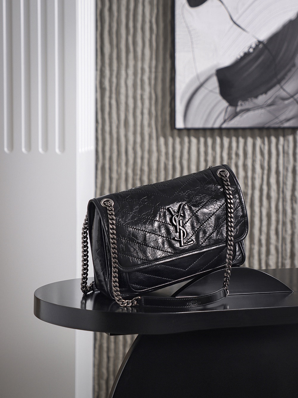 SAINT LAURENT YSL Niki silver chain black Logo retro pleated wandering bag crossbody single-shoulder bag medium size black