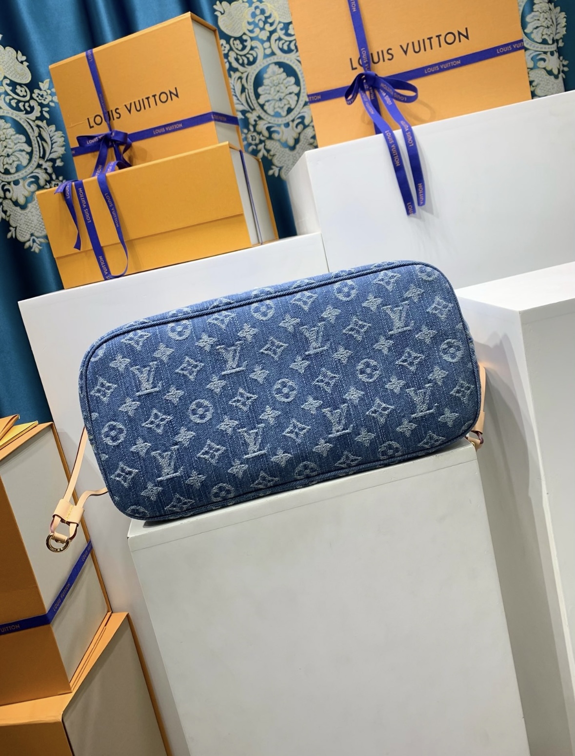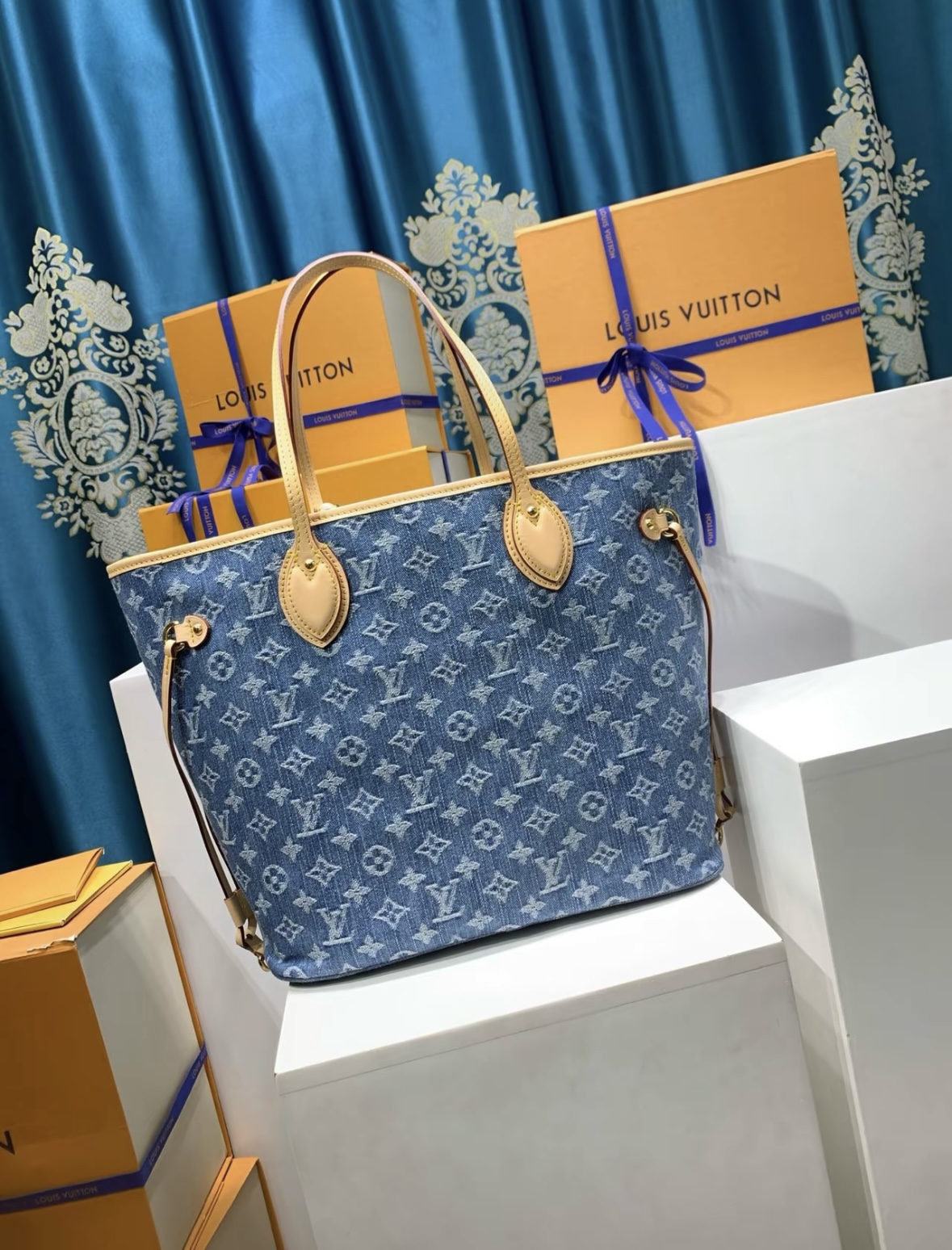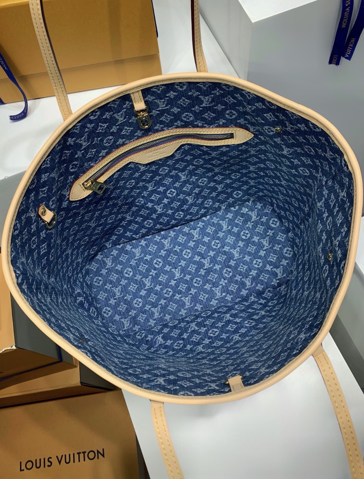 LOUIS VUITTON NEVERFULL Logo printed Tote bag, shopping bag, hand bag, shoulder bag, medium size, blue