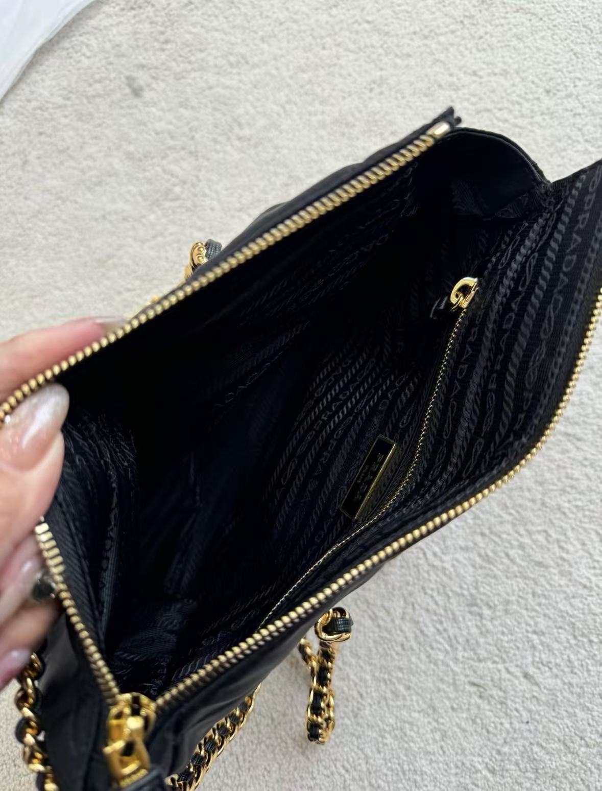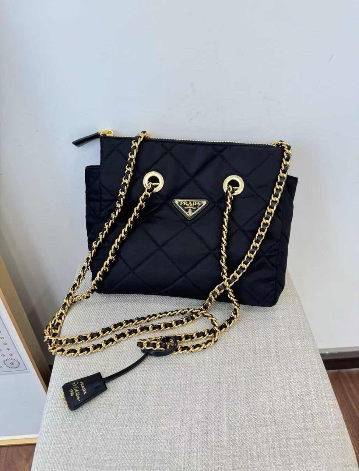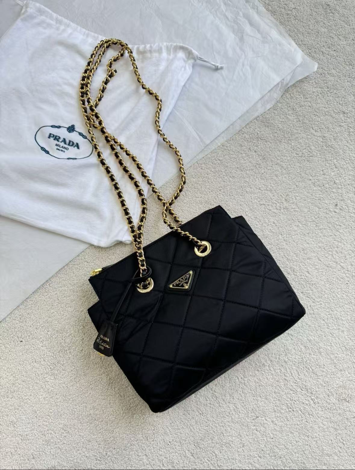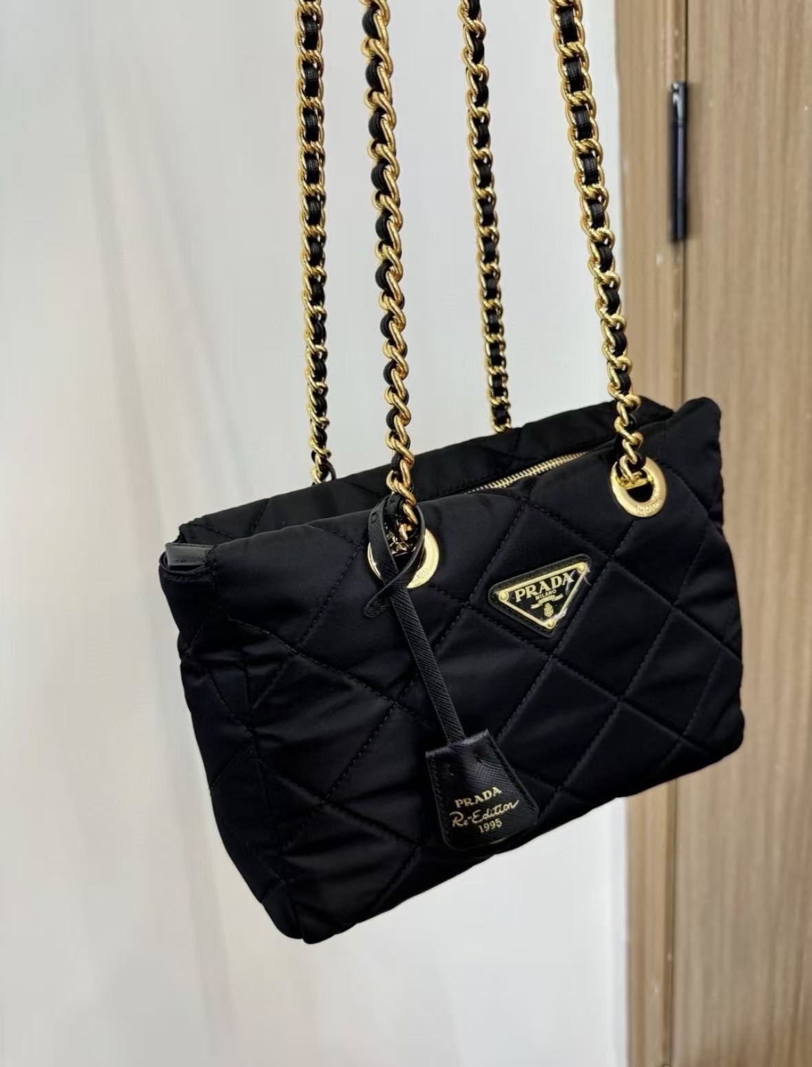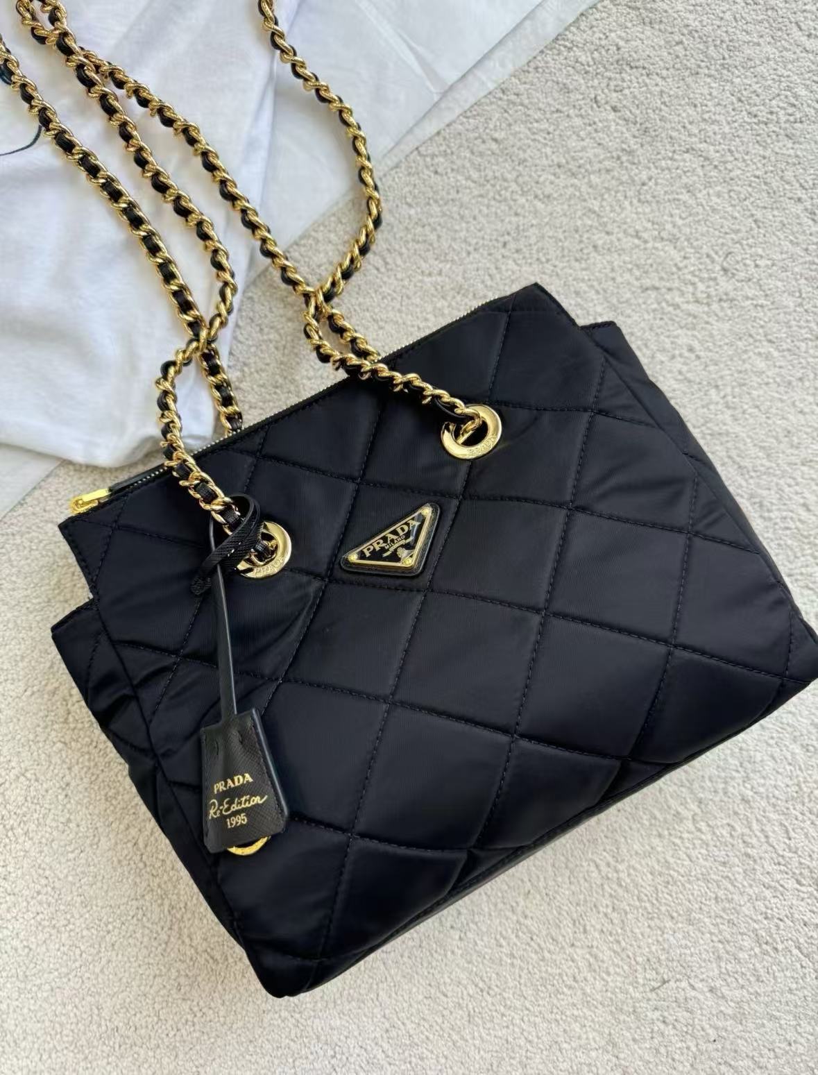 PRADA Re-Edition 1995 Chaine Metal logo diamond-patterned Tote bag, Tote bag, shopping bag, wandering bag, parachute bag, crossbody single-shoulder bag, women\'s black style