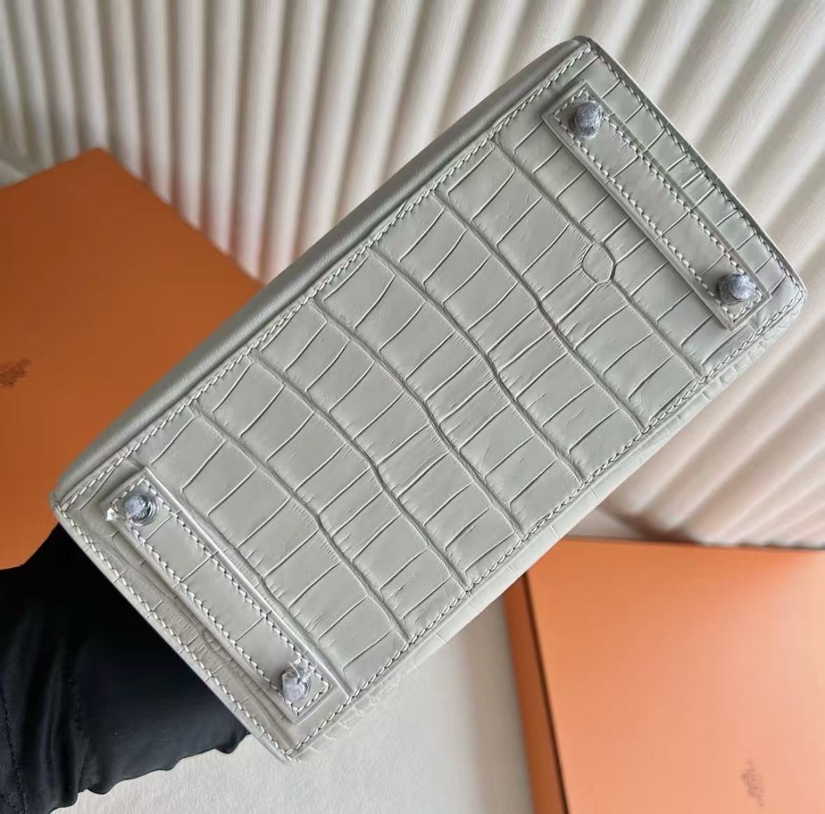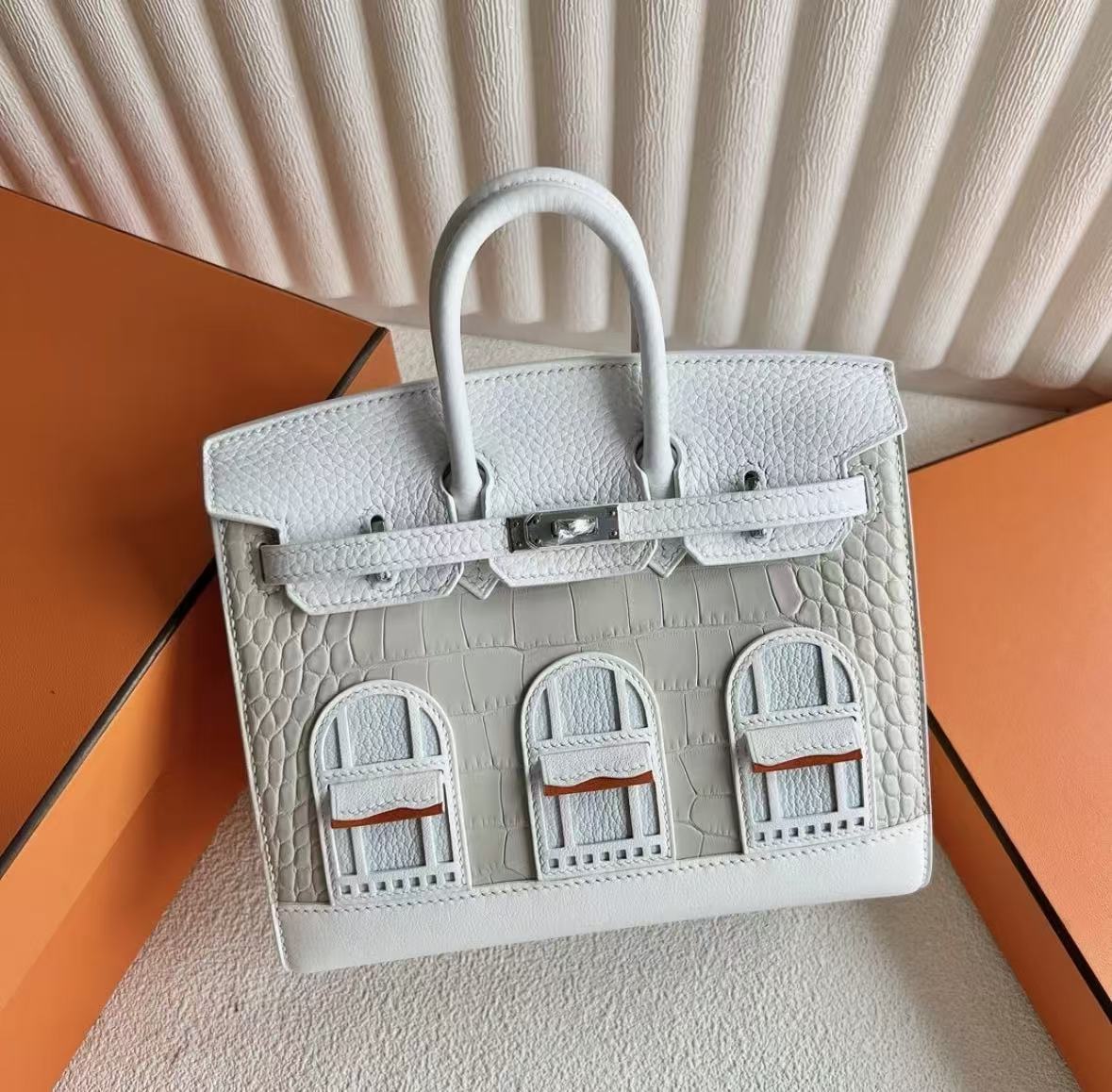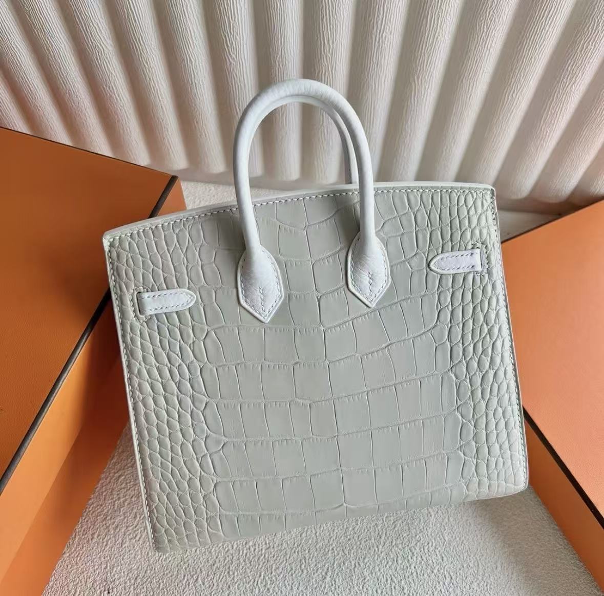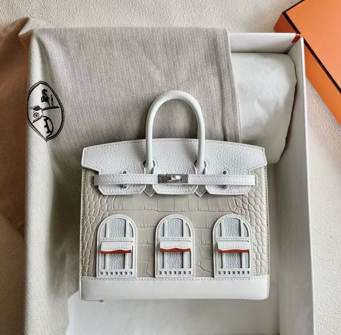 HERMES Birkin 20 silver clasp, snow-white house bag, platinum bag for women, cement grey, white and haze blue