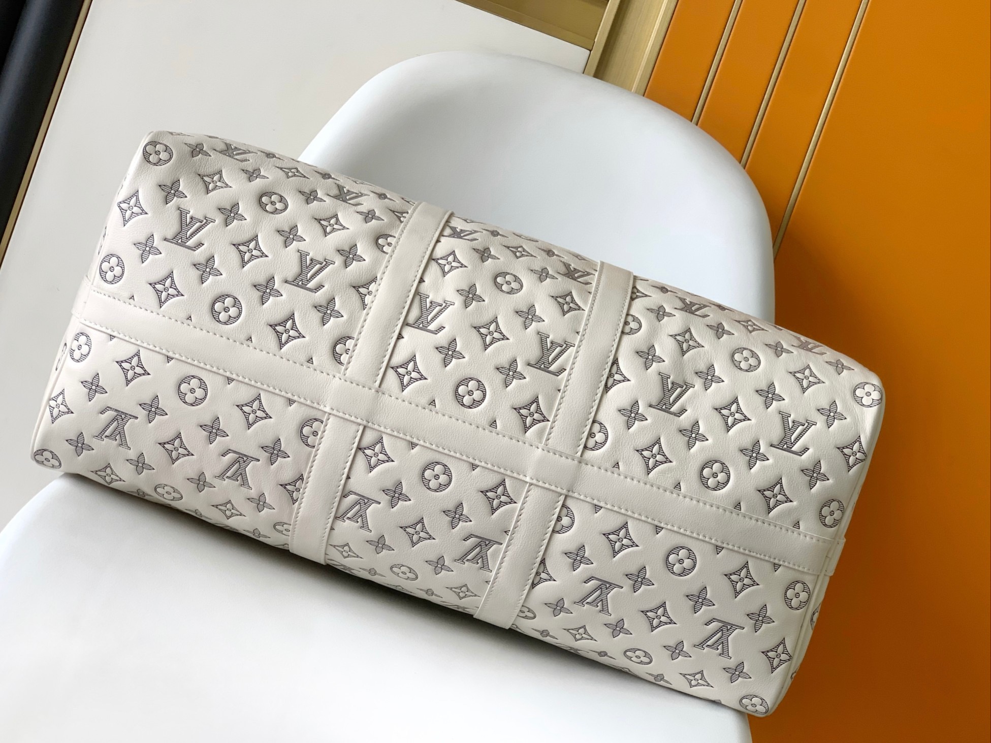 LOUIS VUITTON keepall 50 detachable and adjustable shoulder strap letter-printed single-shoulder crossbody hand-held travel bag in white with navy style