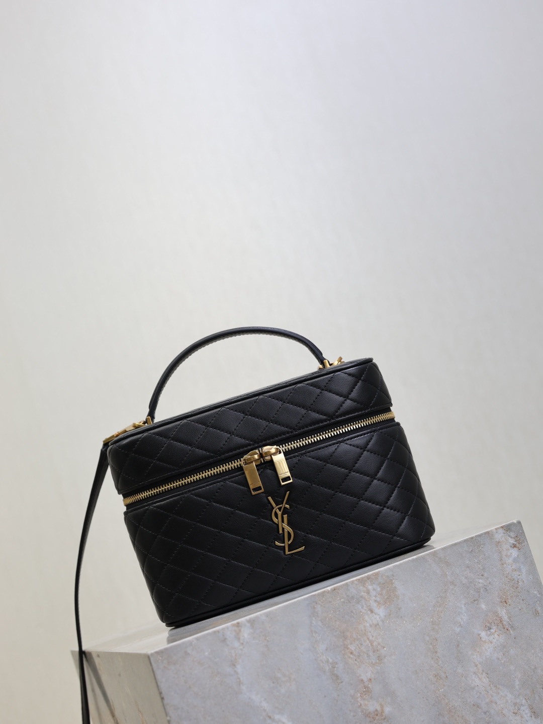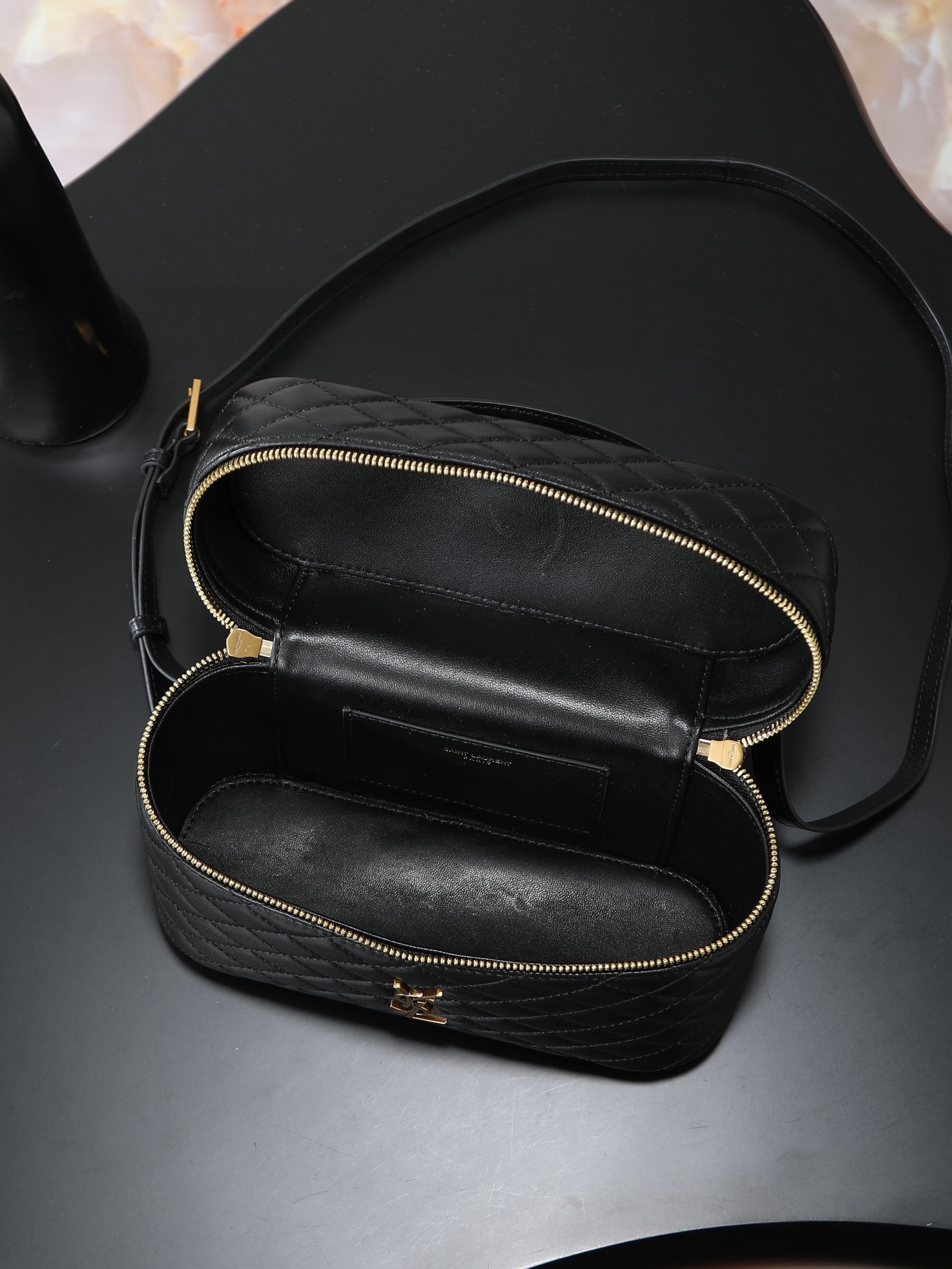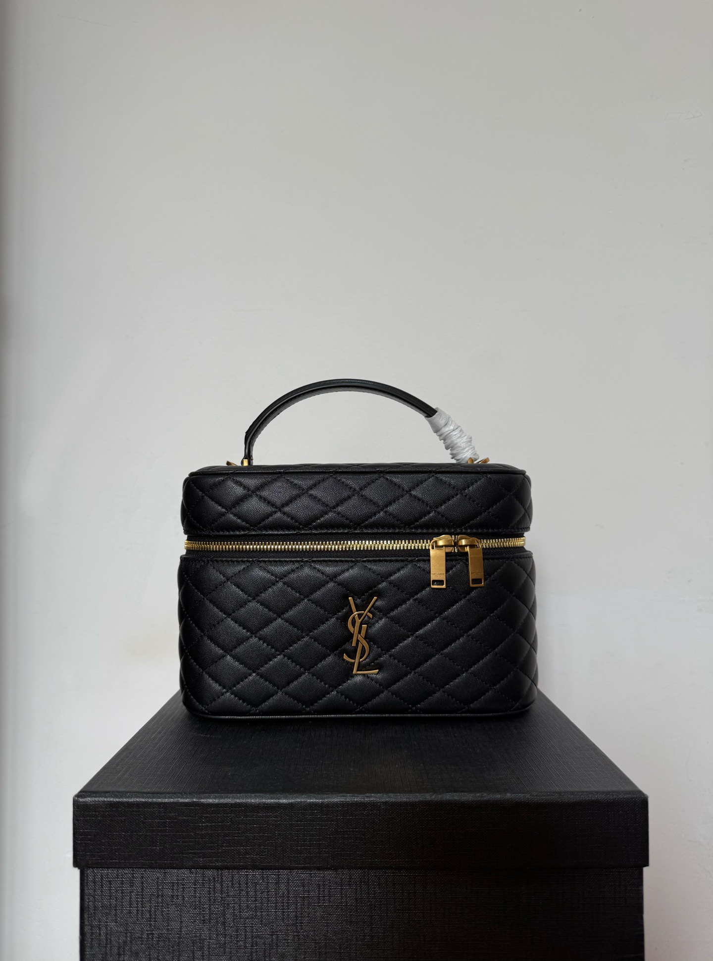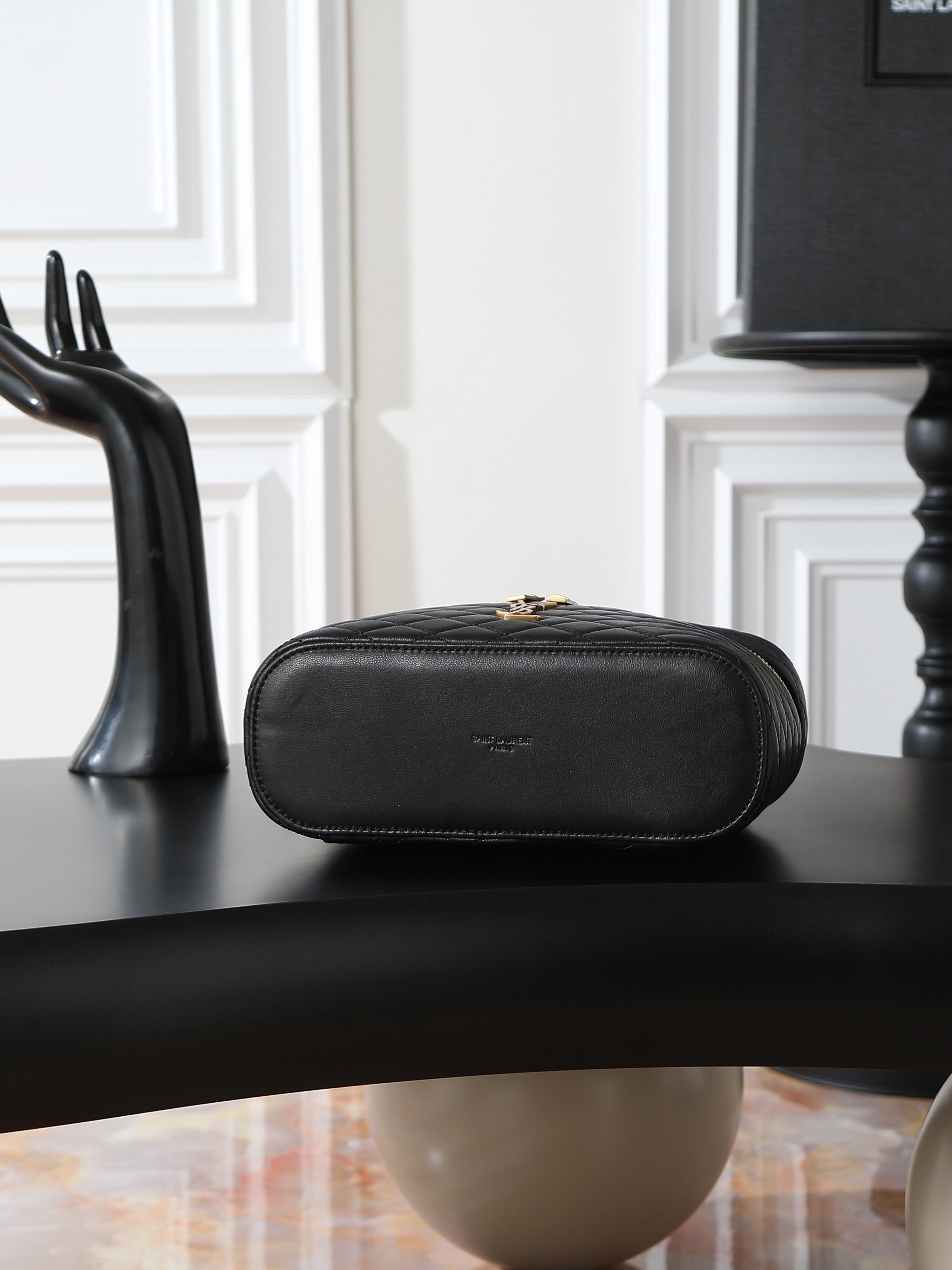 SAINT LAURENT GABY gold hardware brand logo sheepskin cosmetic bag, large black