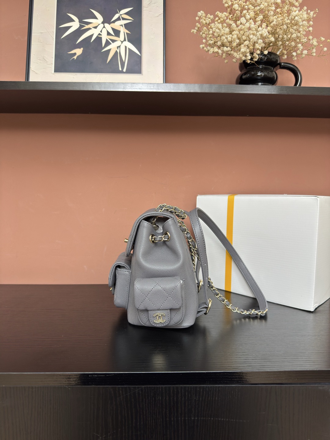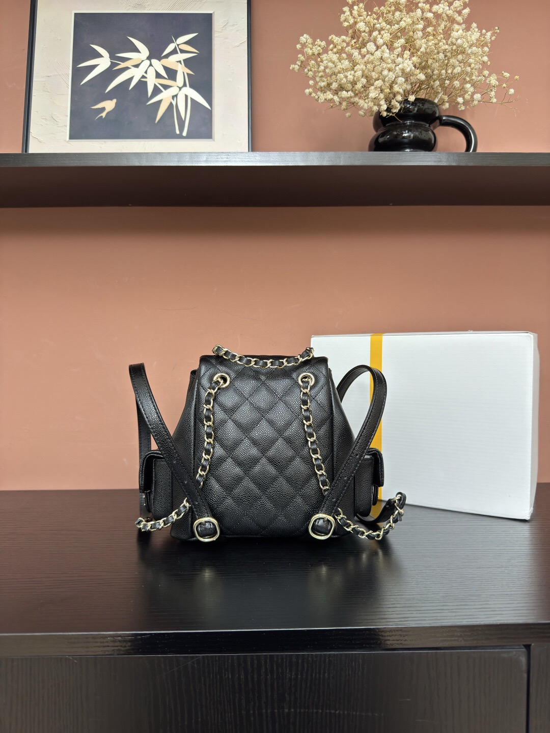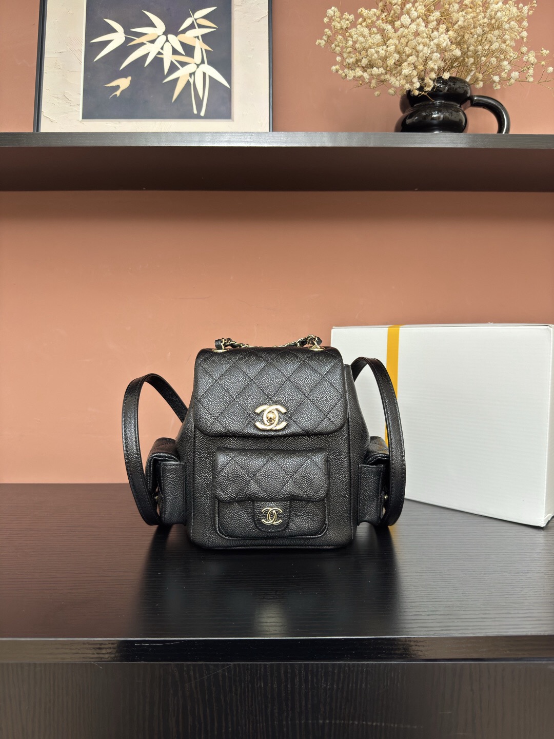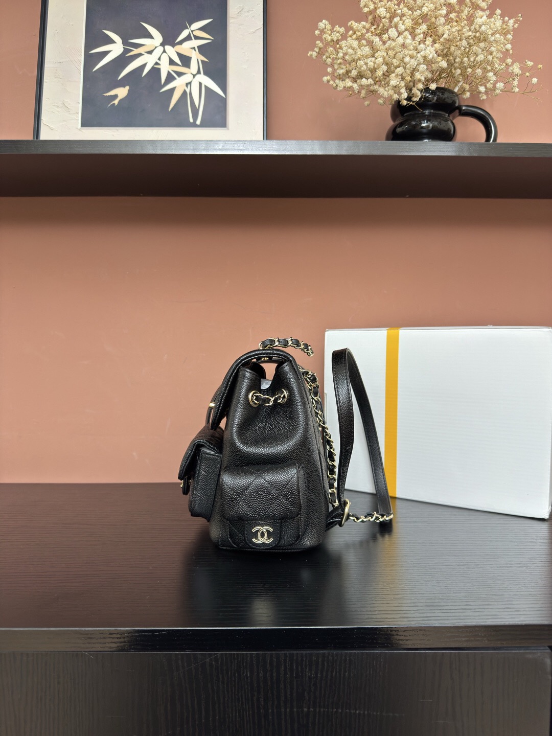 CHANEL Duma 23K diamond-patterned leather chain shoulder bag, granular cowhide material, gold metal backpack, unisex couple style