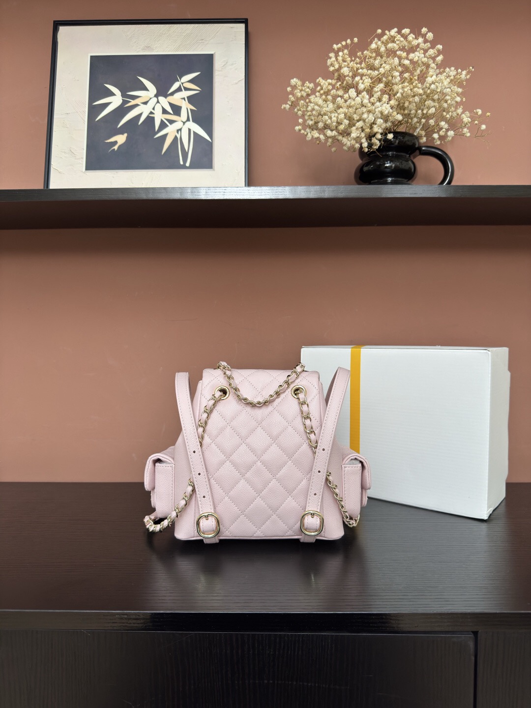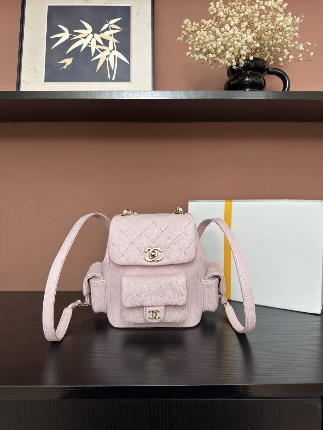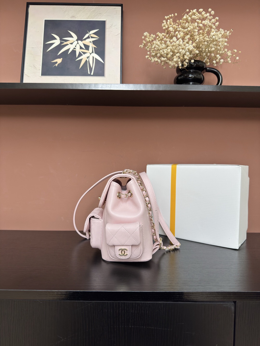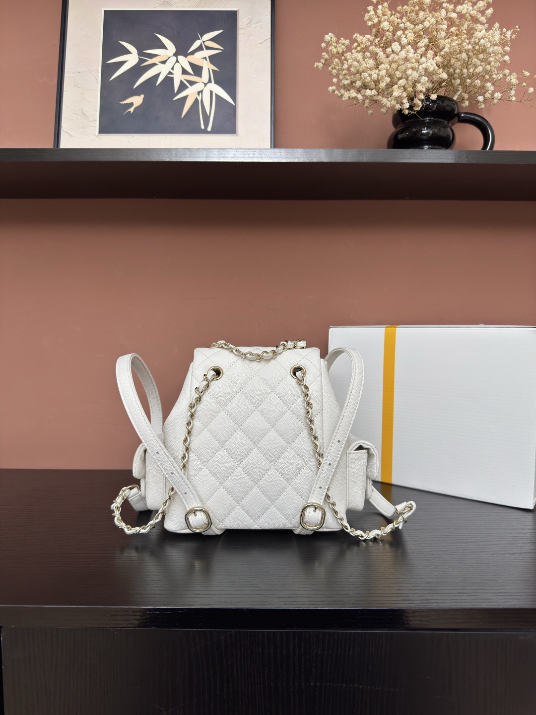 CHANEL Duma 23K diamond-patterned leather chain shoulder bag, granular cowhide material, gold metal backpack, unisex couple style