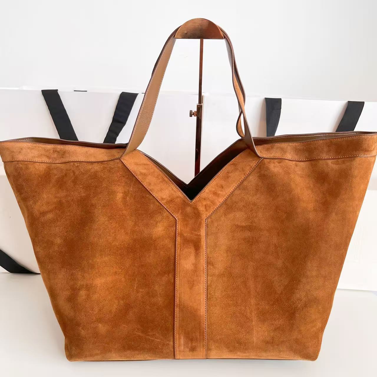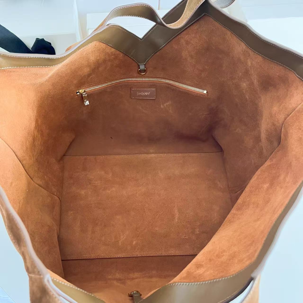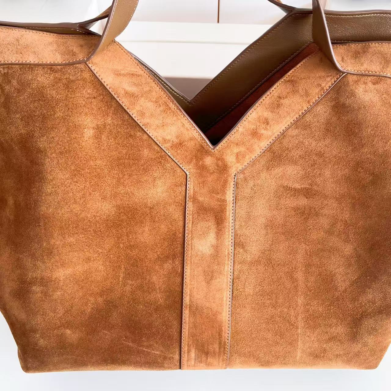 SAINT LAURENT solid color suede, Y logo stitching, bronze trim, Tote bag, shopping bag, handbag, large size for women, deep caramel cognac color
