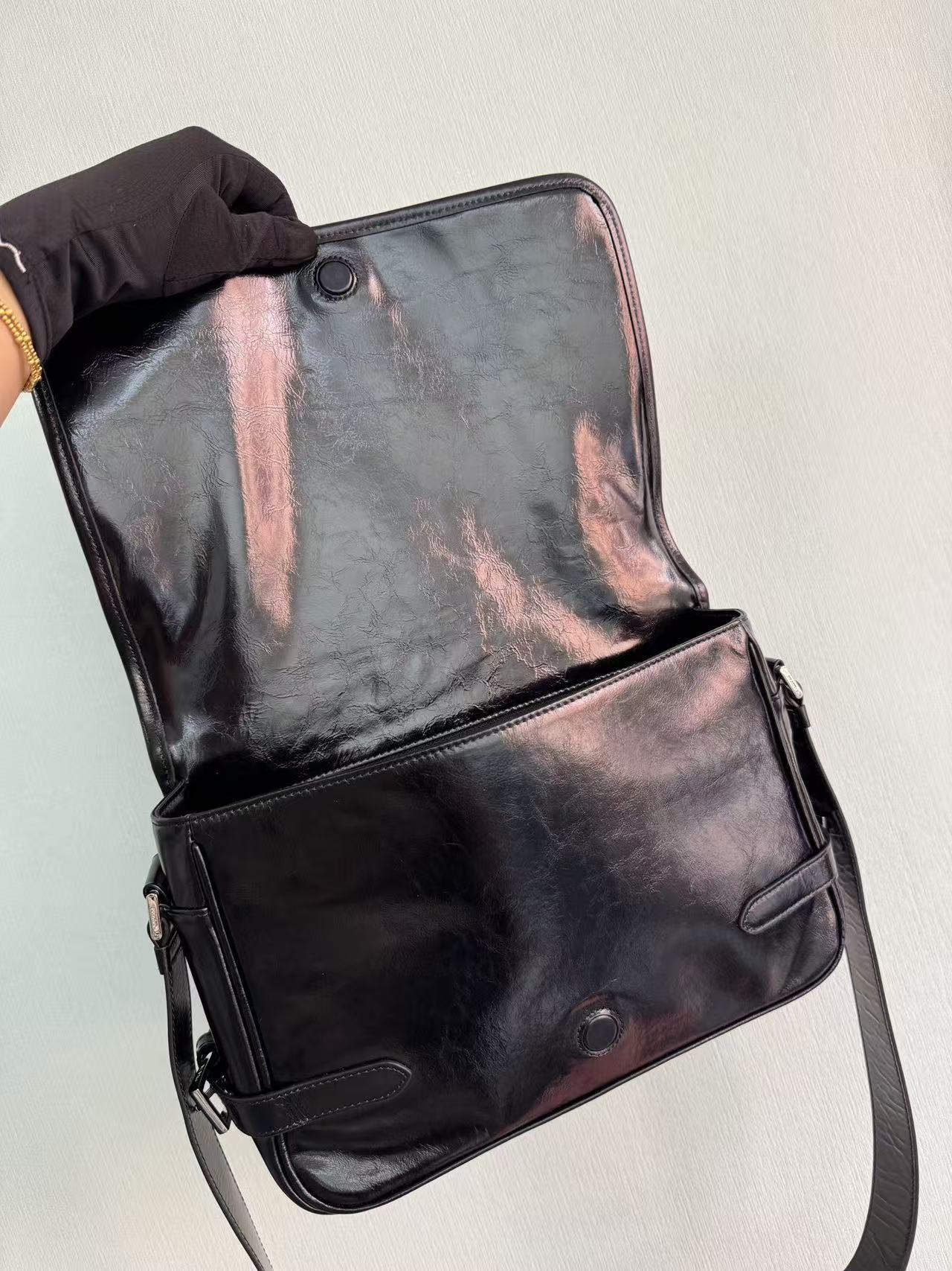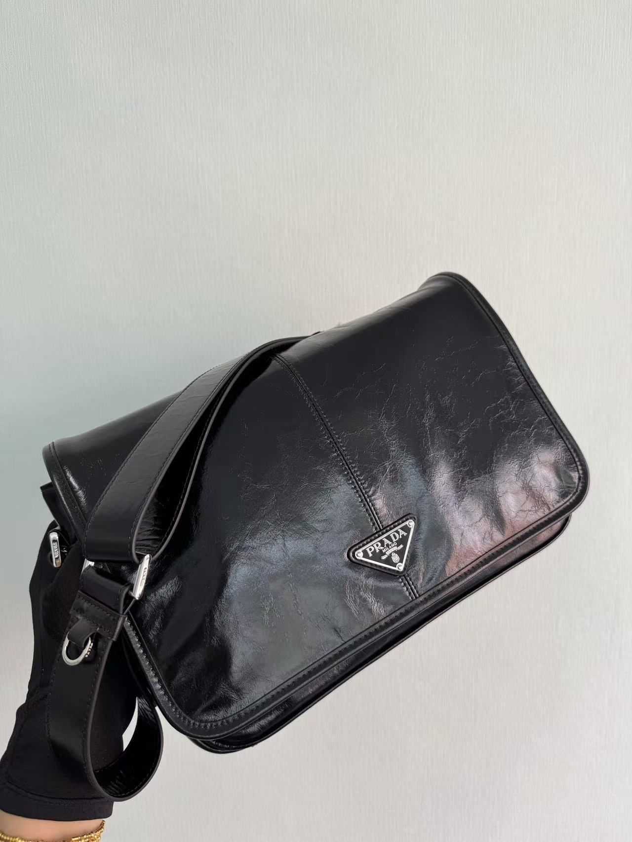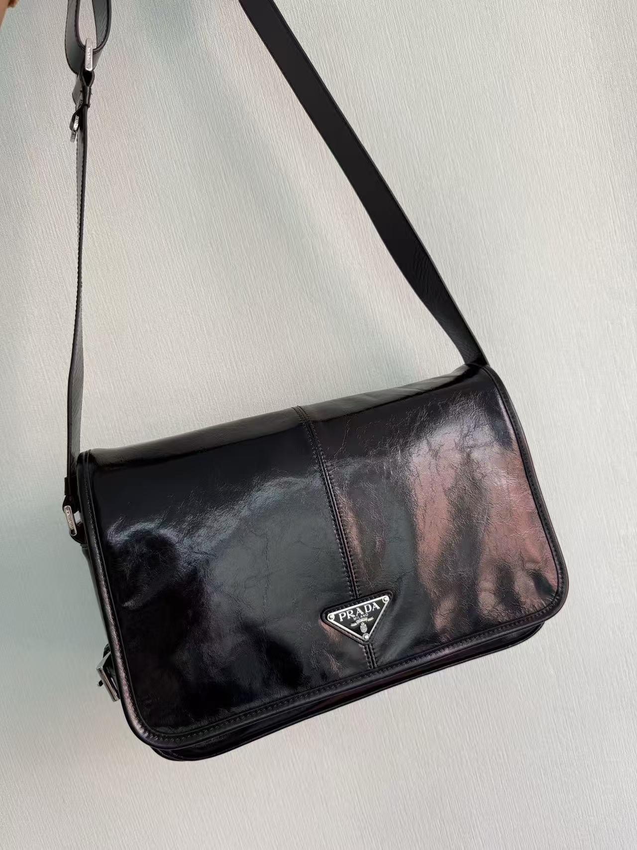 PRADA enamel metal triangular logo magnetic clasp opening and closing crossbody single-shoulder bag, regular men\'s black style