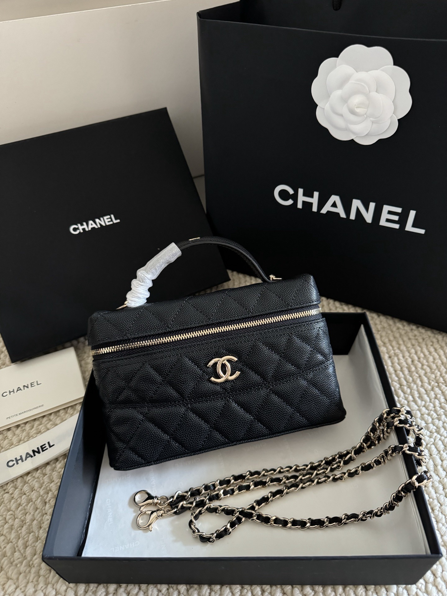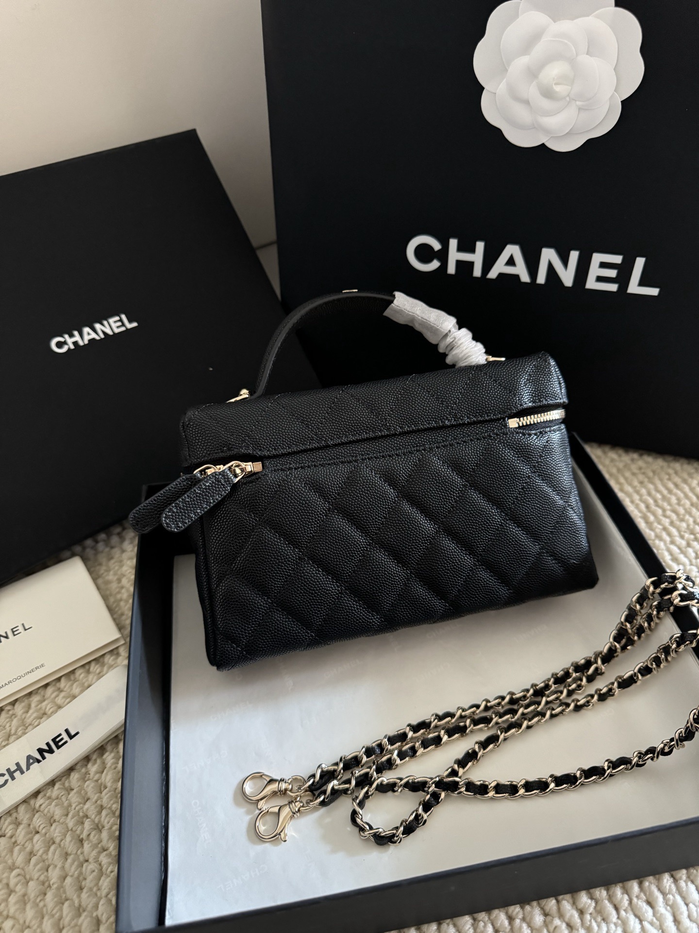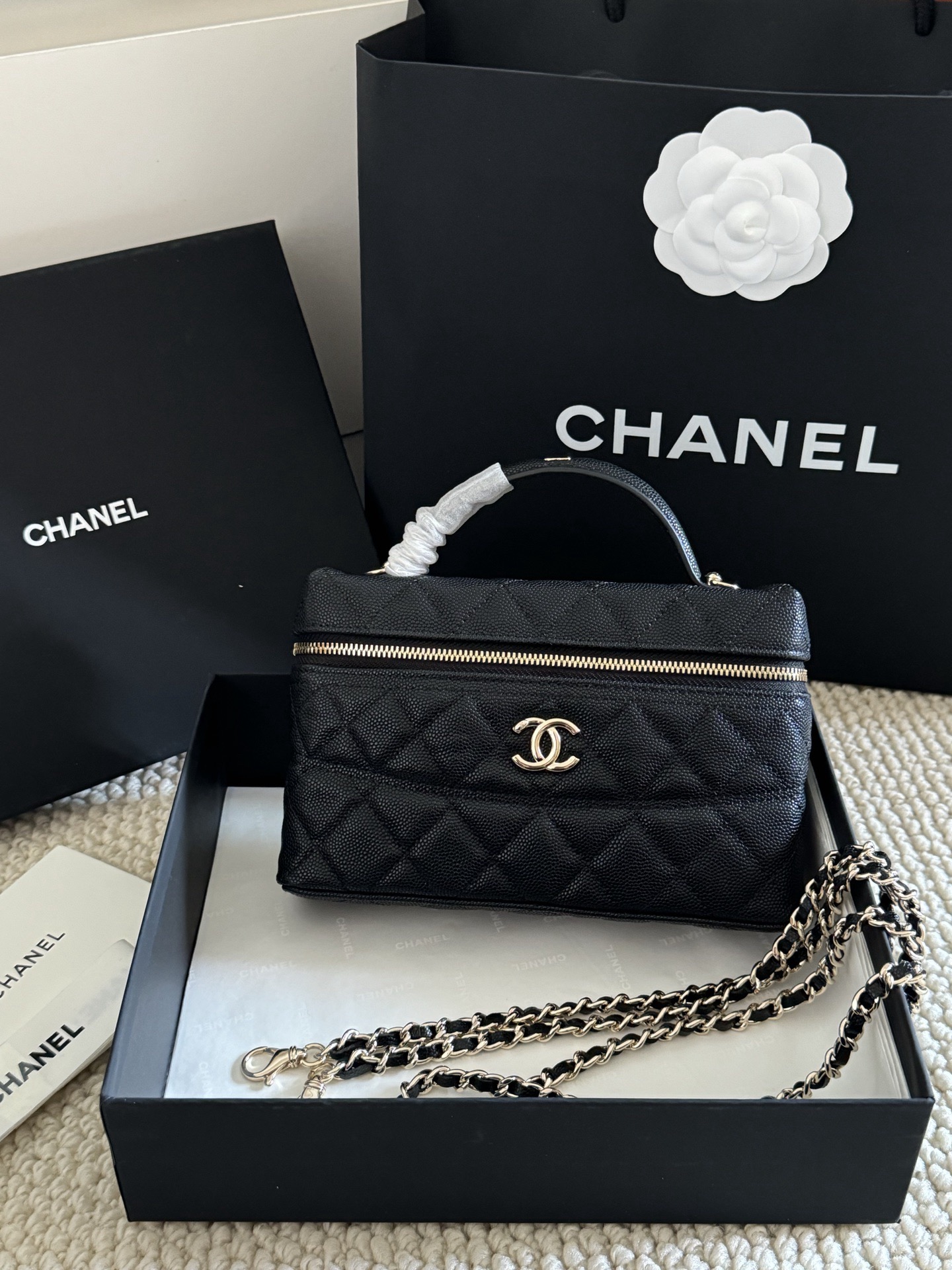 CHANEL 26C Gold buckle diamond-shaped checkered quilted double C lock leather chain cosmetic bag, grain cowhide material, gold metal crossbody handbag, black