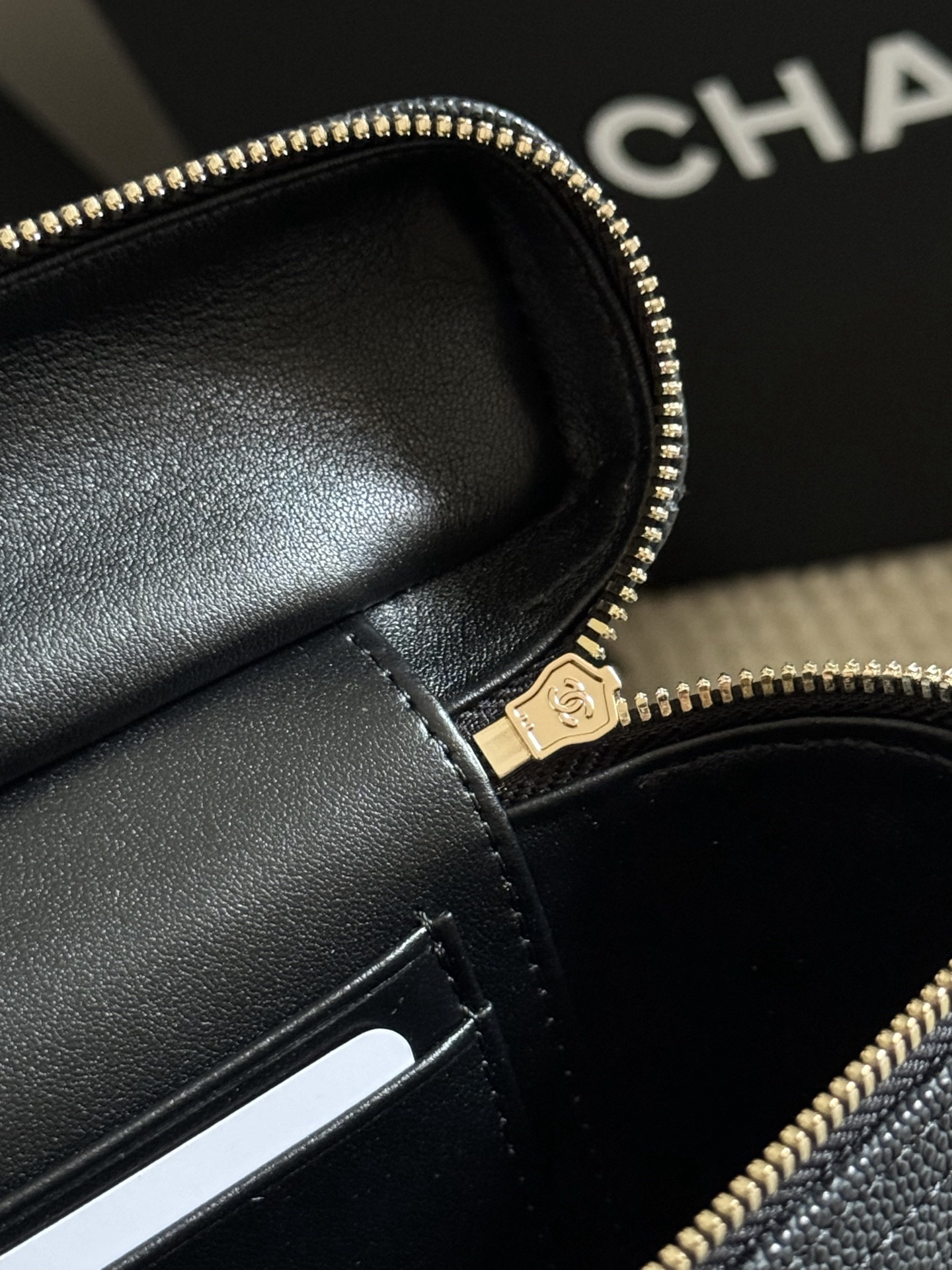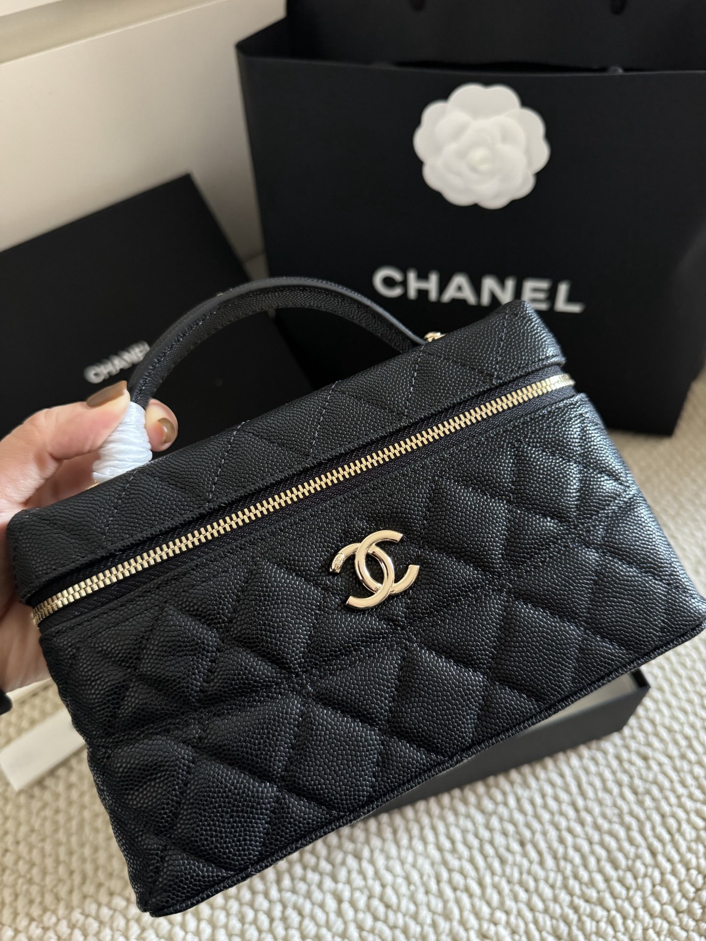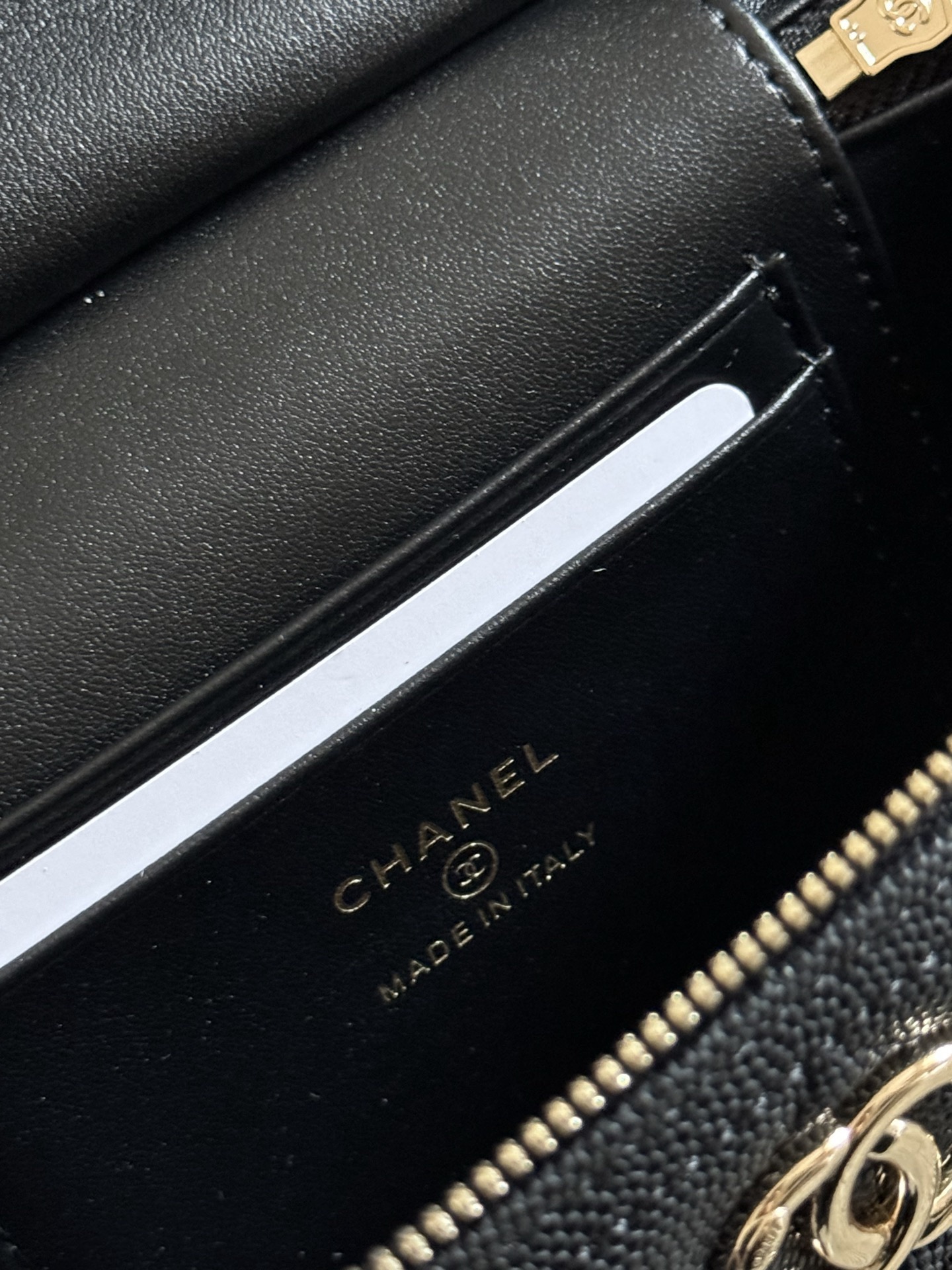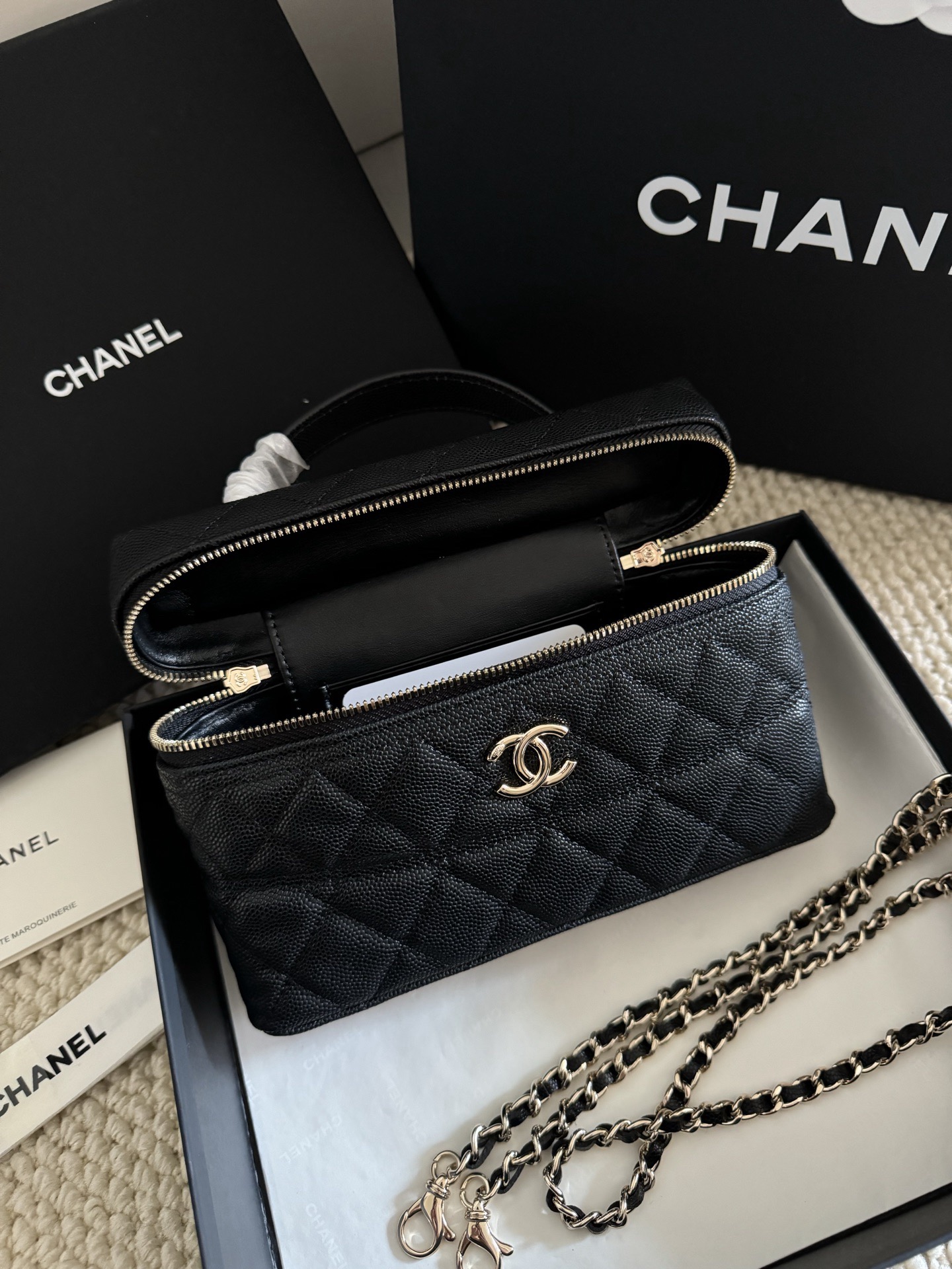 CHANEL 26C Gold buckle diamond-shaped checkered quilted double C lock leather chain cosmetic bag, grain cowhide material, gold metal crossbody handbag, black