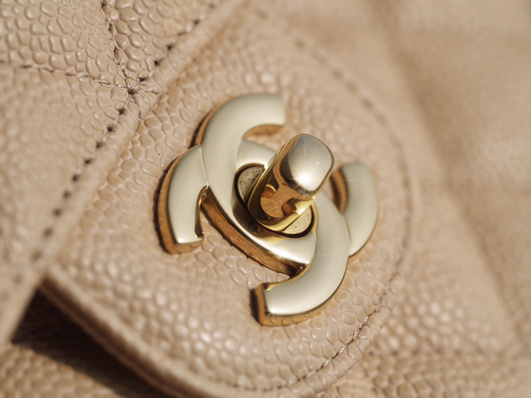 CHANEL Classic Flap CF chain leather interlocking diamond grainy calfskin crossbody shoulder bag medium size apricot color