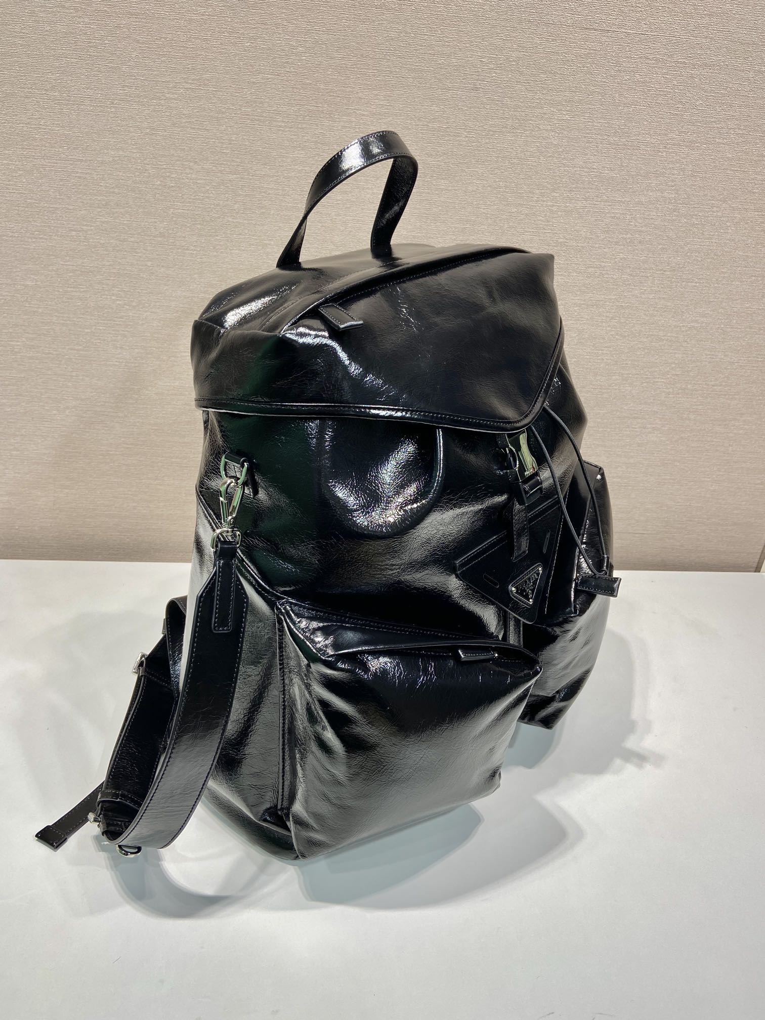 PRADA Enamel metal triangular logo drawstring flip-top backpack for men, black