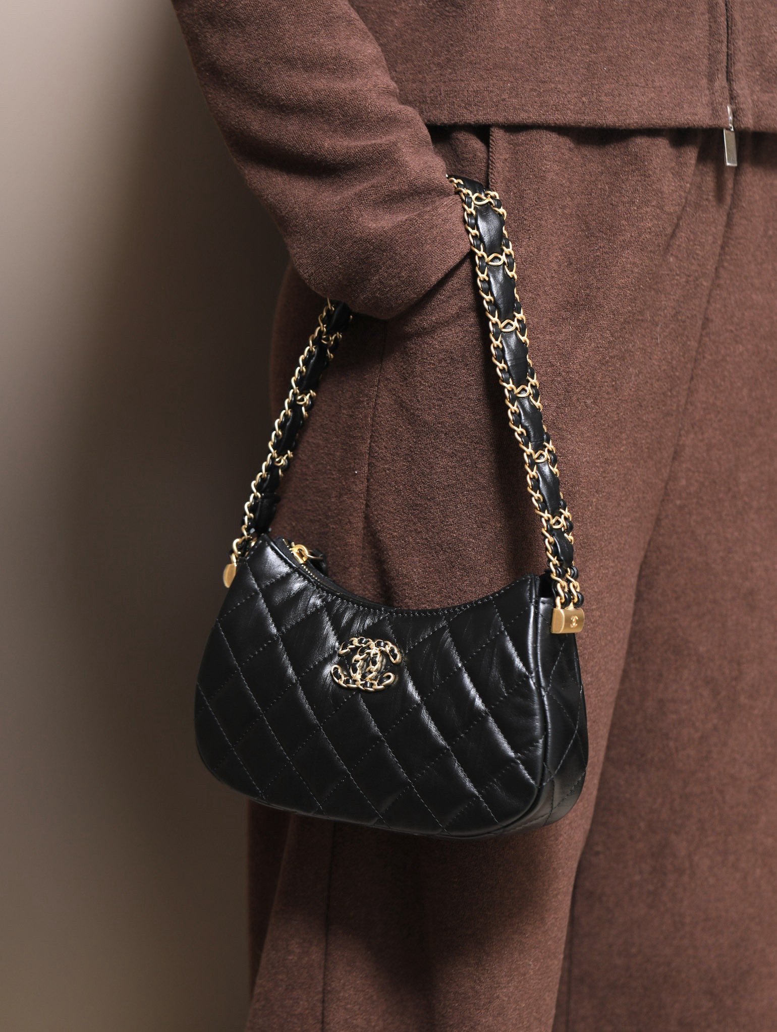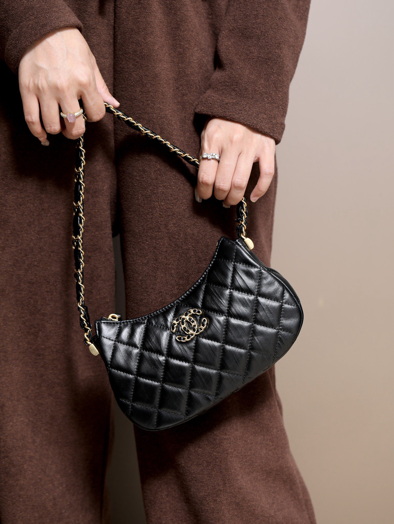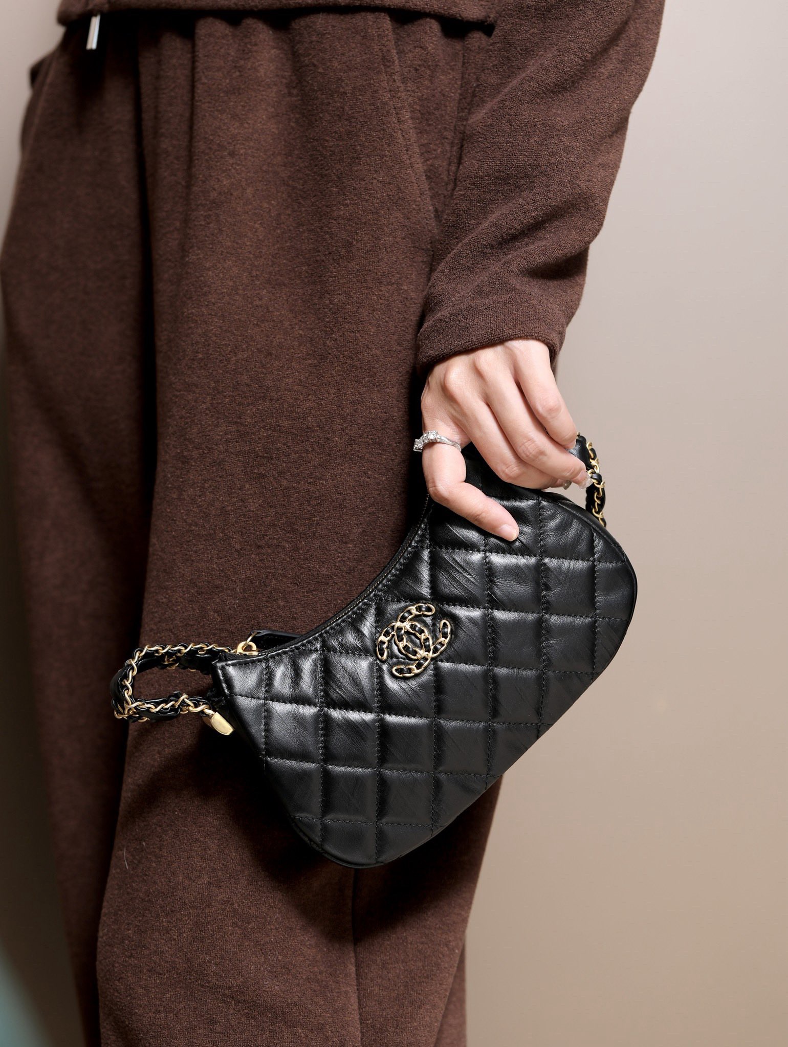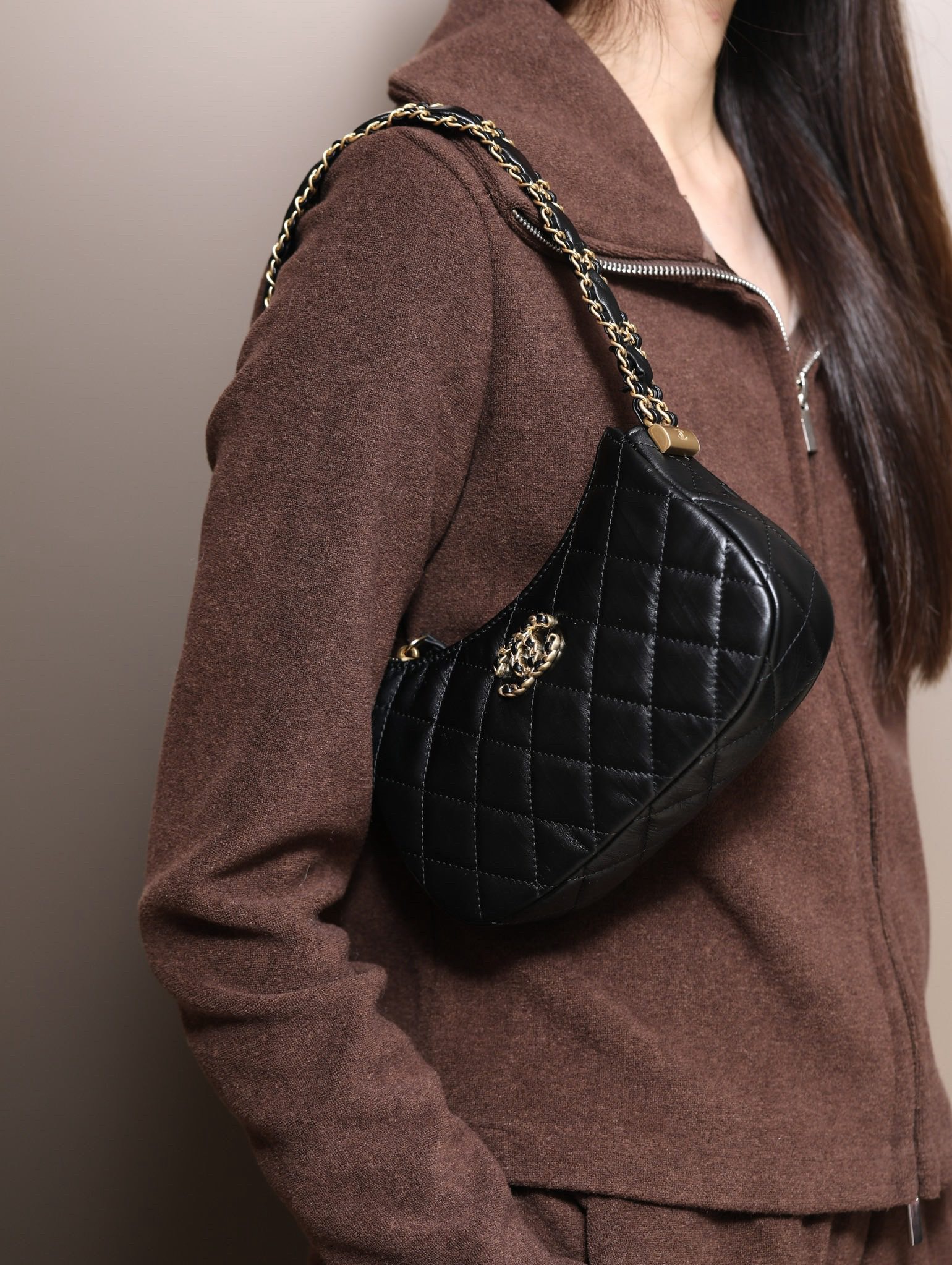 CHANEL 23K double C leather, chain diamond-shaped checkered underarm bag, Hobo, hand and shoulder bag, black
