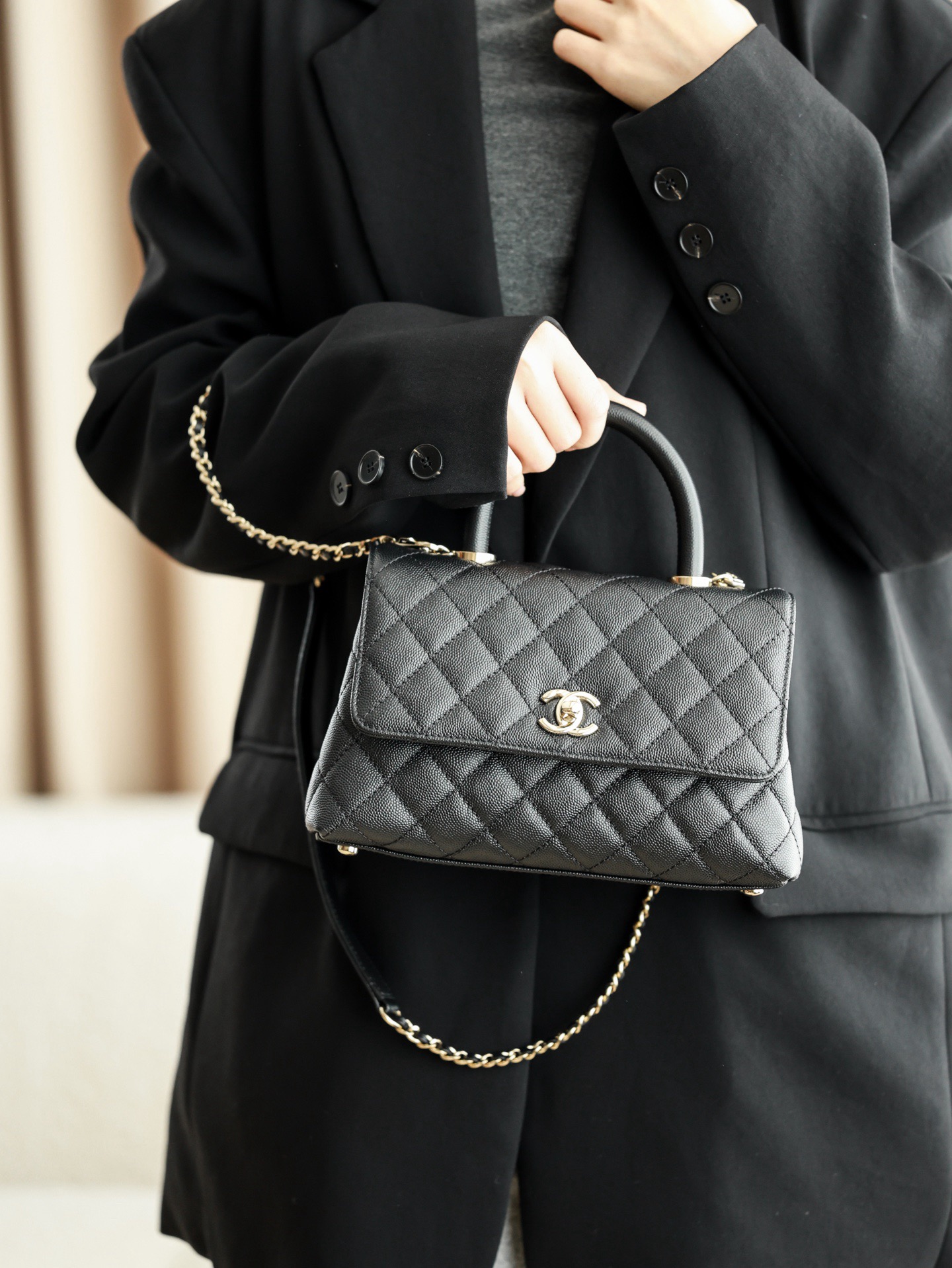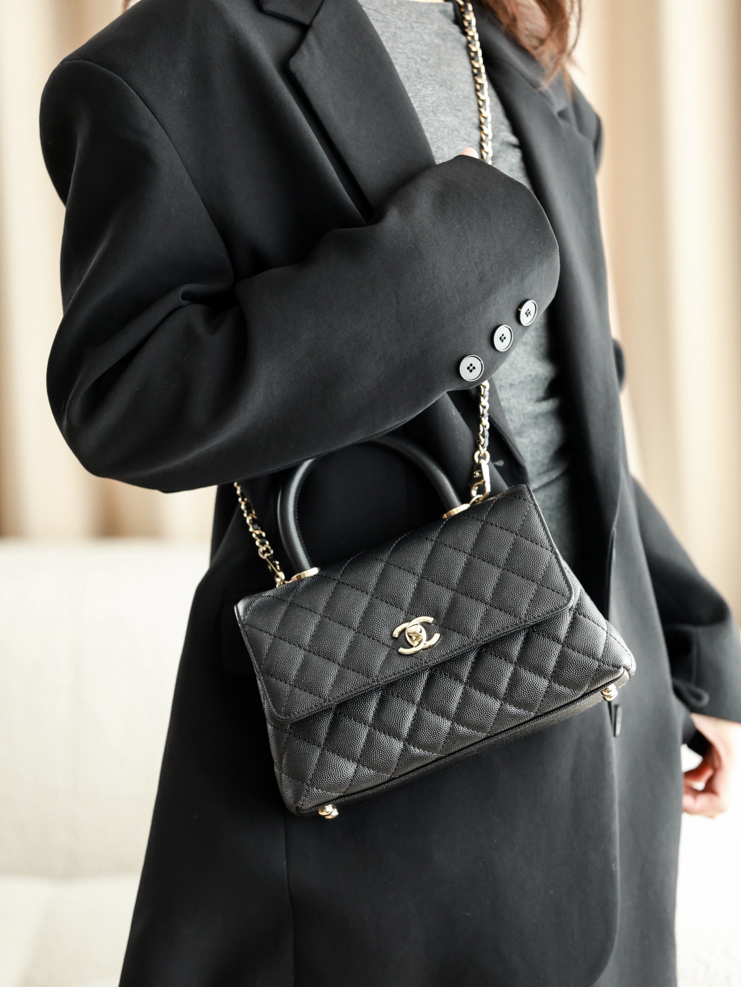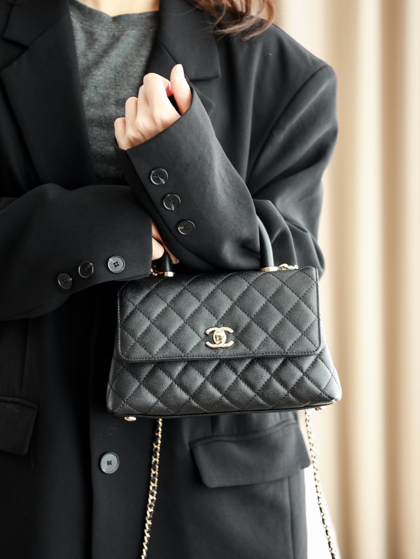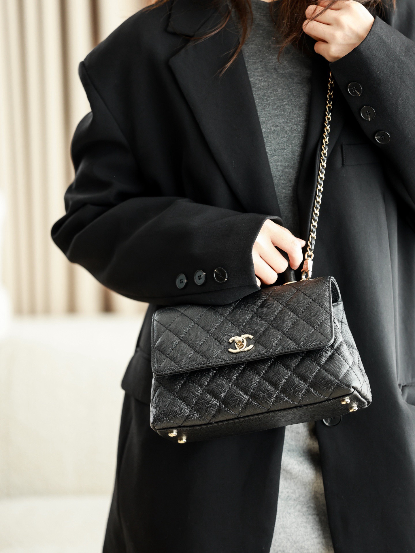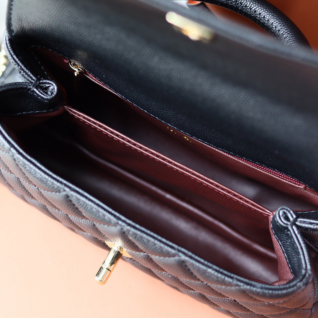 CHANEL 25P golden label grain embossed calfskin single-shoulder bag, crossbody bag, black handbag