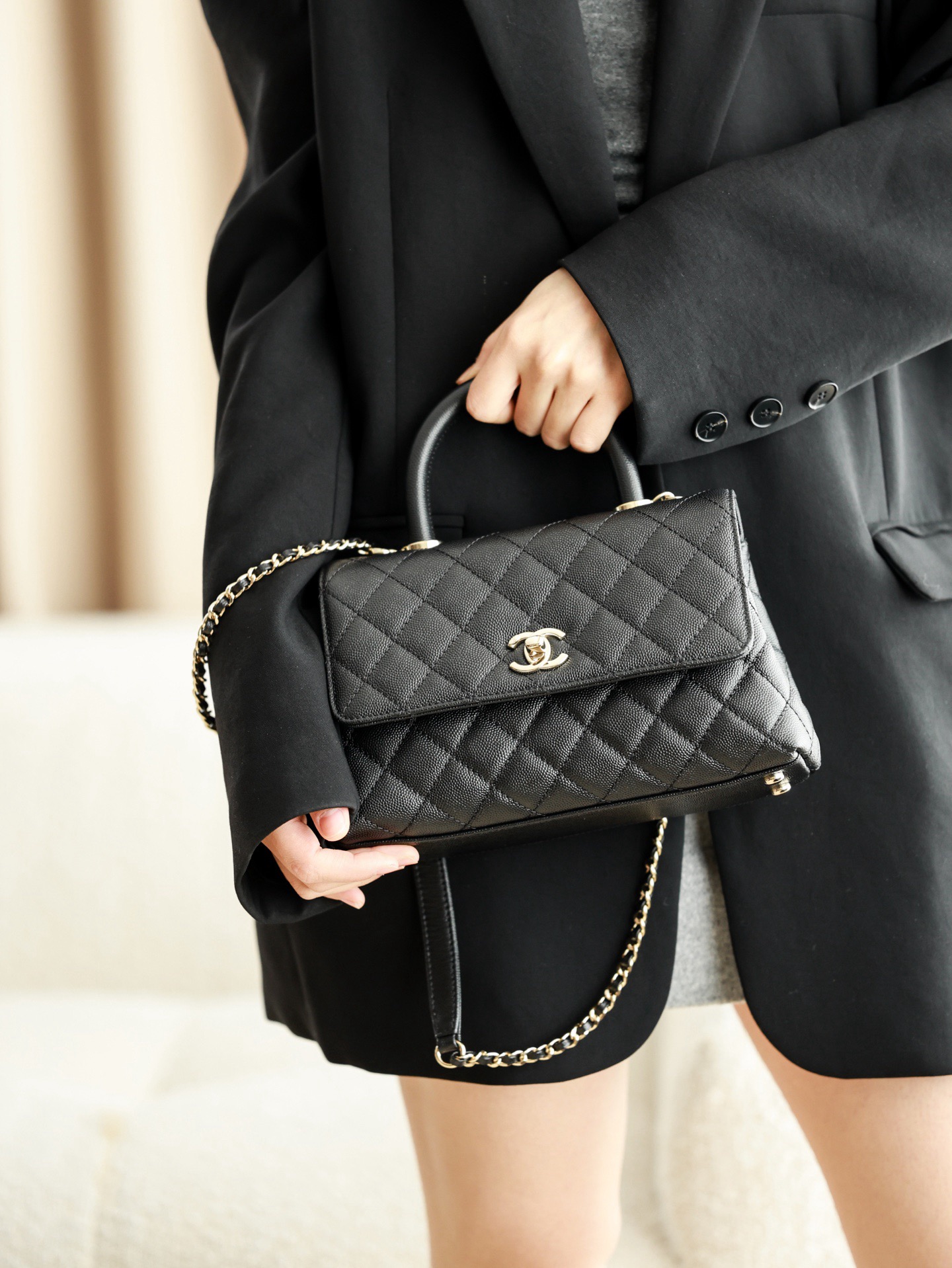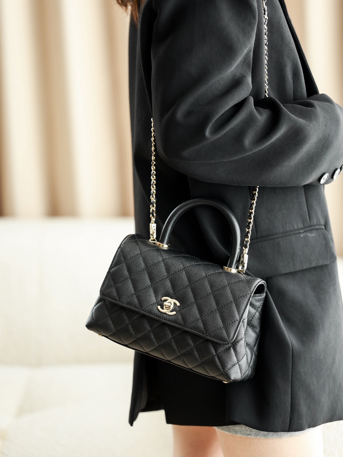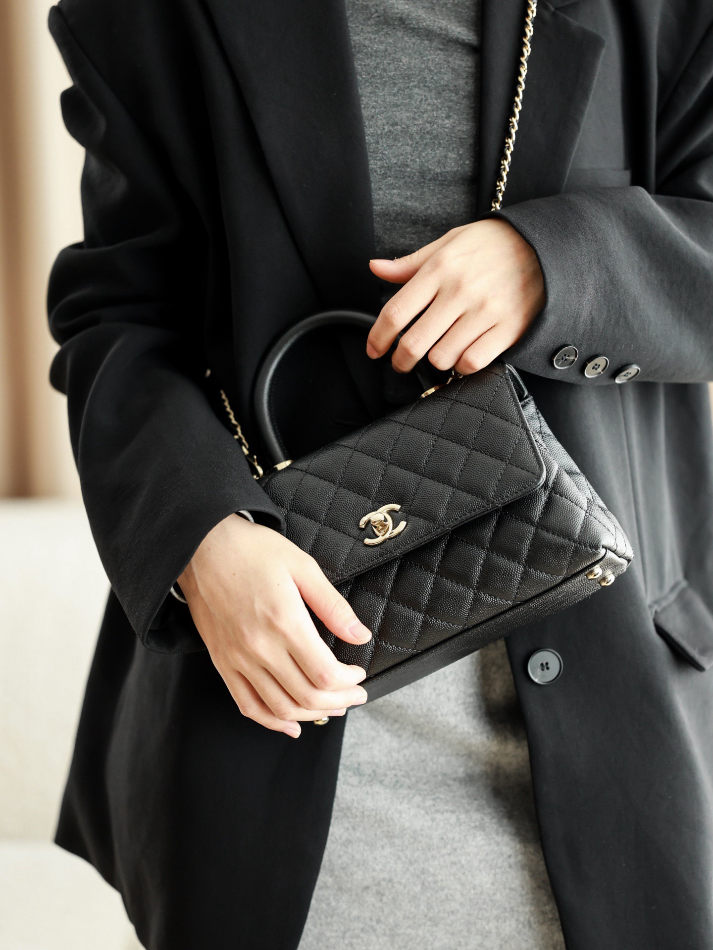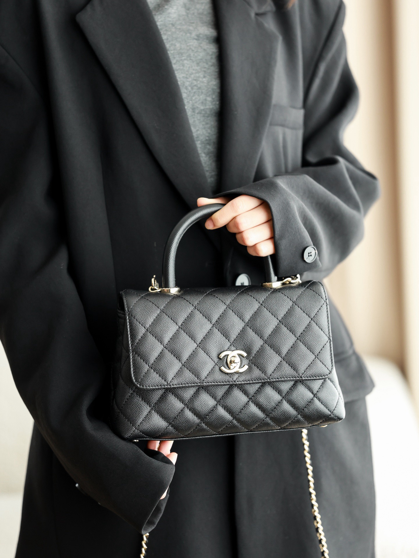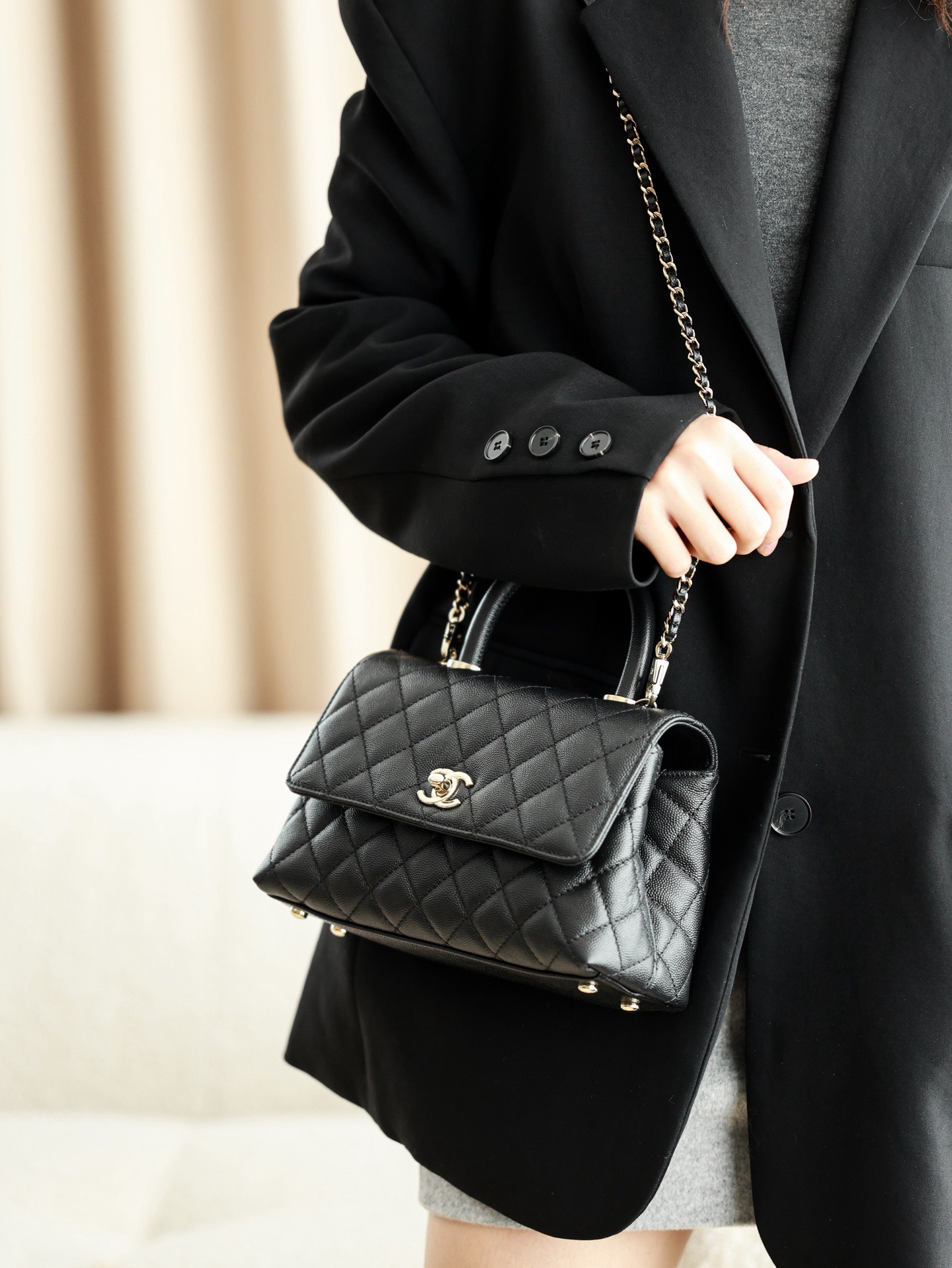 CHANEL 25P golden label grain embossed calfskin single-shoulder bag, crossbody bag, black handbag