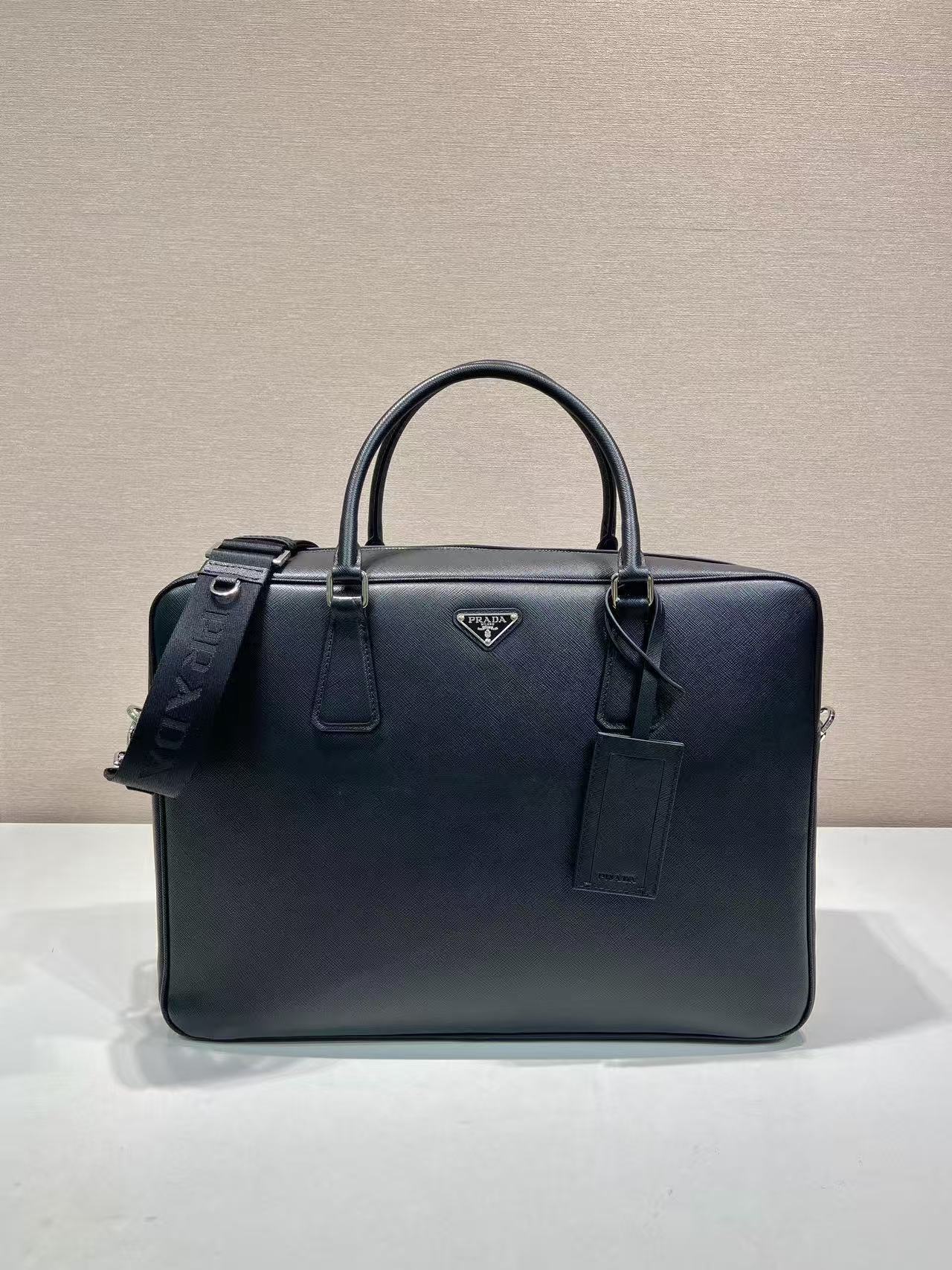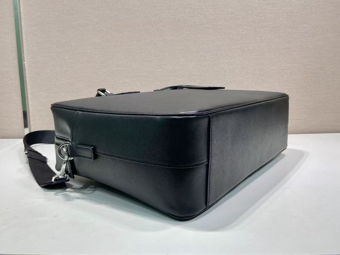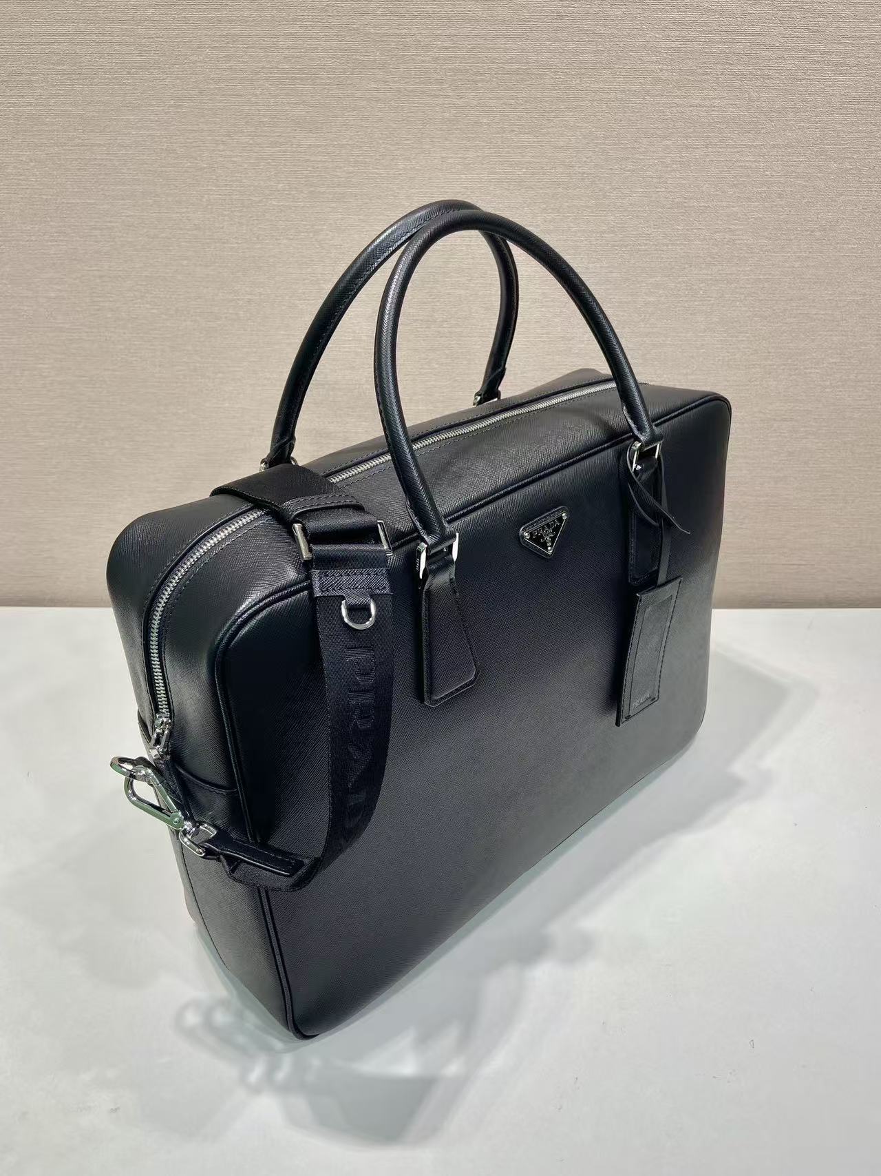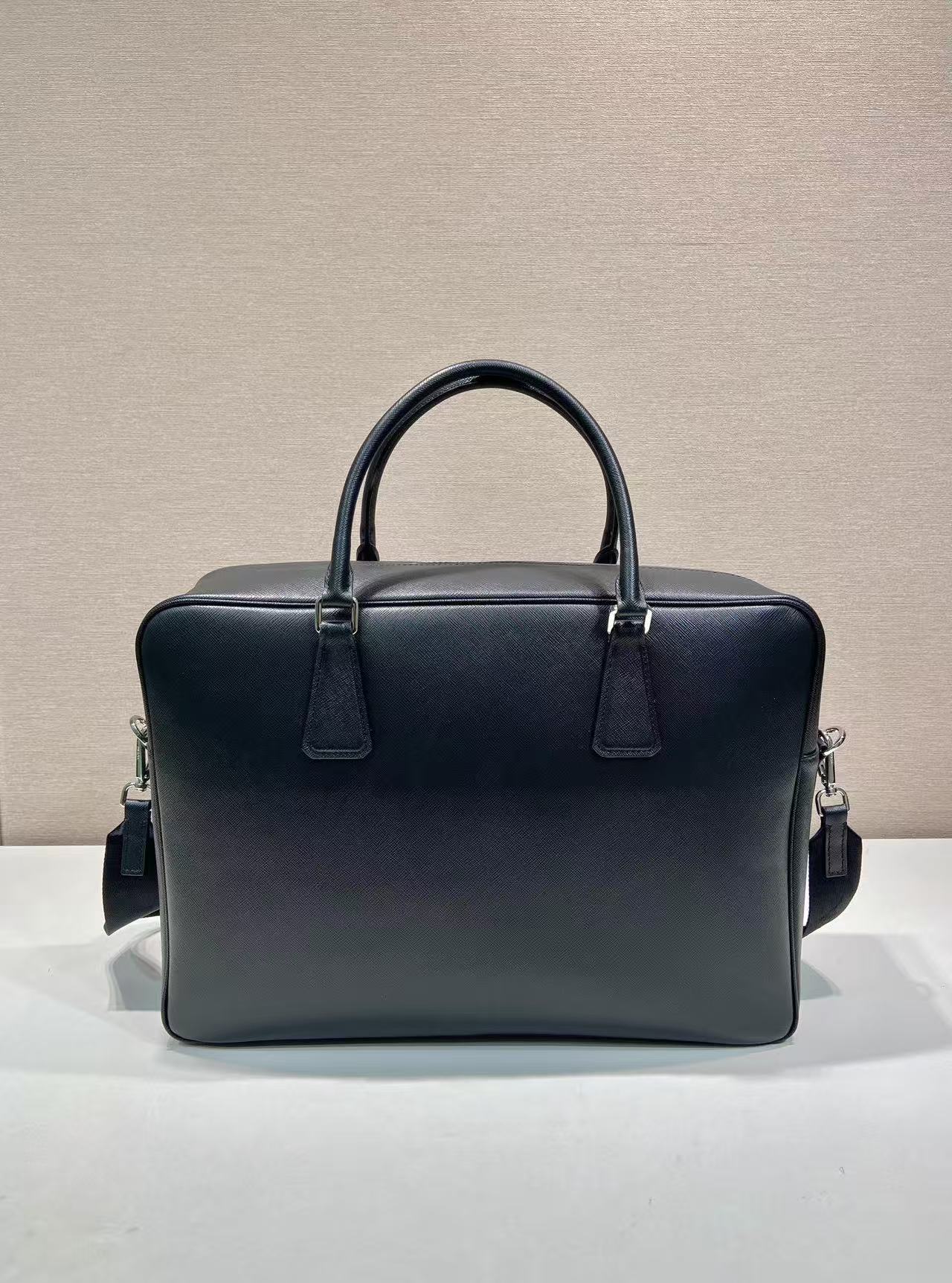 PRADA Saffiano enamel metal triangular logo zipper opening and closing hand shoulder crossbody bag briefcase Men\'s black style