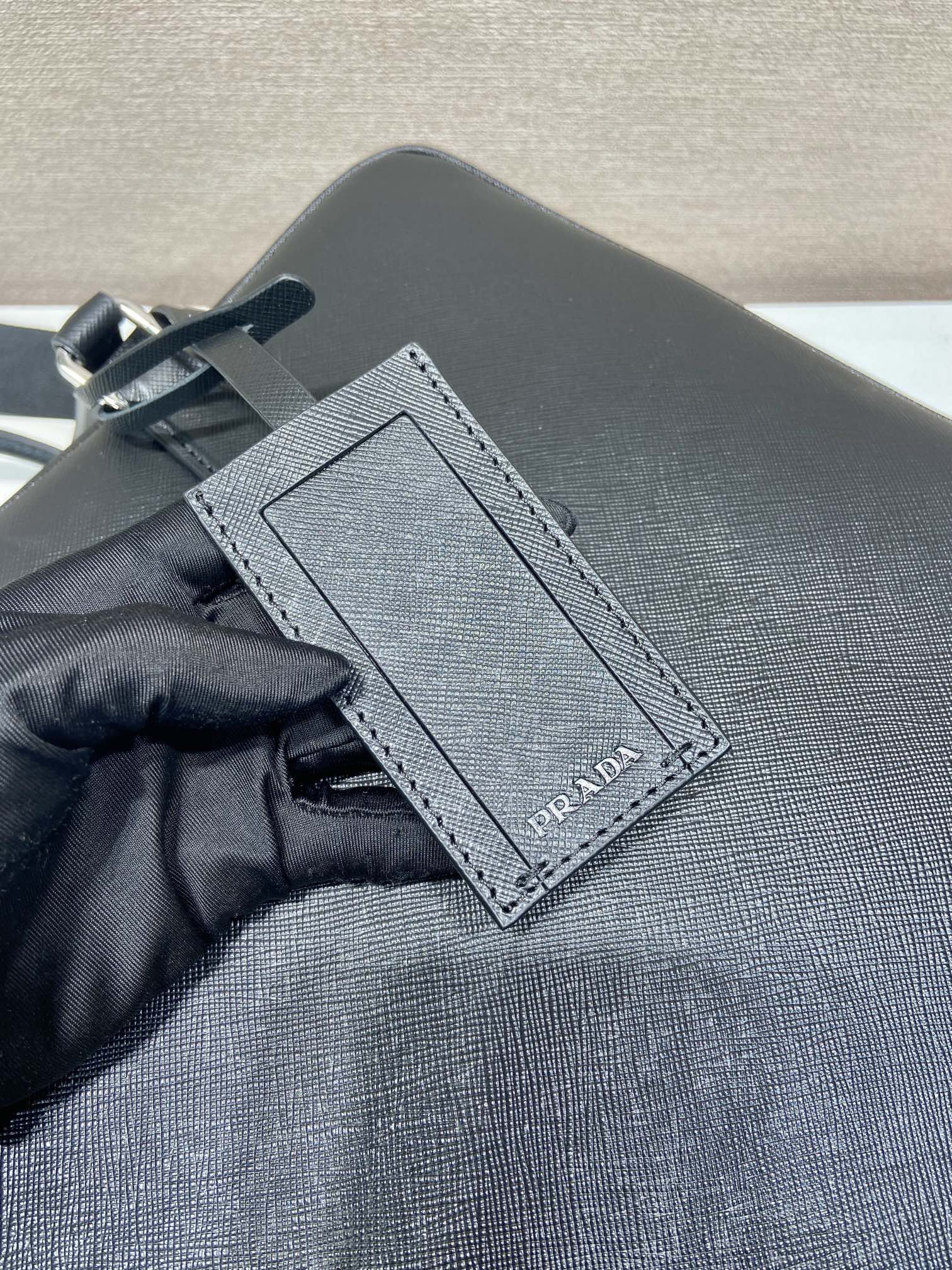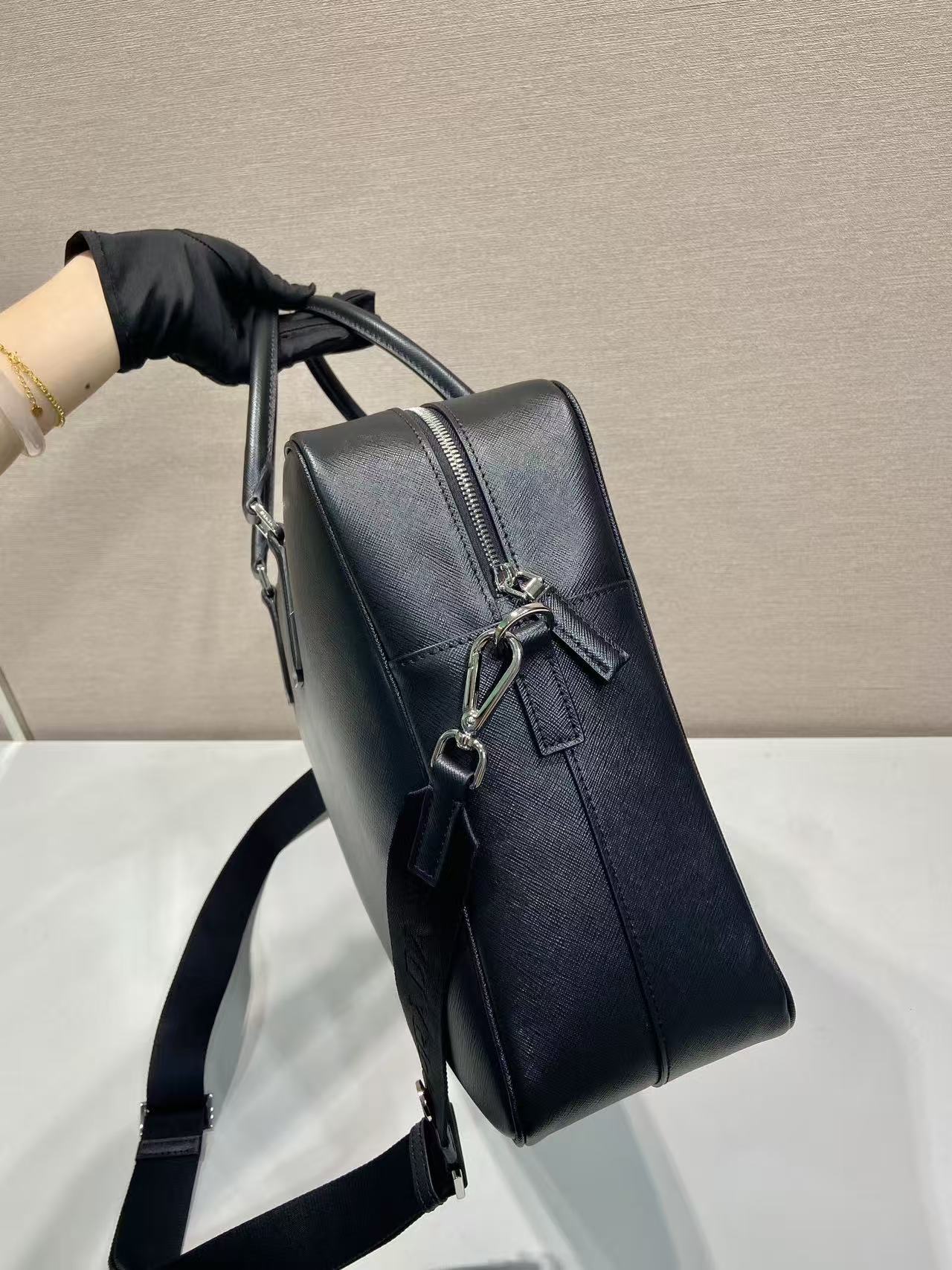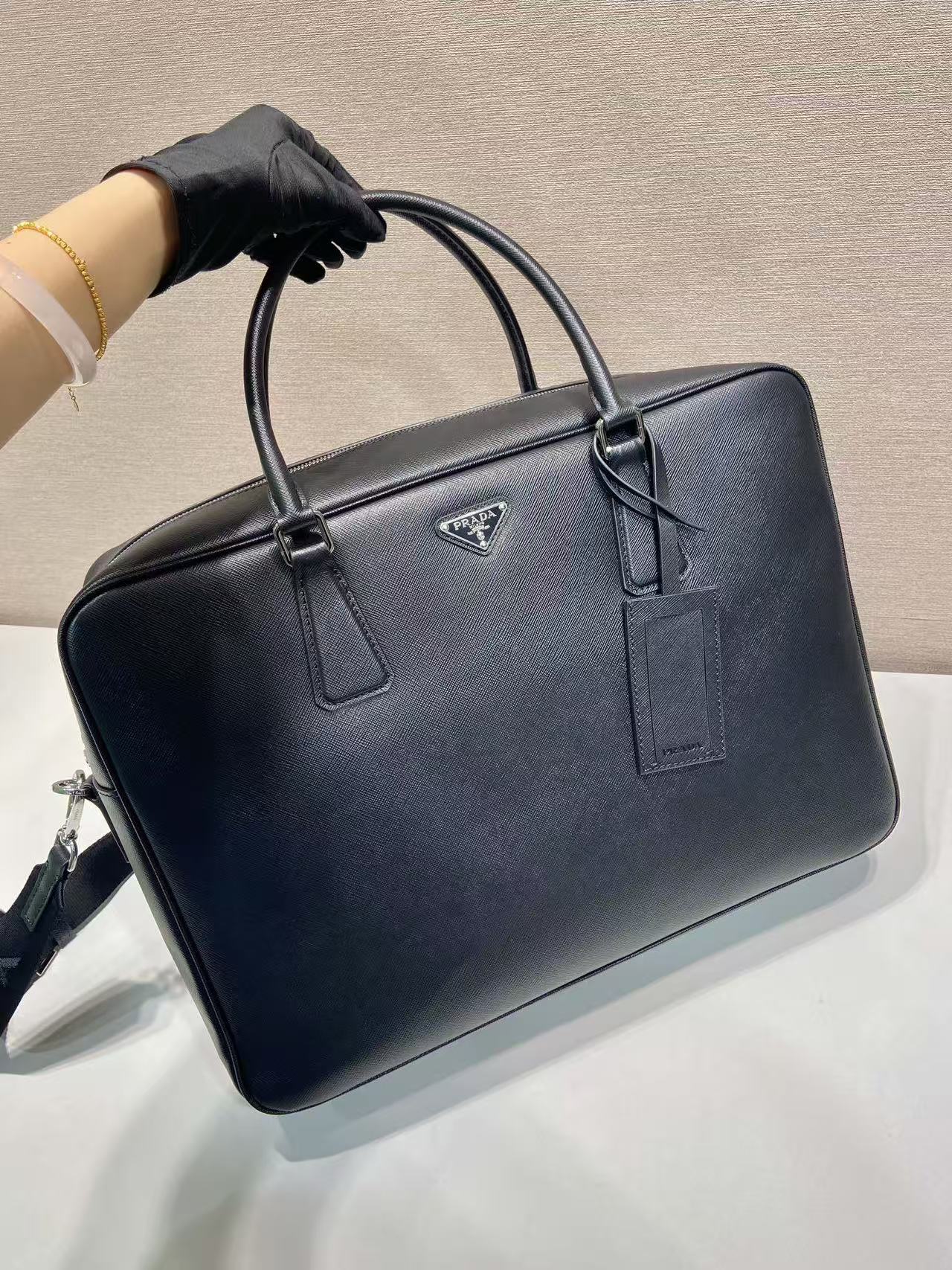 PRADA Saffiano enamel metal triangular logo zipper opening and closing hand shoulder crossbody bag briefcase Men\'s black style