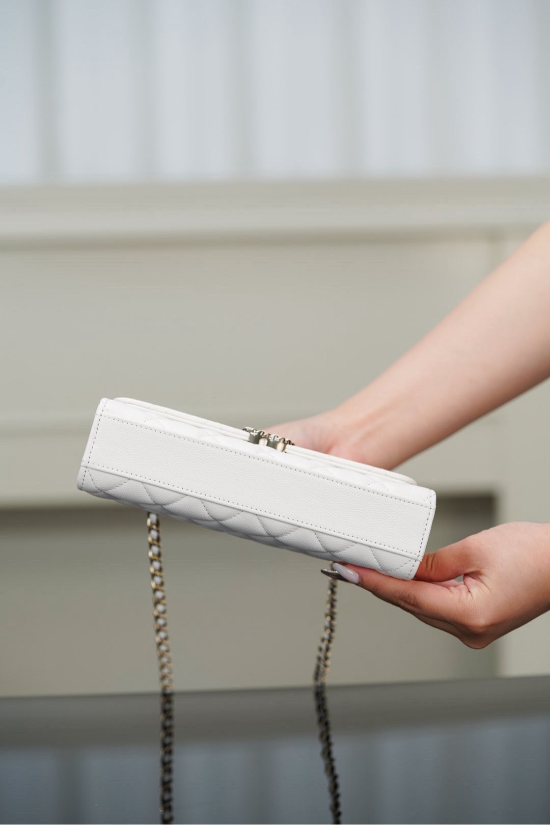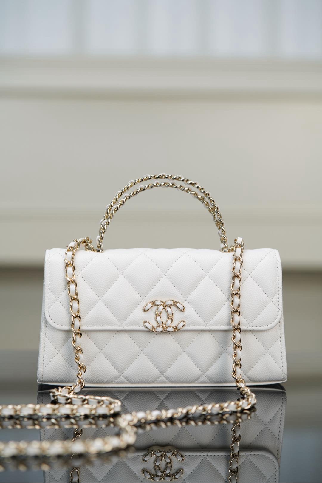 CHANEL 23P diamond-shaped checkered leather chain handle, granular gold metal mouth cover bag, single-shoulder crossbody handbag, white