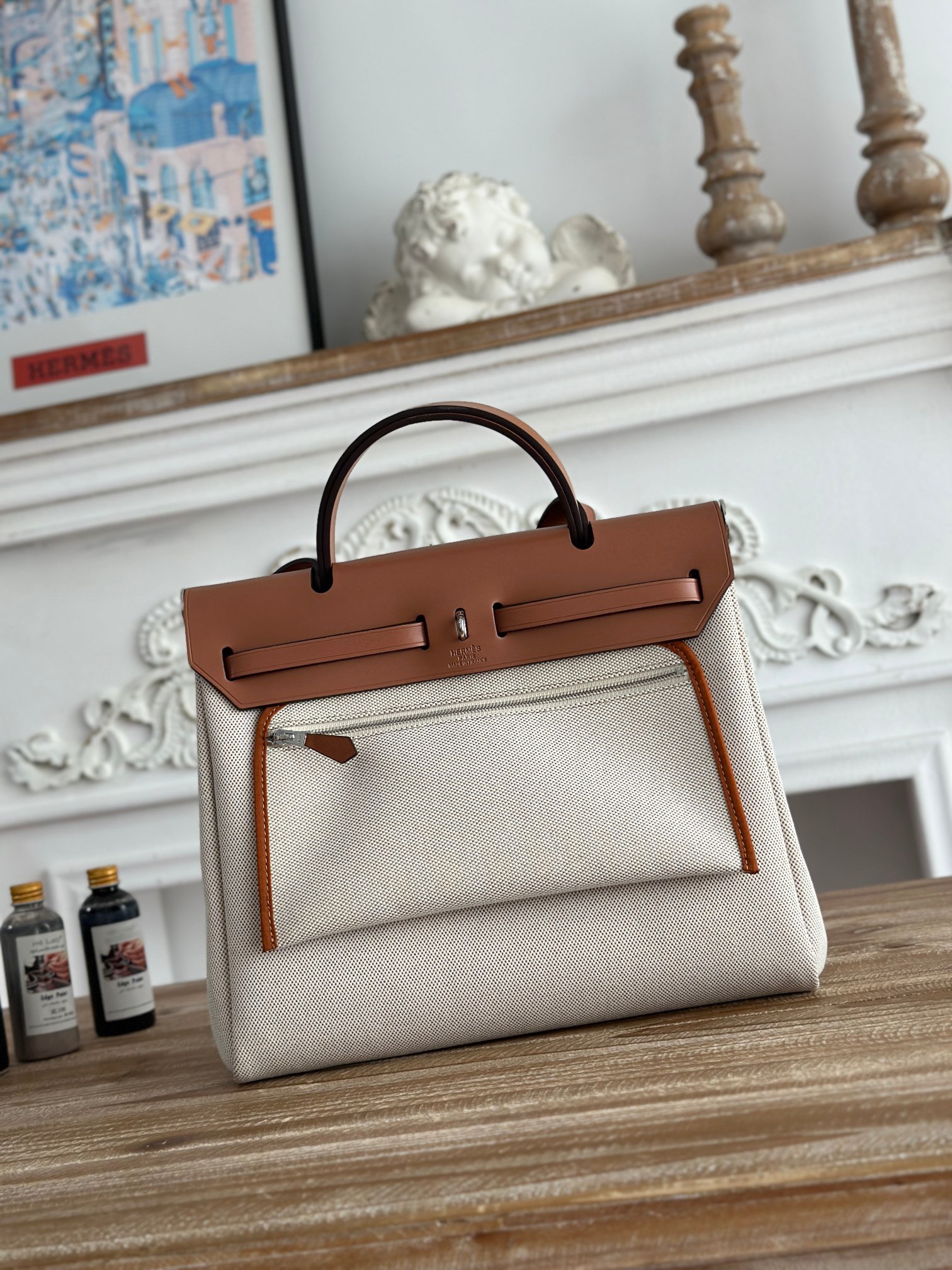 HERMES Herbag Zip 24 Gold buckle single-shoulder crossbody handbag 24 Unisex Couple style Beige