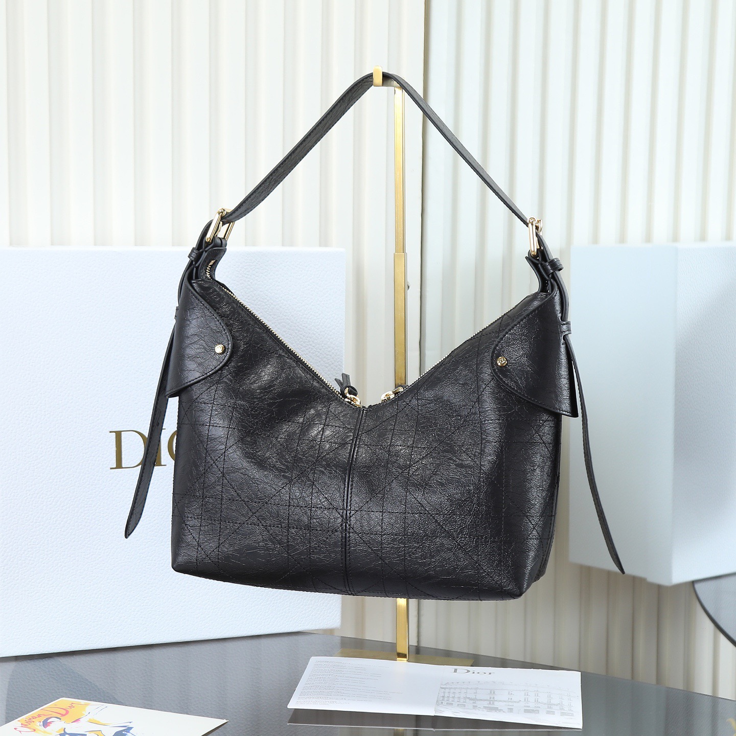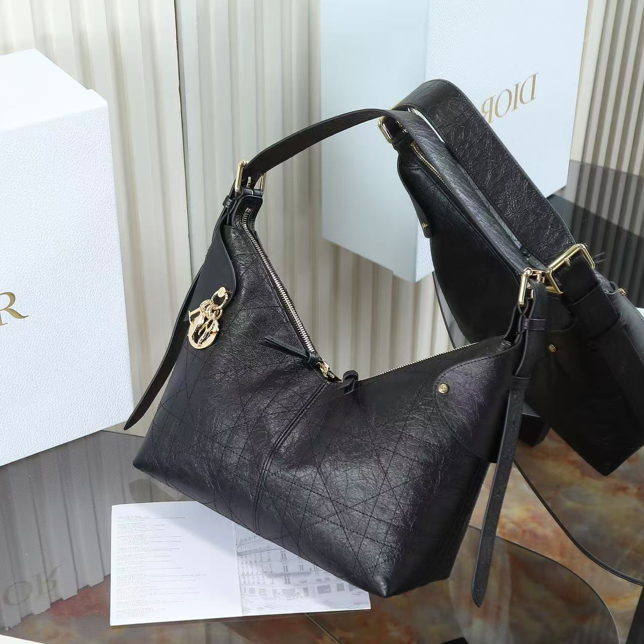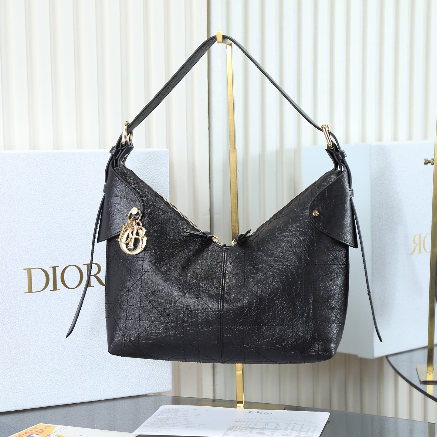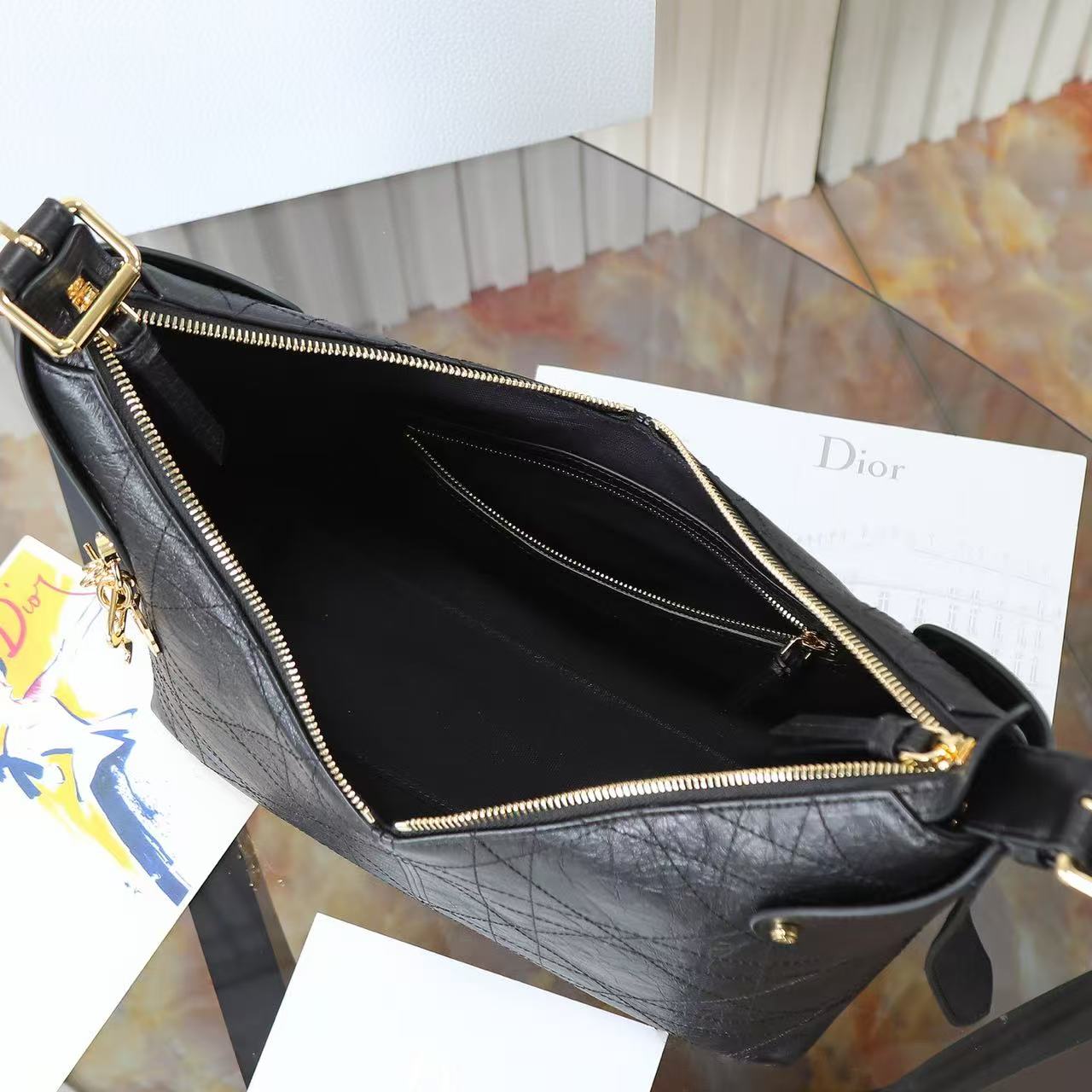 DIOR Voyage 26S retro gold finish metal pleated design single-shoulder bag medium-sized women\'s black