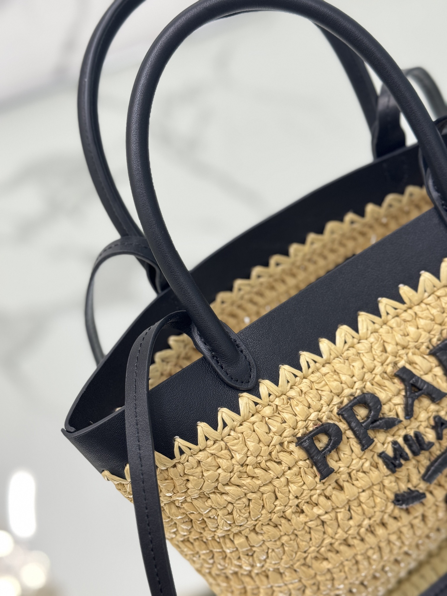 PRADA lettered, embroidered and woven single-shoulder crossbody handbag, small size for women, beige and black