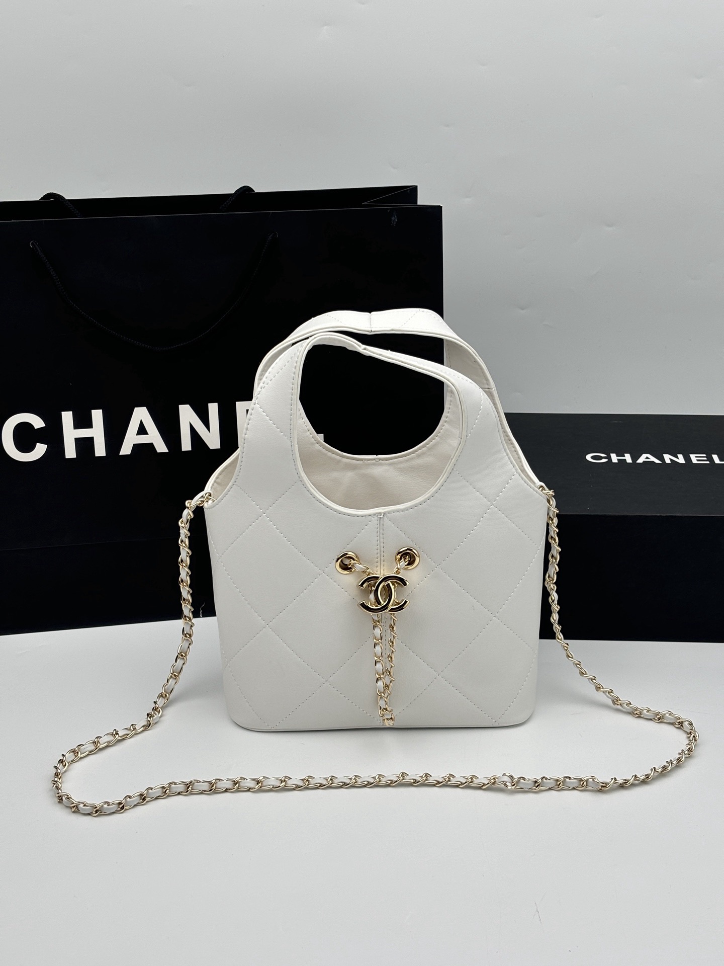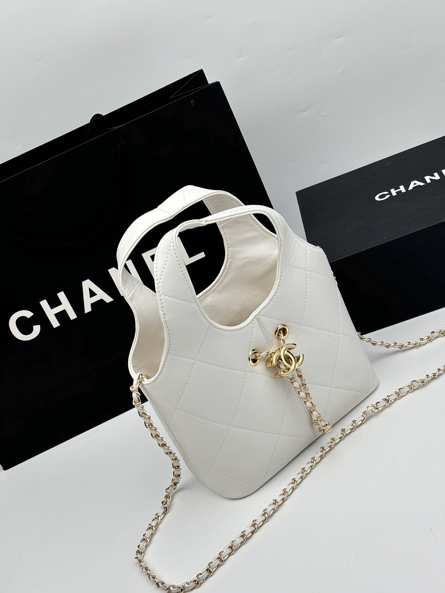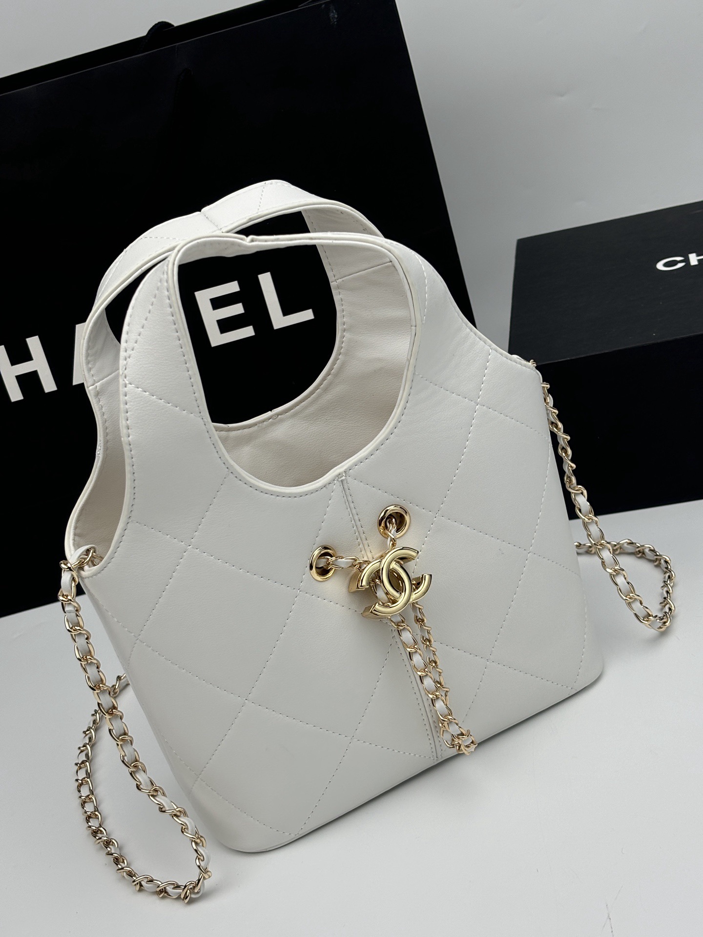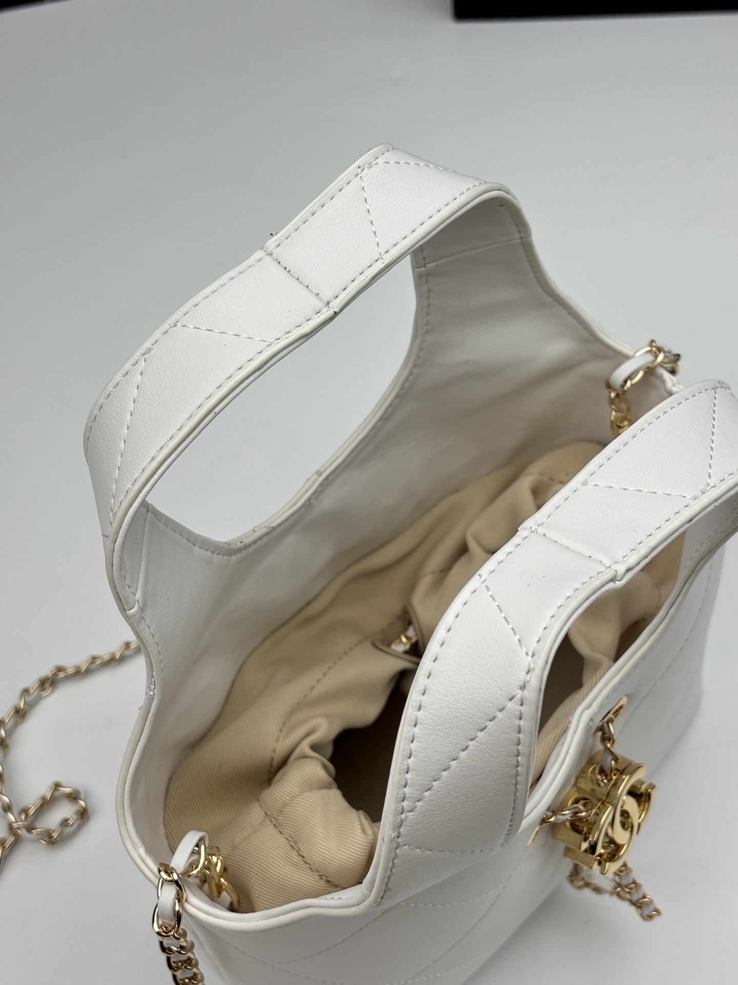 CHANEL 26P Double C Logo leather chain diamond pattern design calfskin with gold metal handbag, small size for women, white