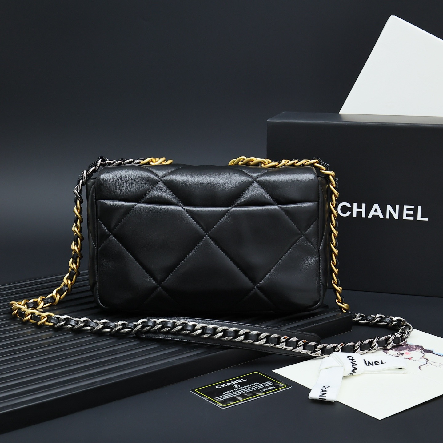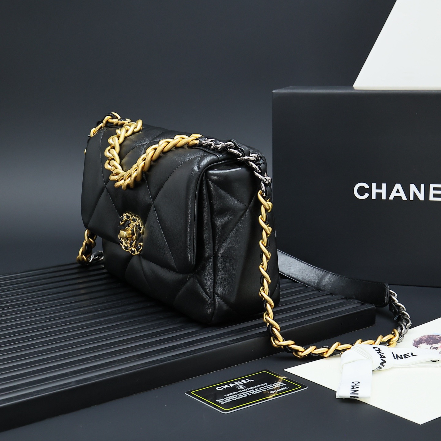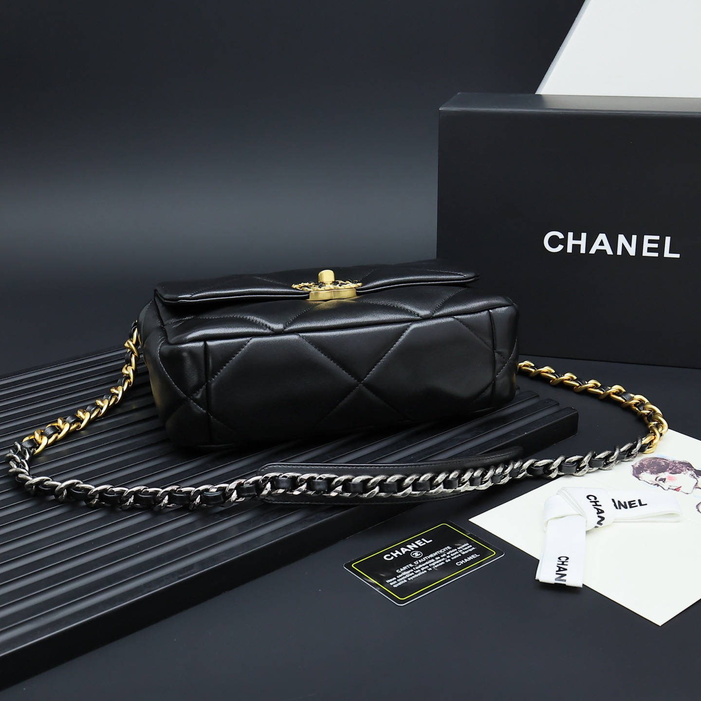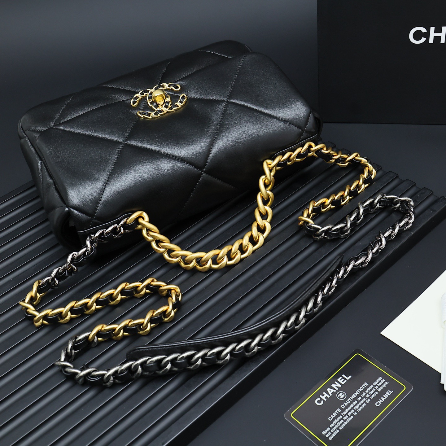 CHANEL 19Bag 21C distressed diamond-patterned leather chain shoulder bag with a lid cover, small size for women, black