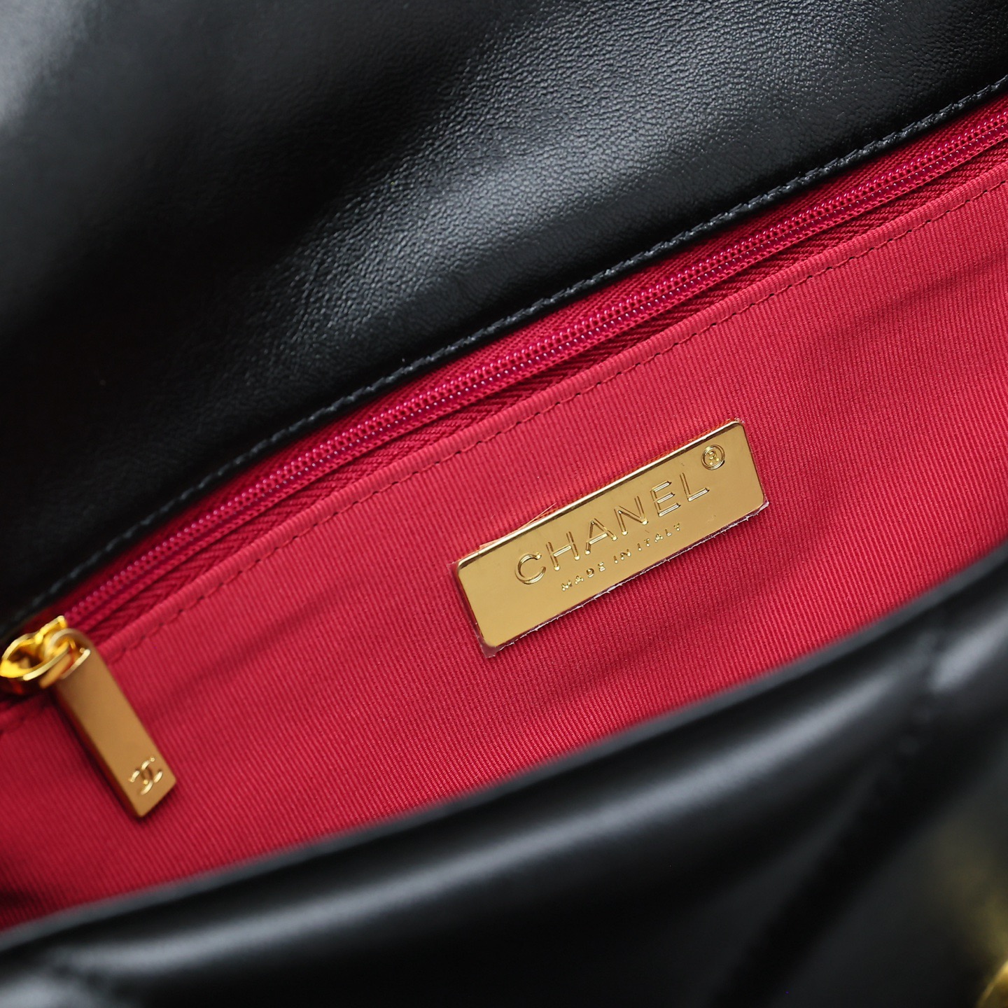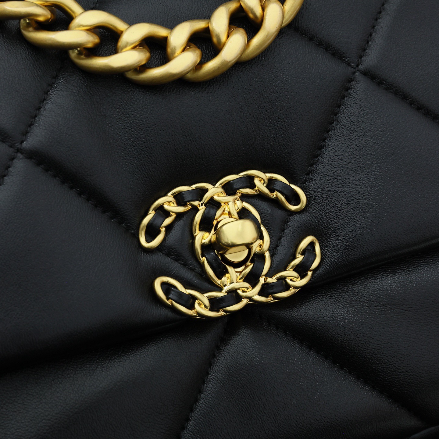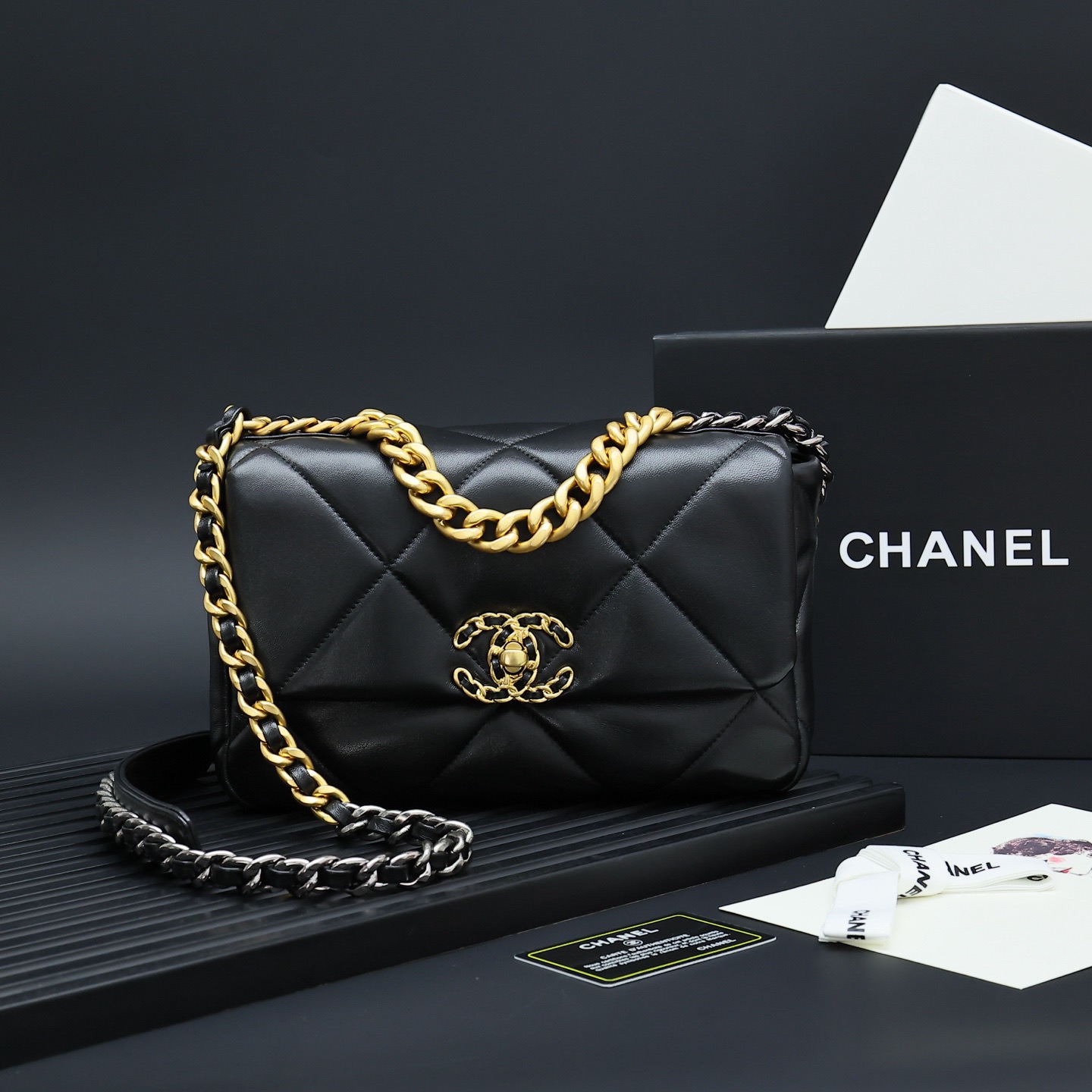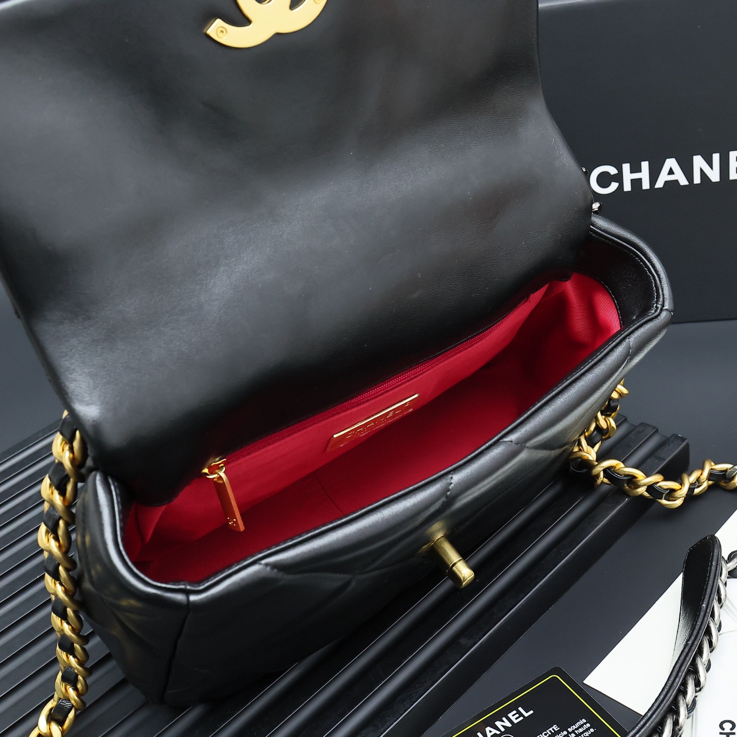 CHANEL 19Bag 21C distressed diamond-patterned leather chain shoulder bag with a lid cover, small size for women, black