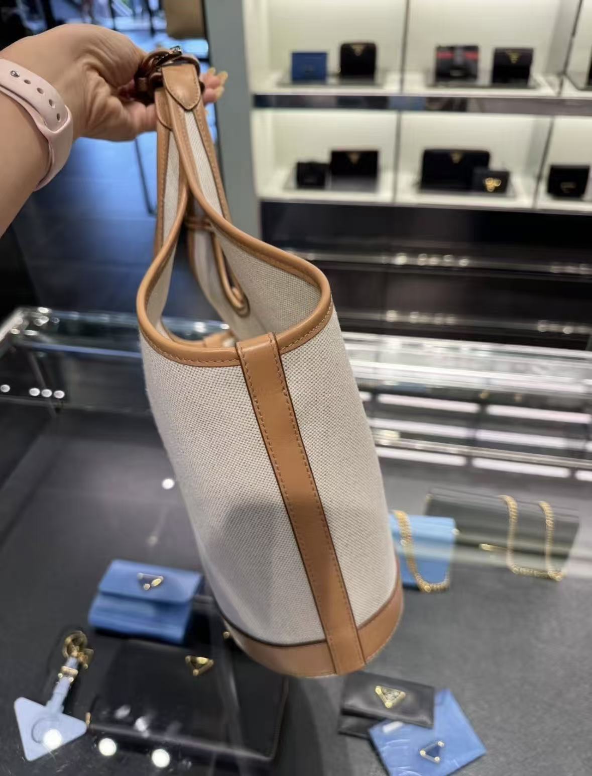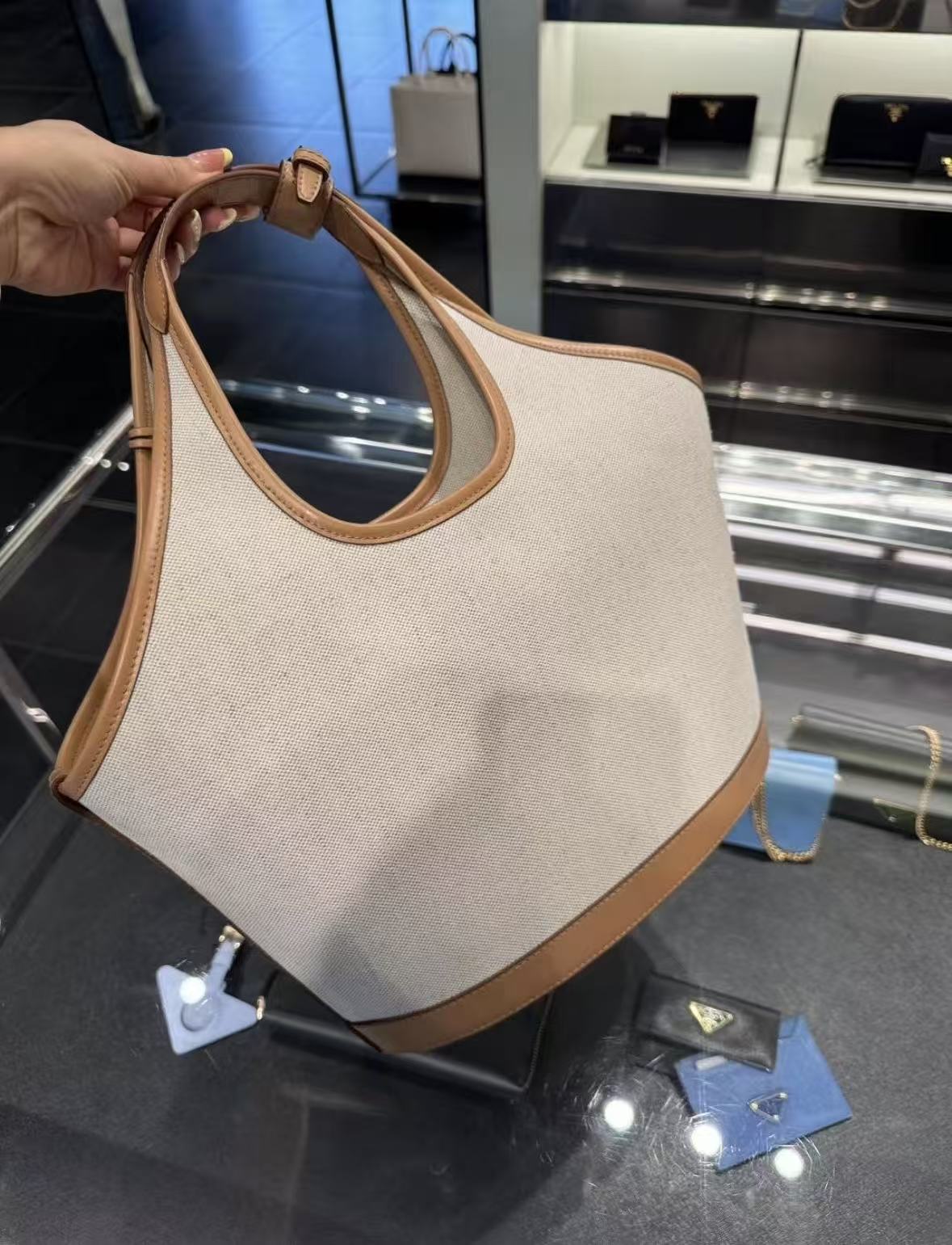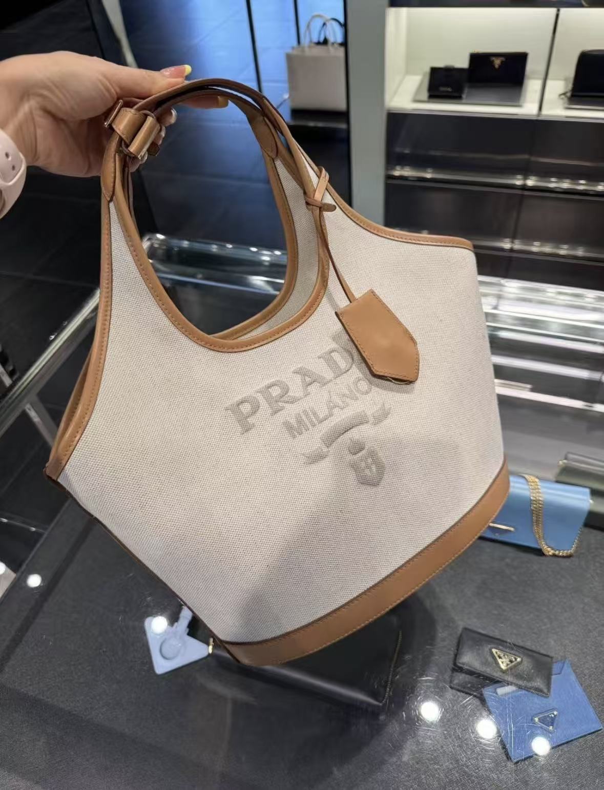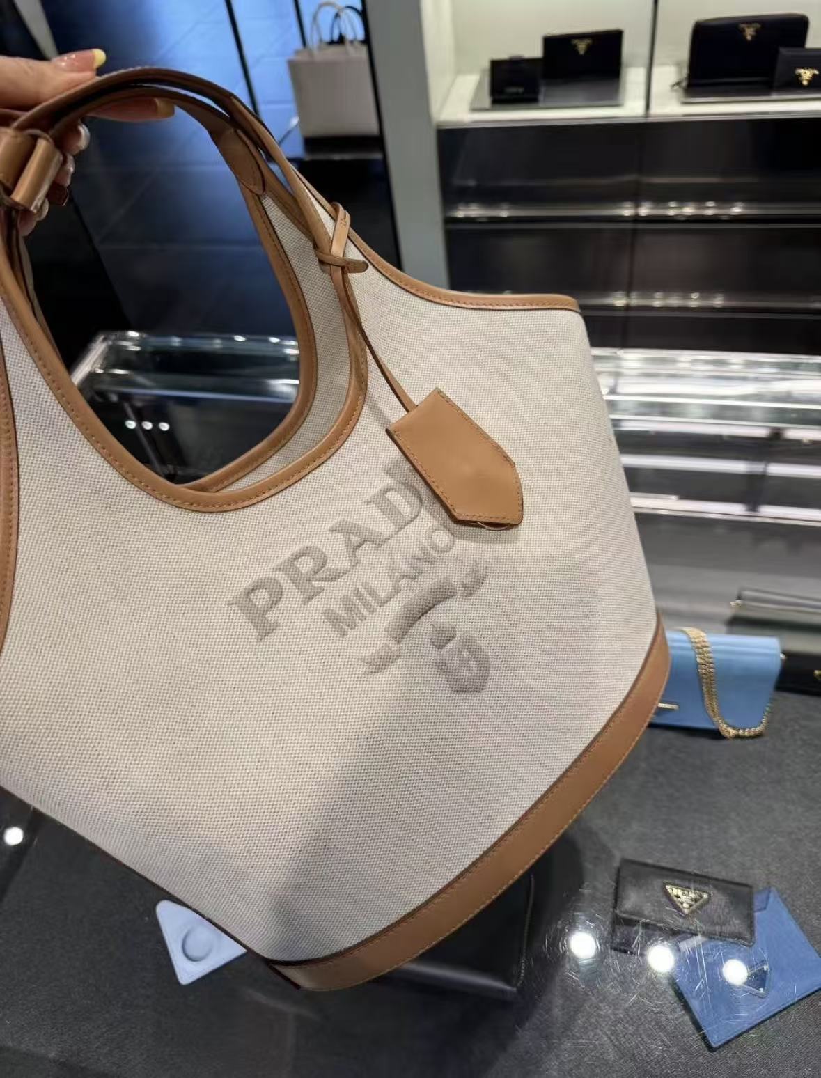 PRADA letter-patterned detachable leather keychain, Tote bag, shopping bag, handbag, medium-sized women\'s style, beige with light brown