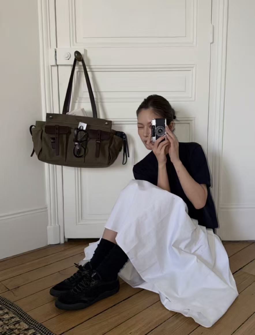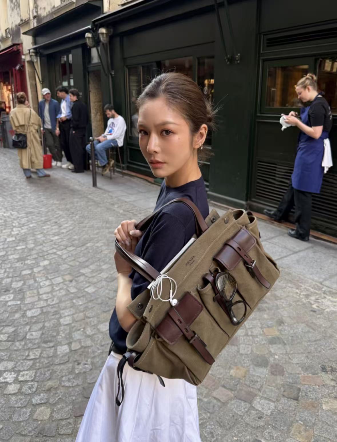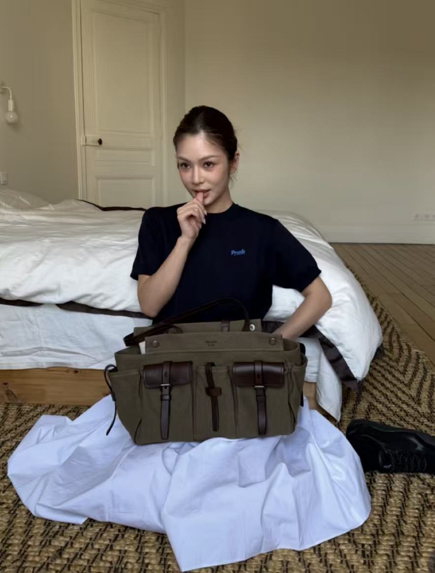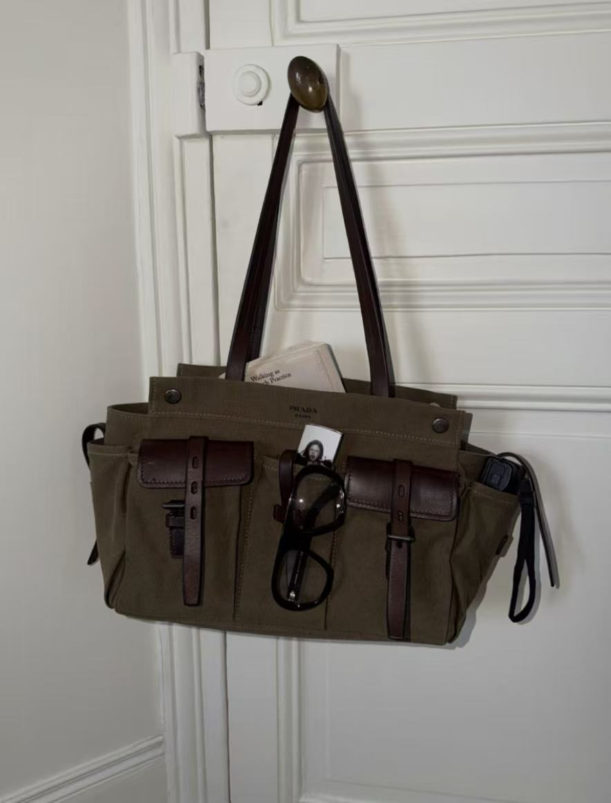PRADA Route multi-functional pocket design embossed engraved logo handbag, large size for both men and women, couple style, military green