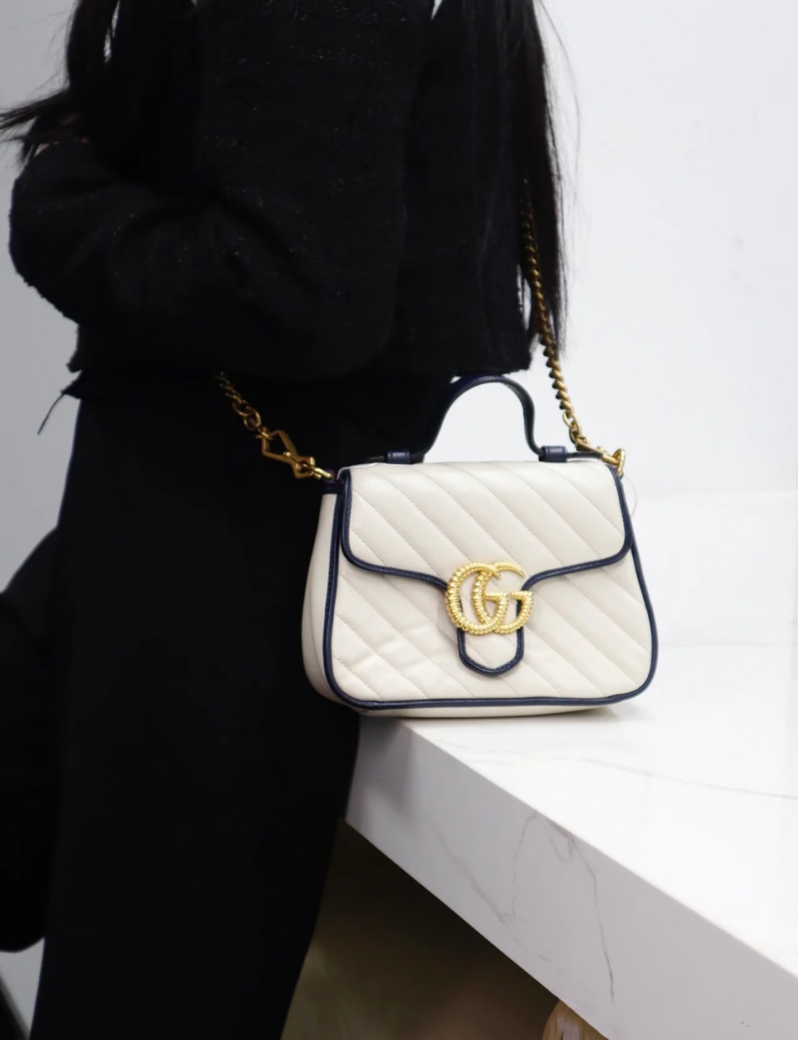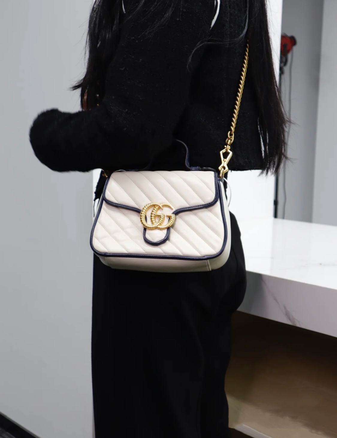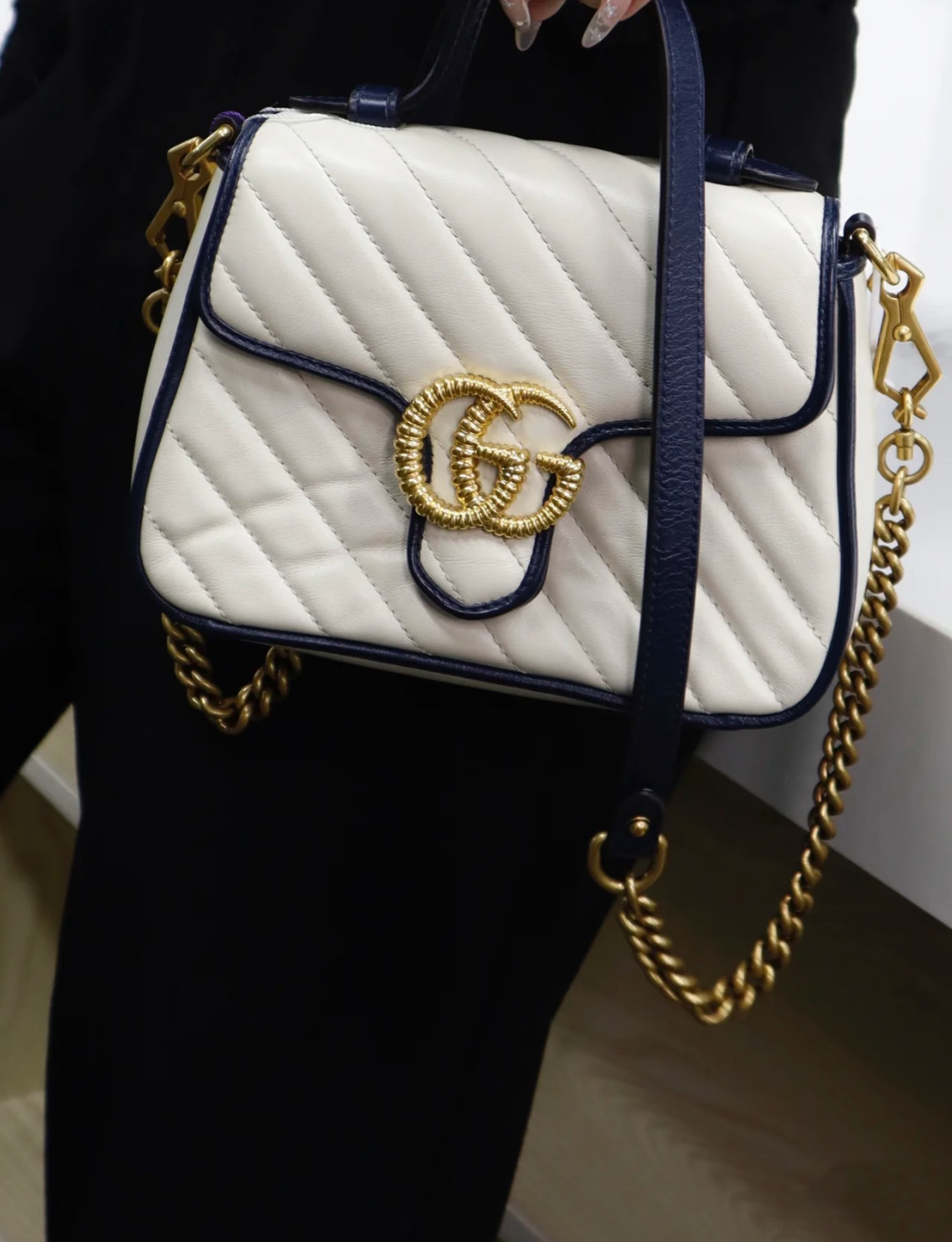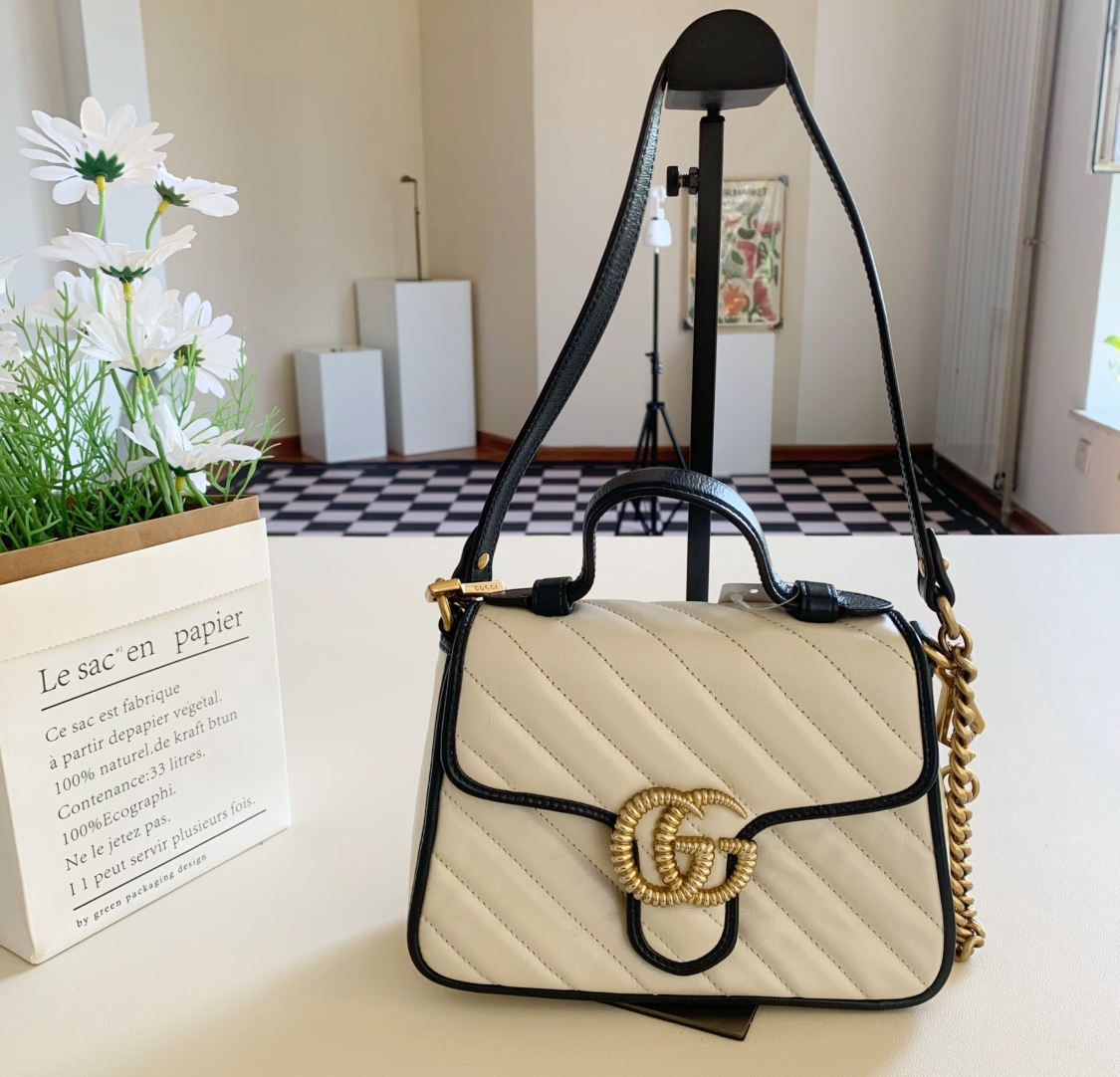 GUCCI GG Marmont series Marmont Gold Logo color block trim chain messenger bag, hand-held crossbody single-shoulder bag, mini women\'s style, white and blue