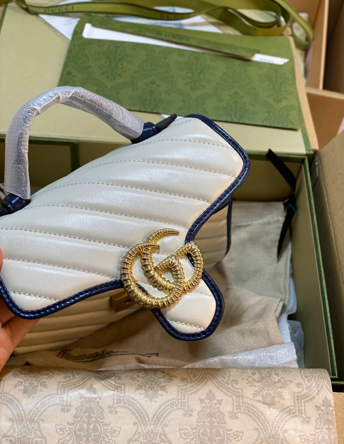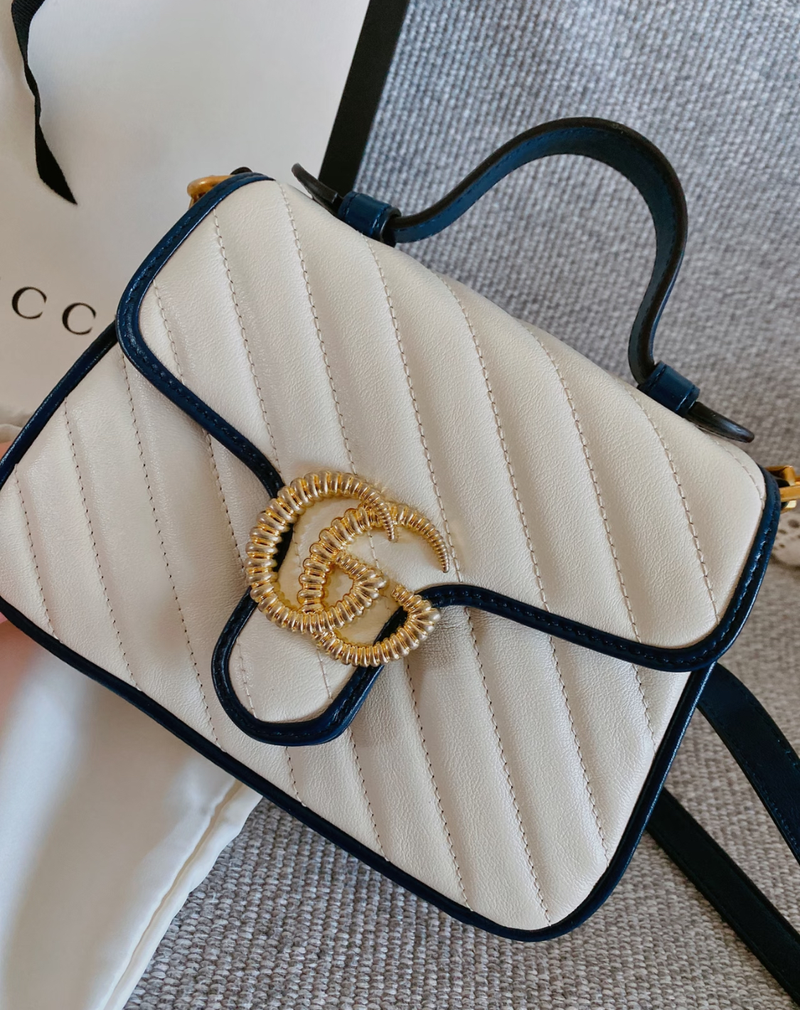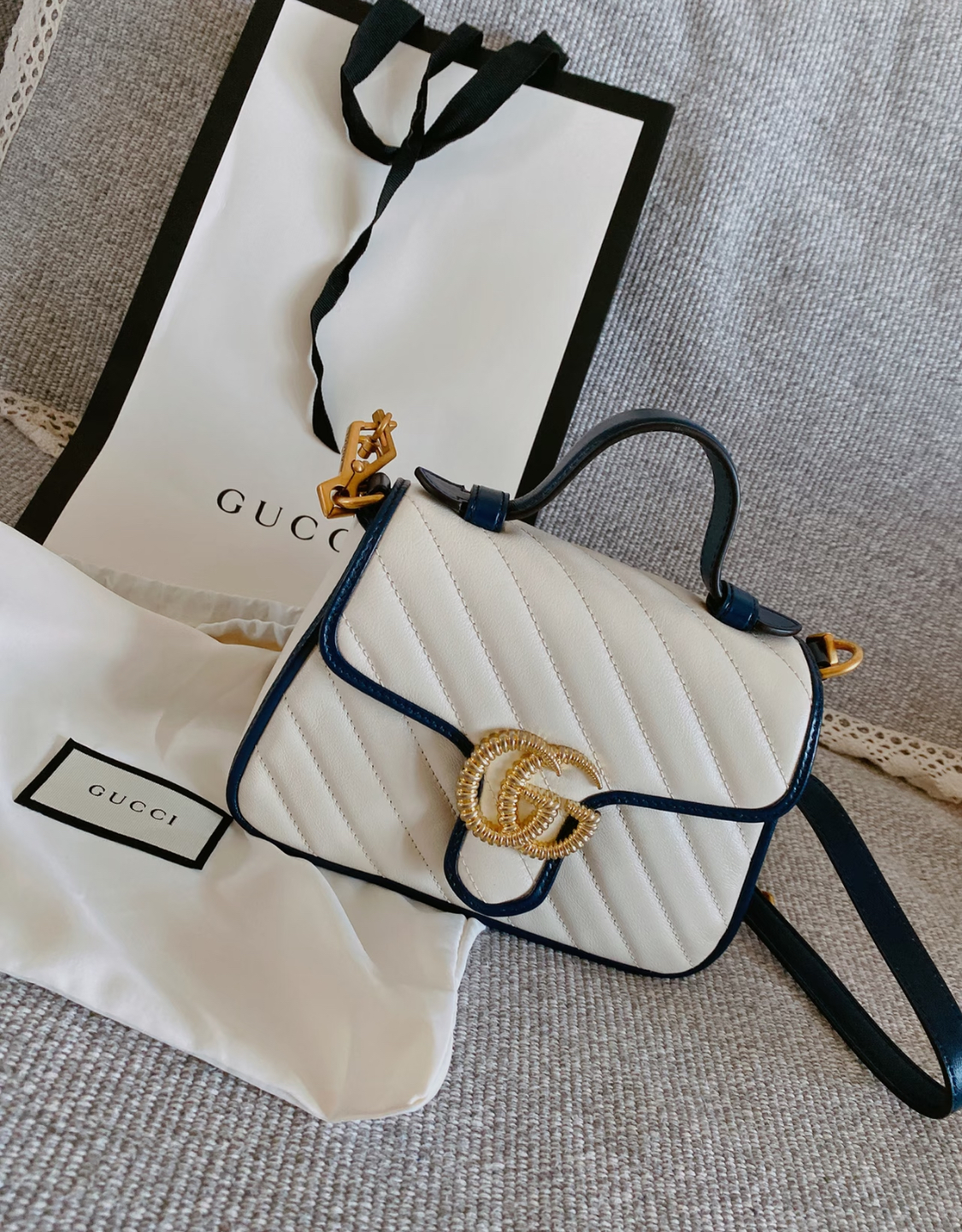 GUCCI GG Marmont series Marmont Gold Logo color block trim chain messenger bag, hand-held crossbody single-shoulder bag, mini women\'s style, white and blue