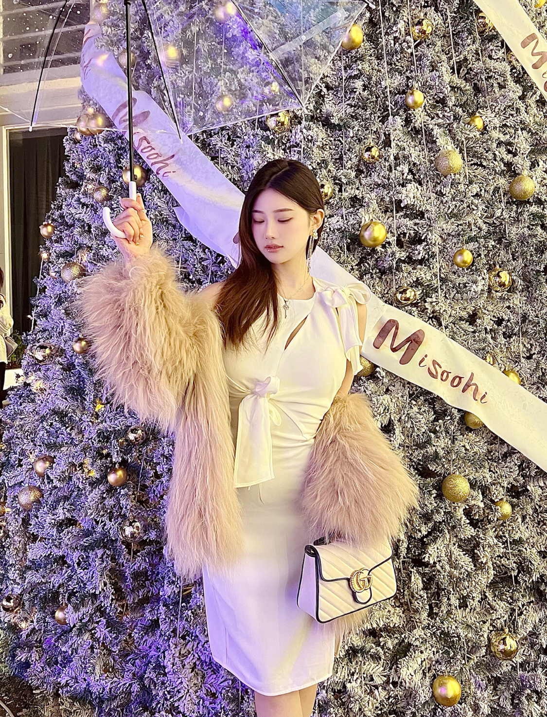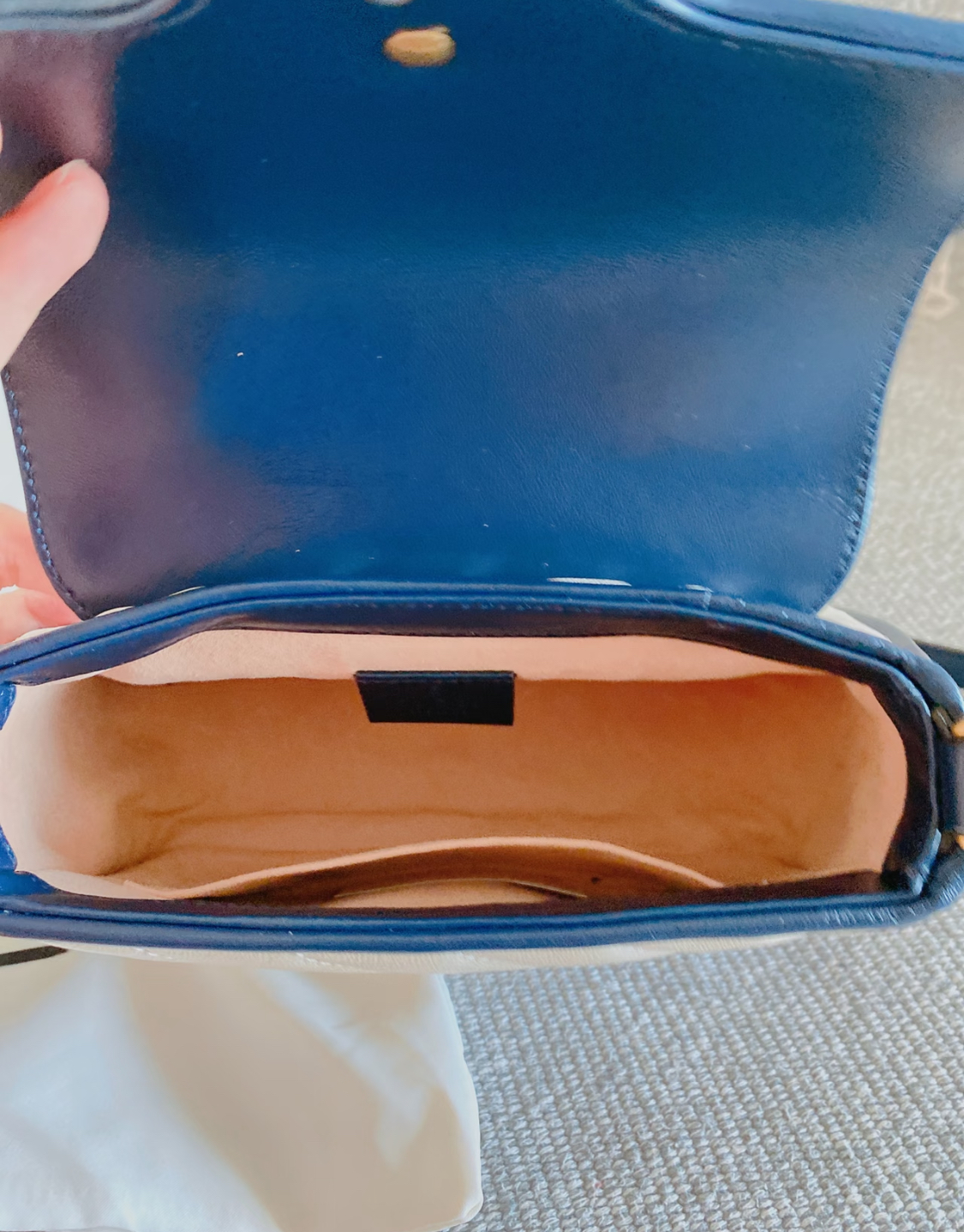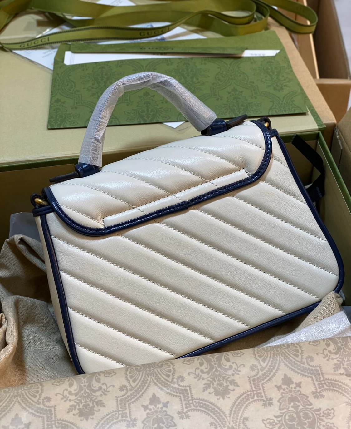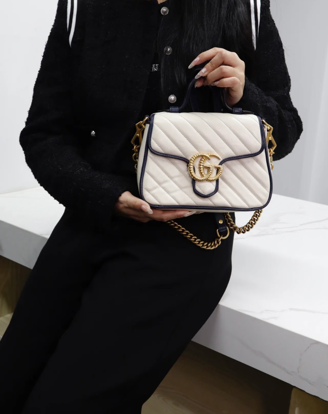 GUCCI GG Marmont series Marmont Gold Logo color block trim chain messenger bag, hand-held crossbody single-shoulder bag, mini women\'s style, white and blue