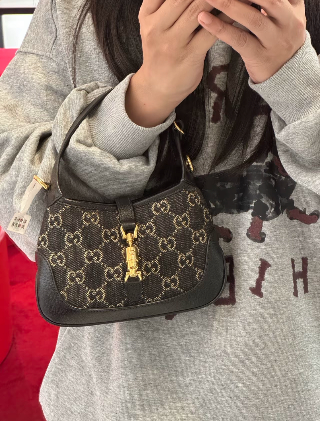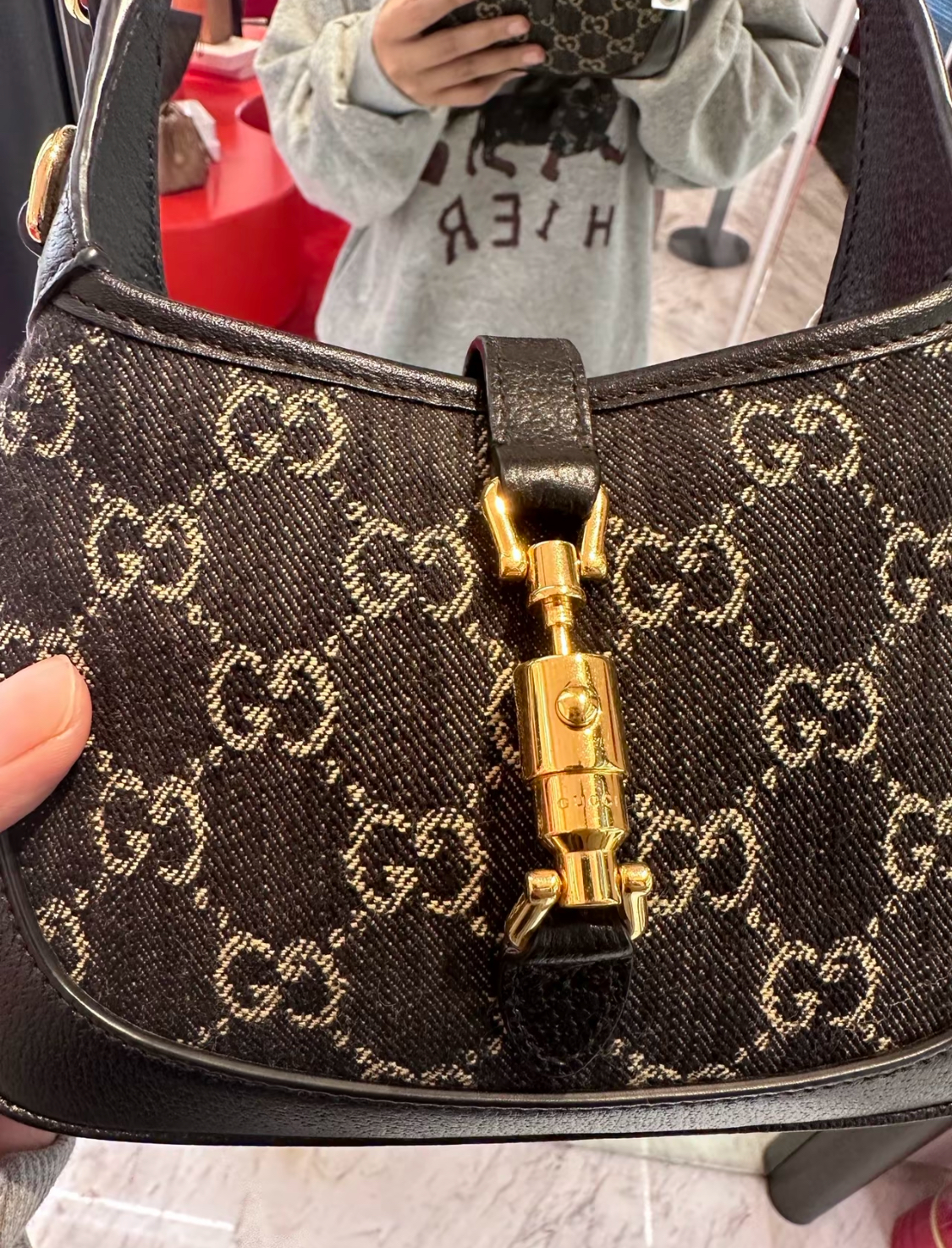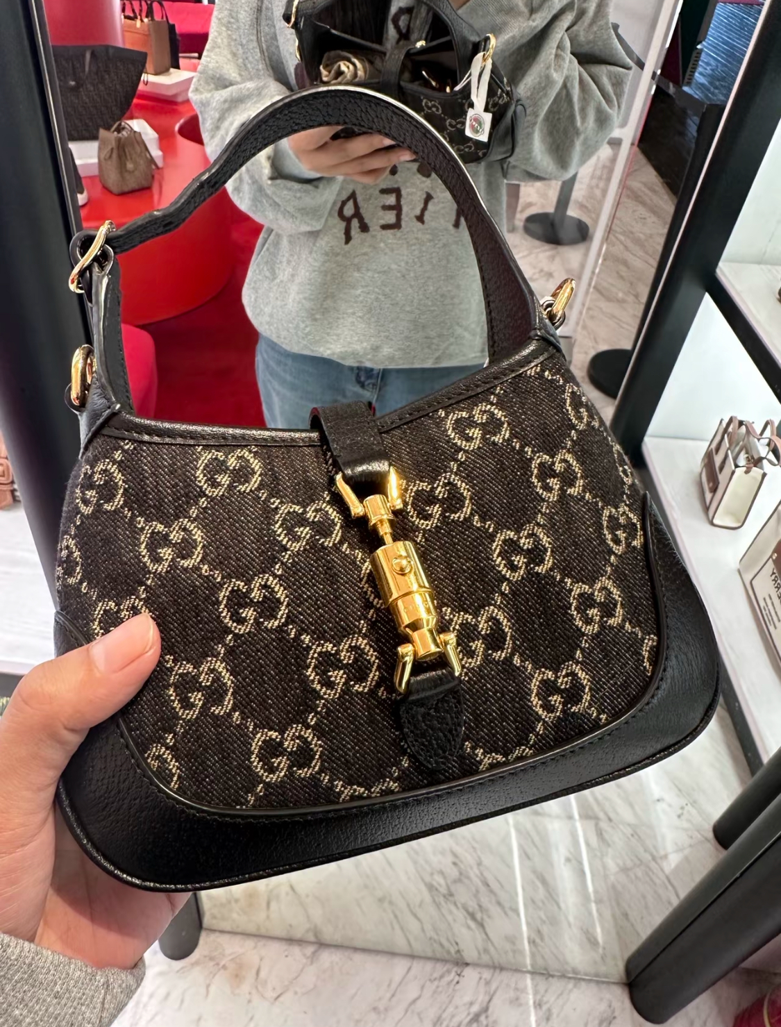 GUCCI Jackie 1961 Golden lock, monogram, full-print fabric leather, extended shoulder strap, half-moon underarm bag, shoulder bag, crossbody bag, mini women\'s style, black
