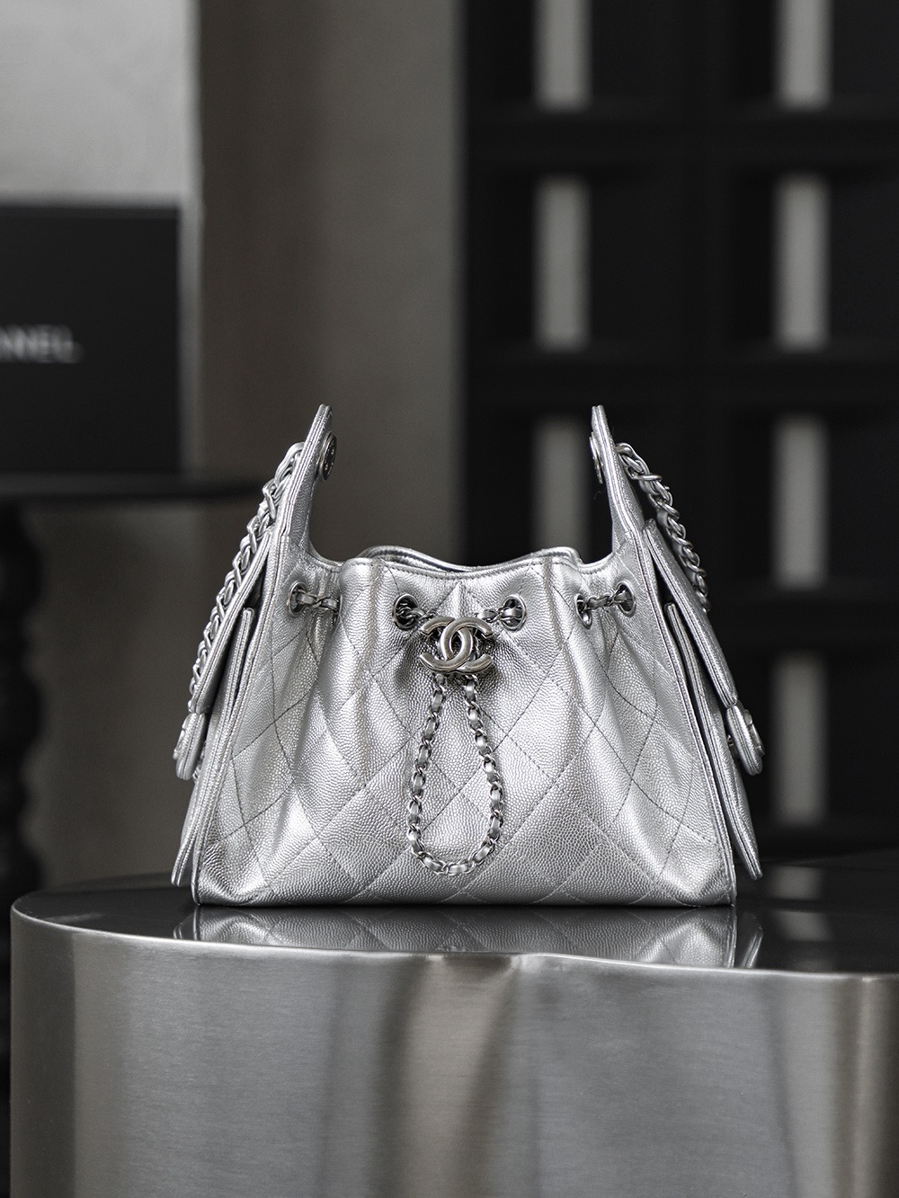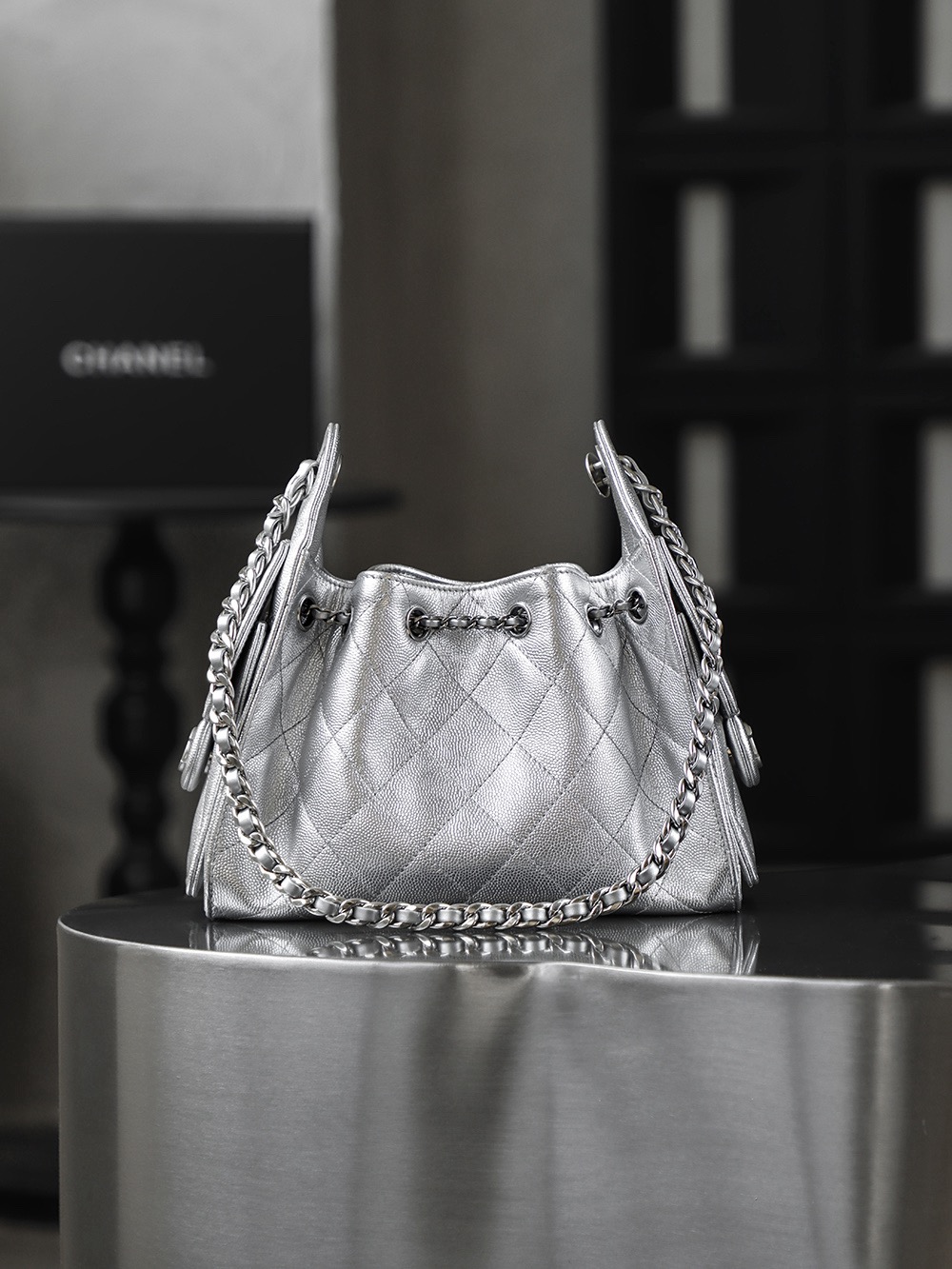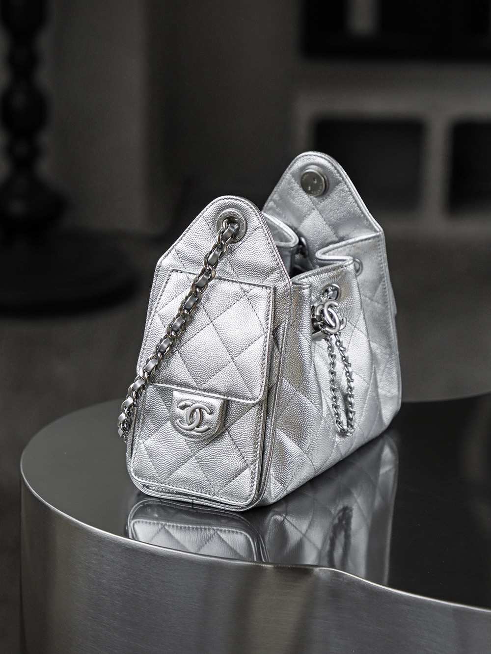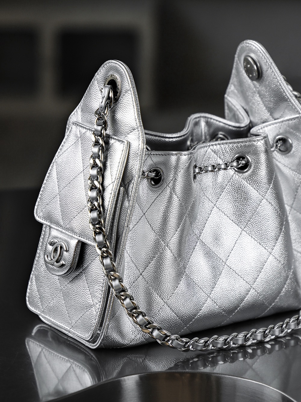 CHANEL 25Bag 26C Silver label Double C Logo diamond-quilted leather chain hippie bag, mini silver shoulder bag