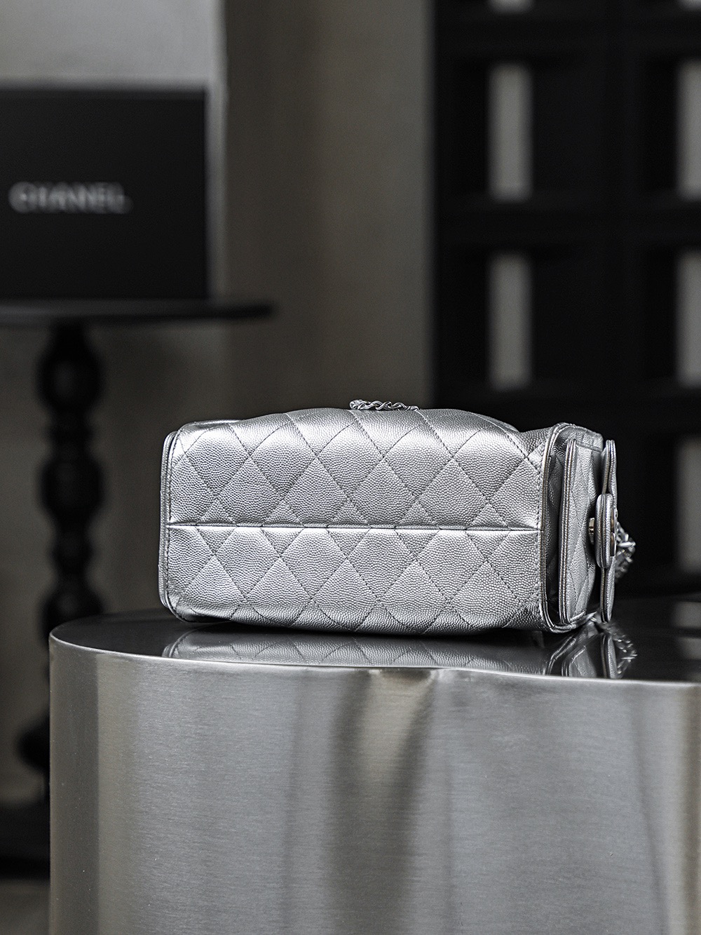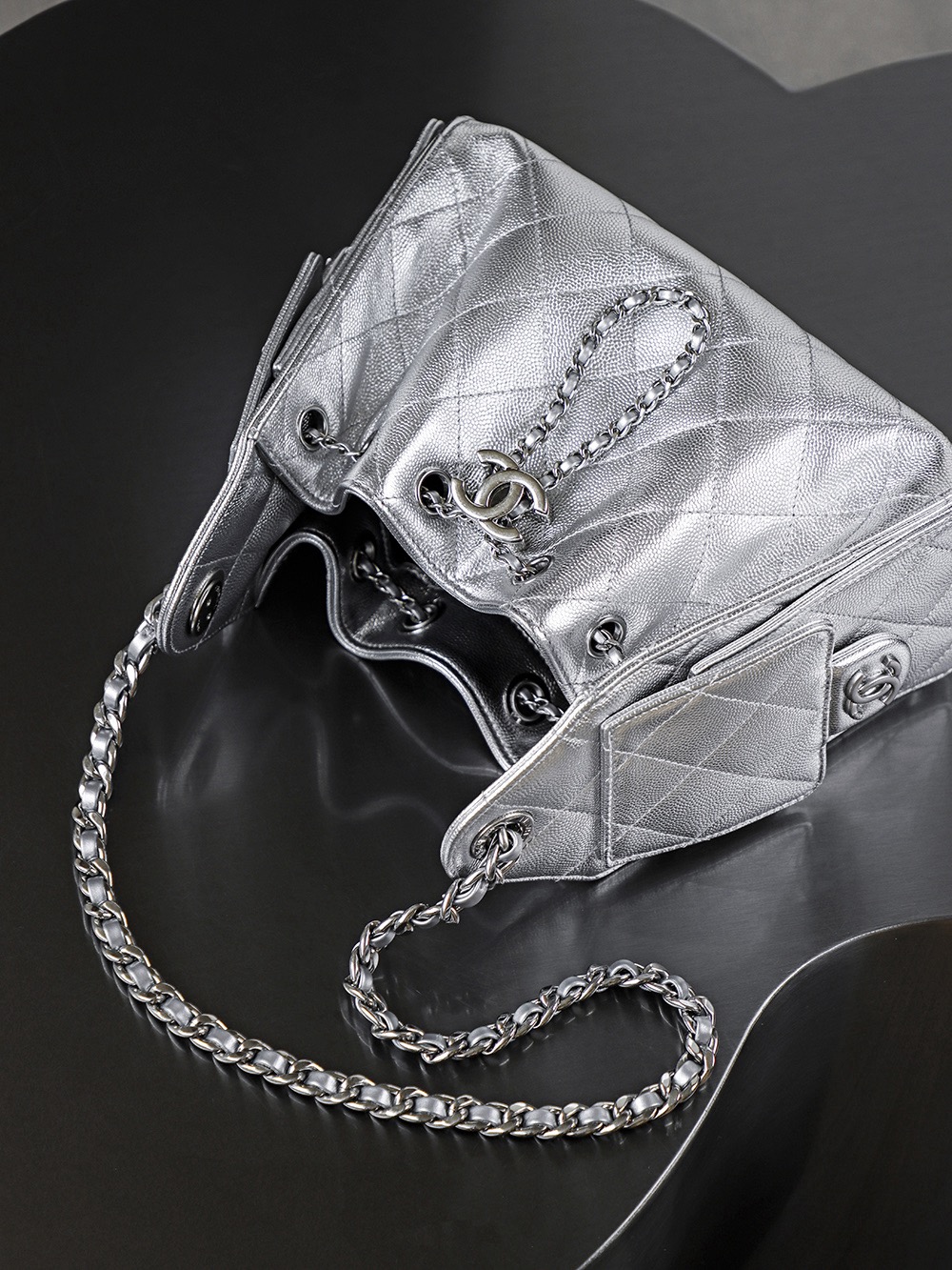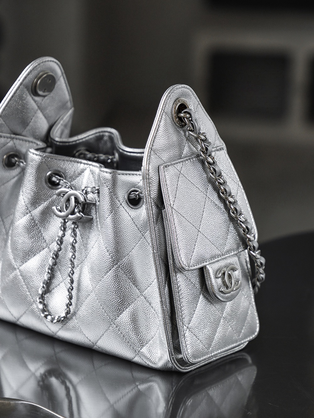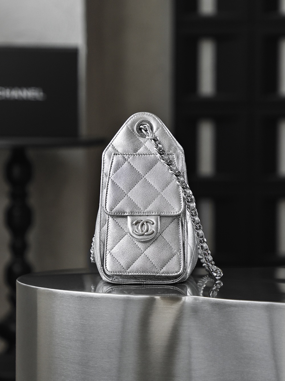 CHANEL 25Bag 26C Silver label Double C Logo diamond-quilted leather chain hippie bag, mini silver shoulder bag