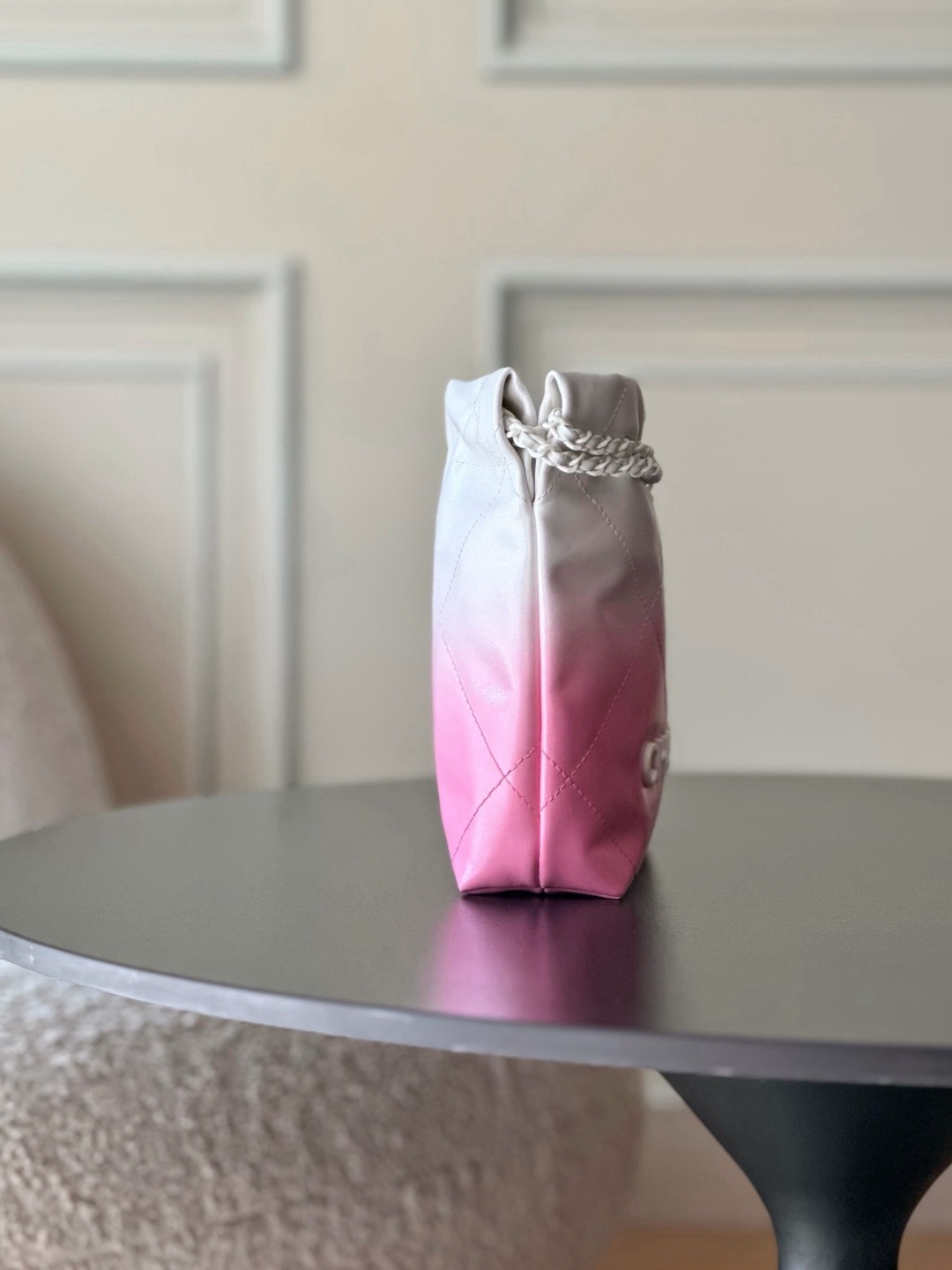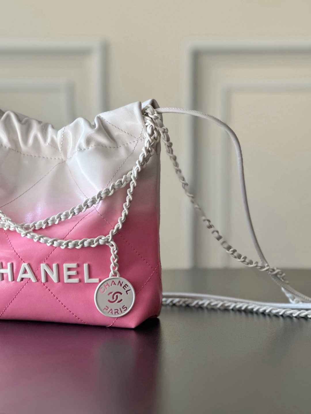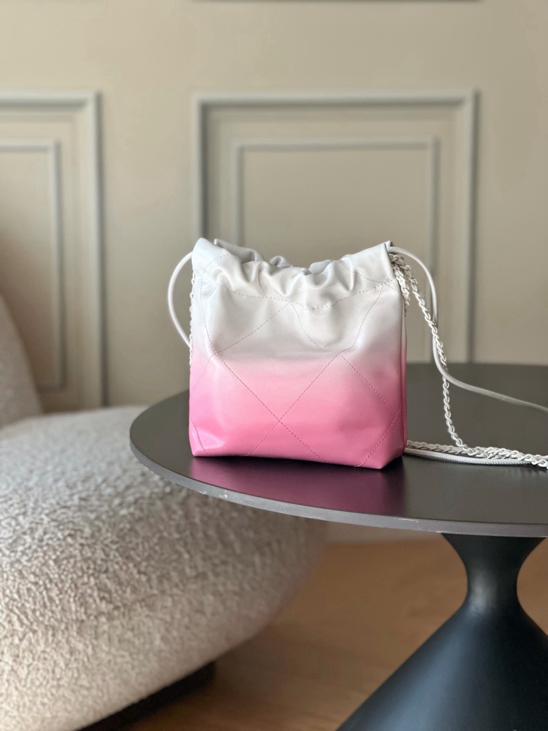 CHANEL 22Bag 24S Logo drawstring opening, diamond-shaped leather chain, lacquered gradient crossbody bag, mini white with pink