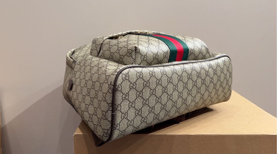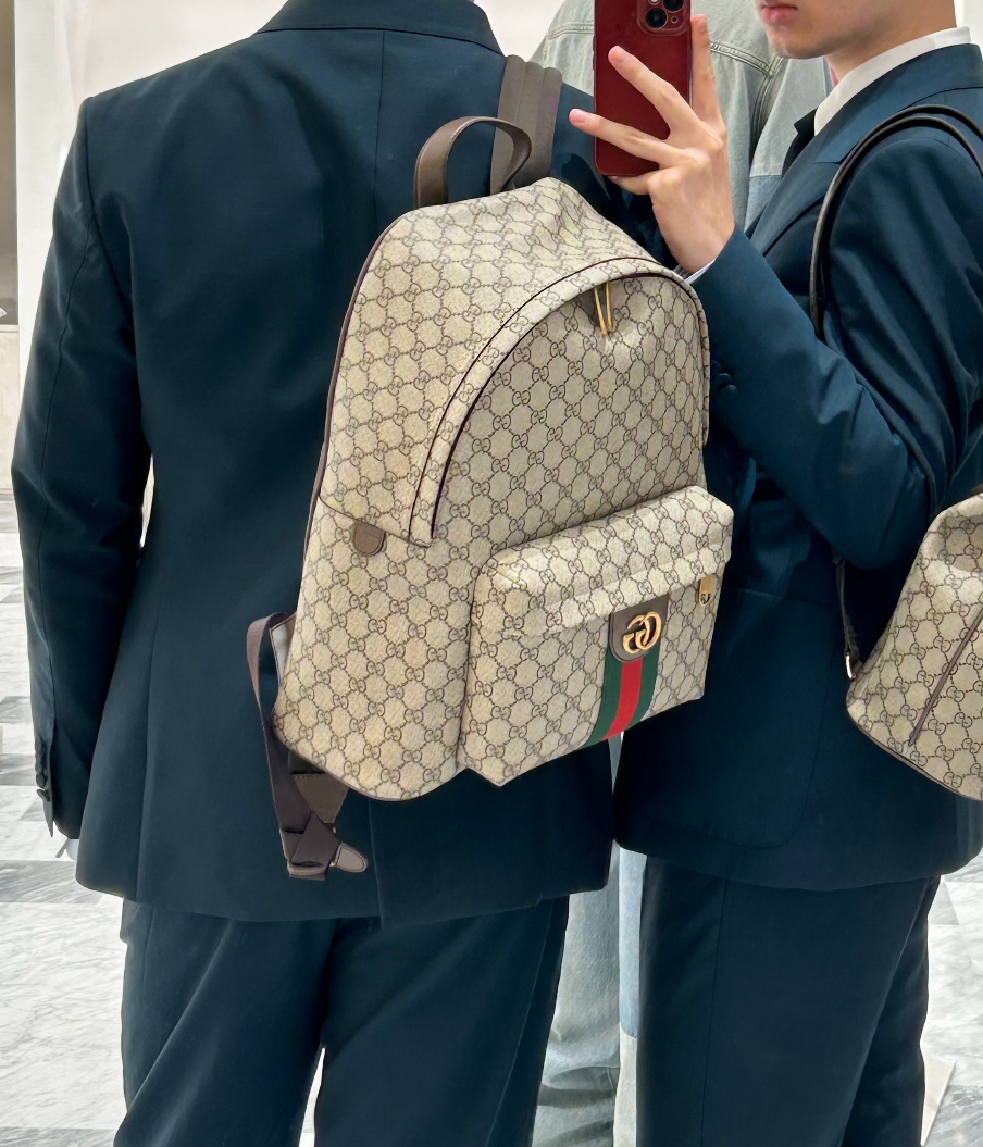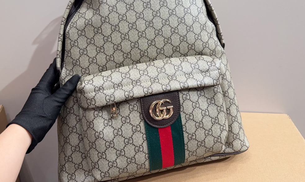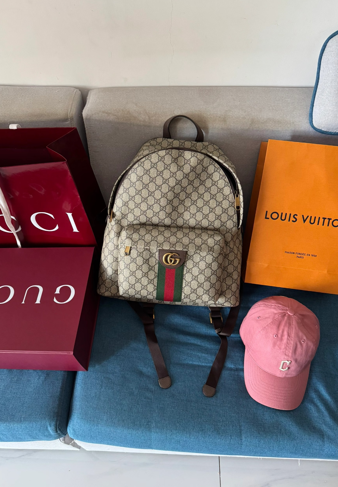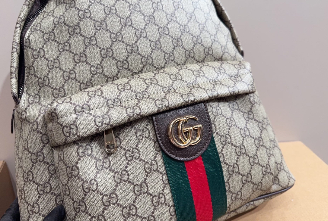 A medium-sized men\'s GUCCI Ophidia gold combination backpack in beige and dark brown