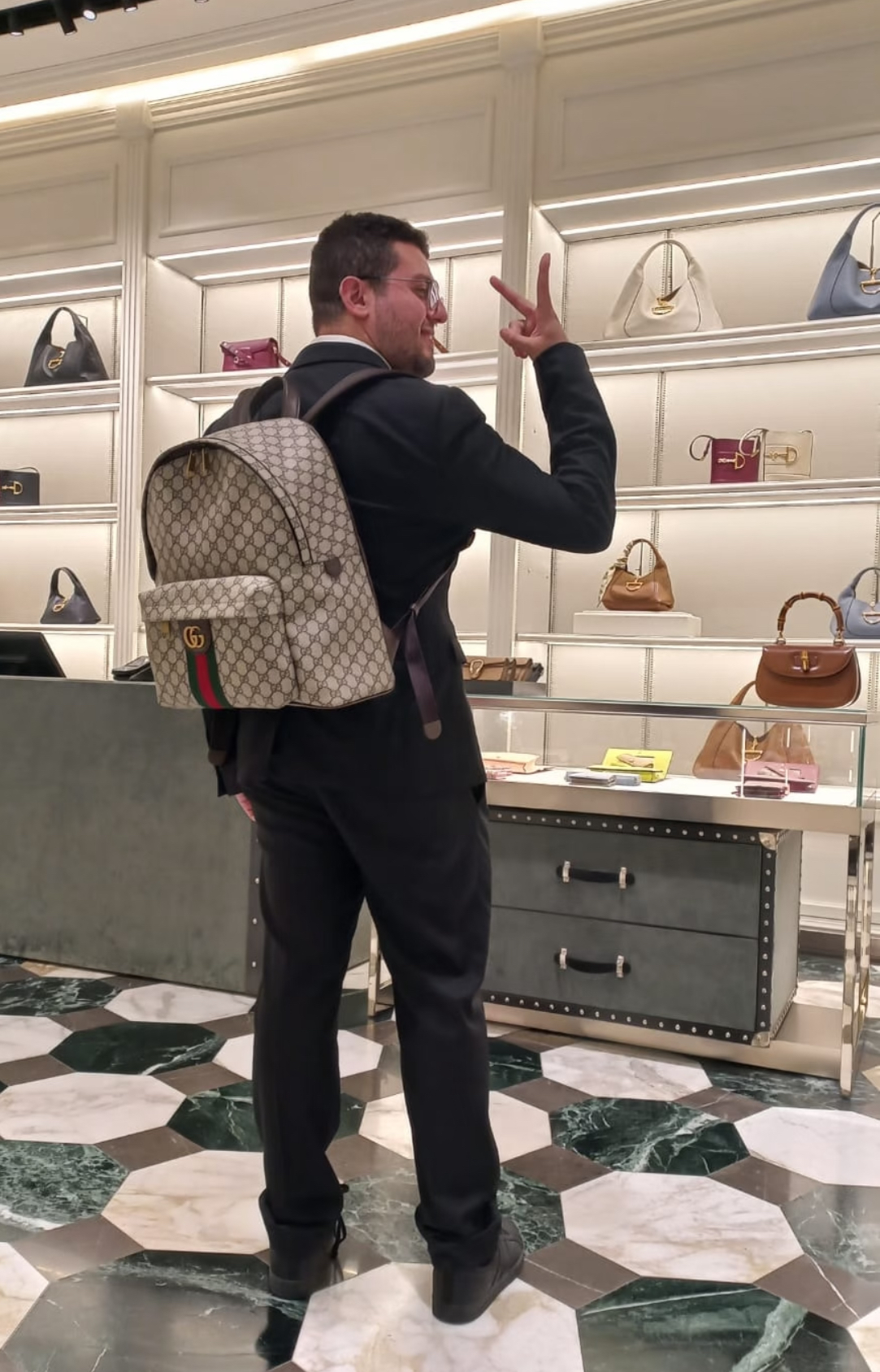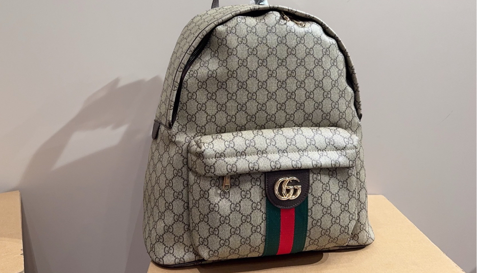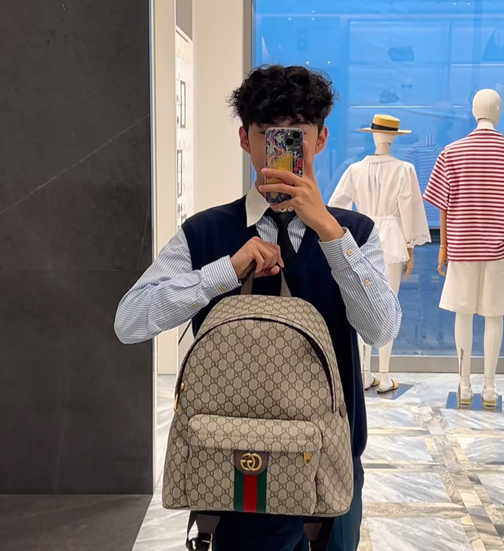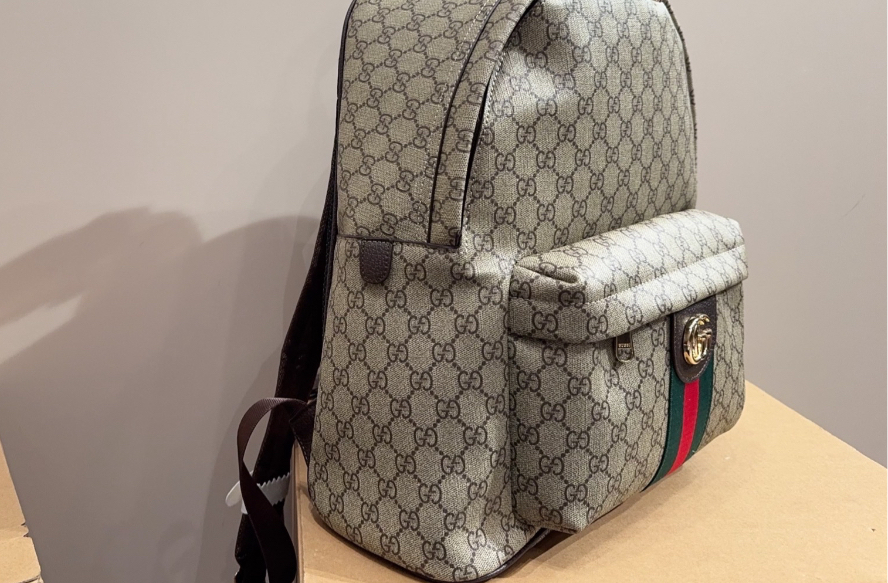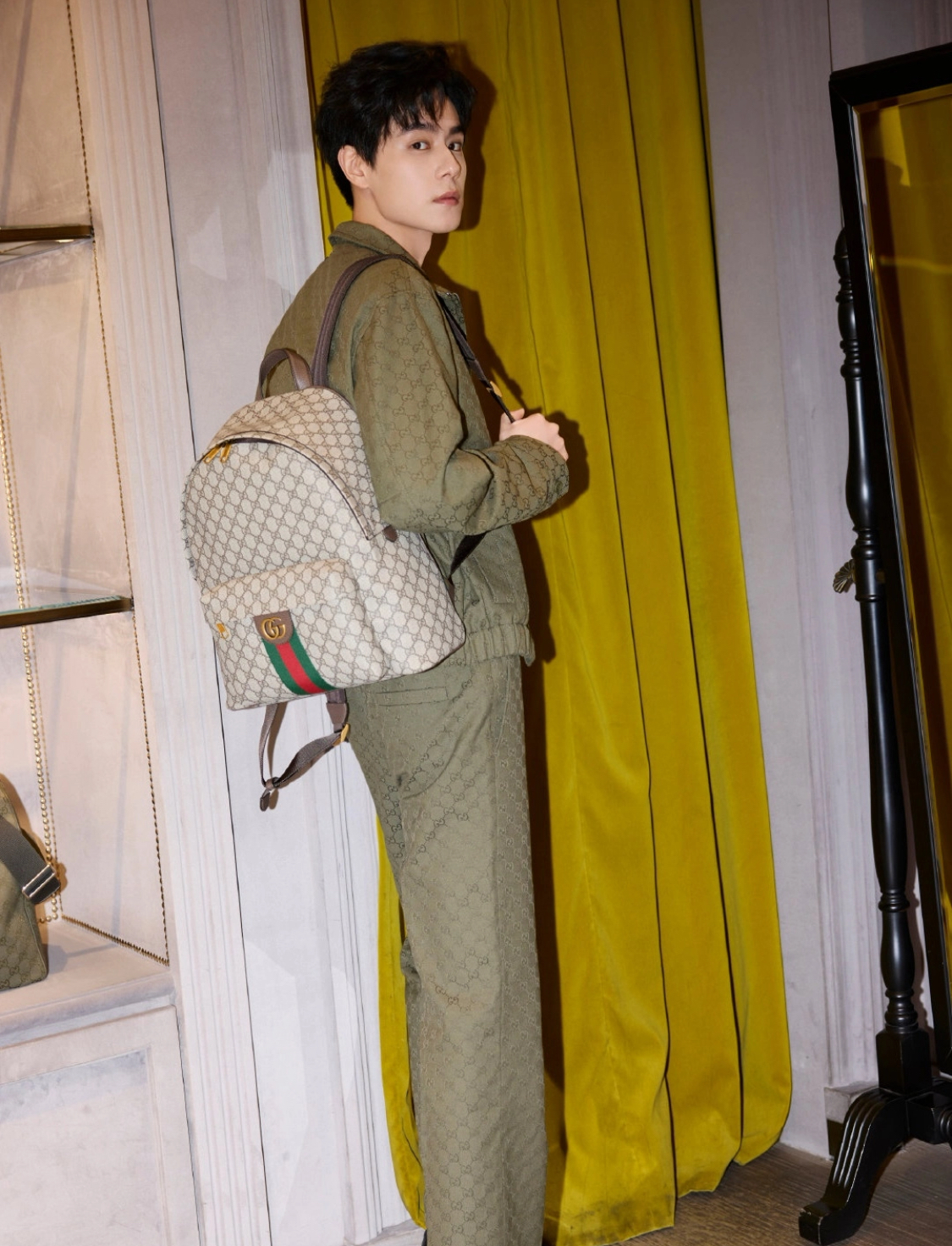 A medium-sized men\'s GUCCI Ophidia gold combination backpack in beige and dark brown