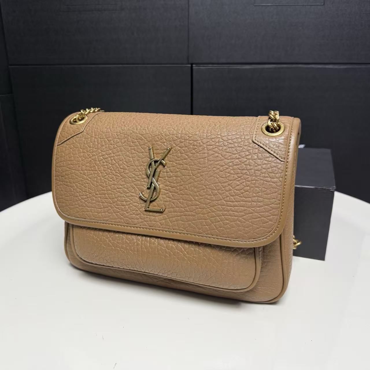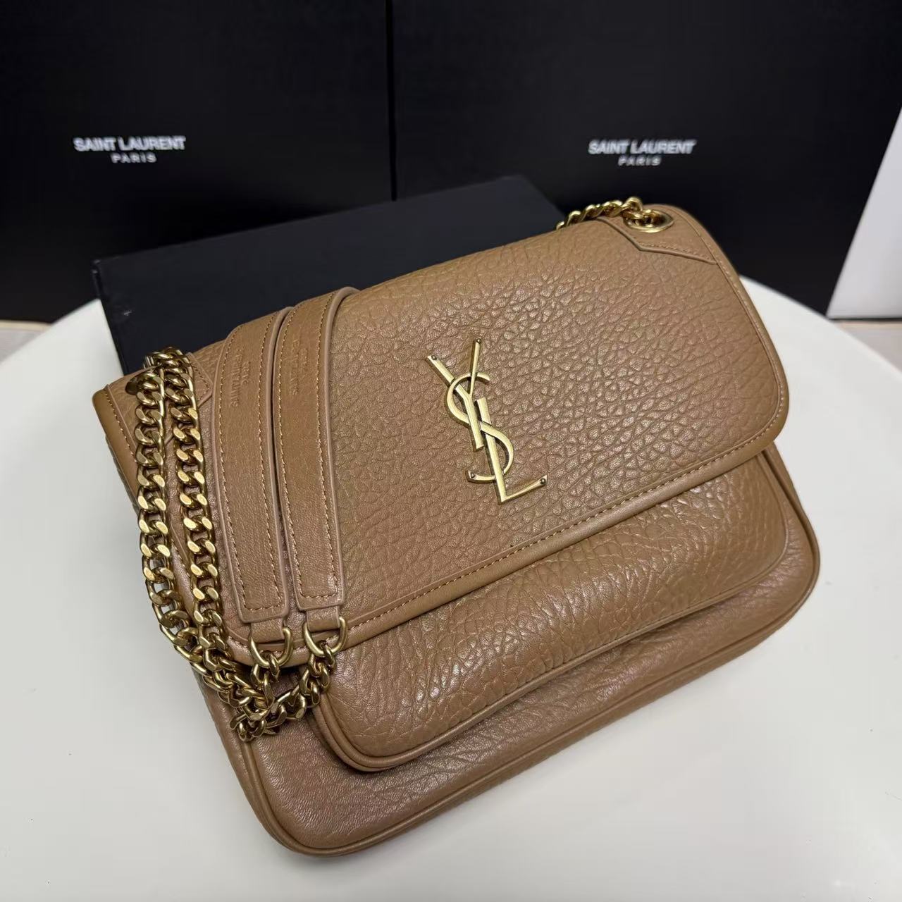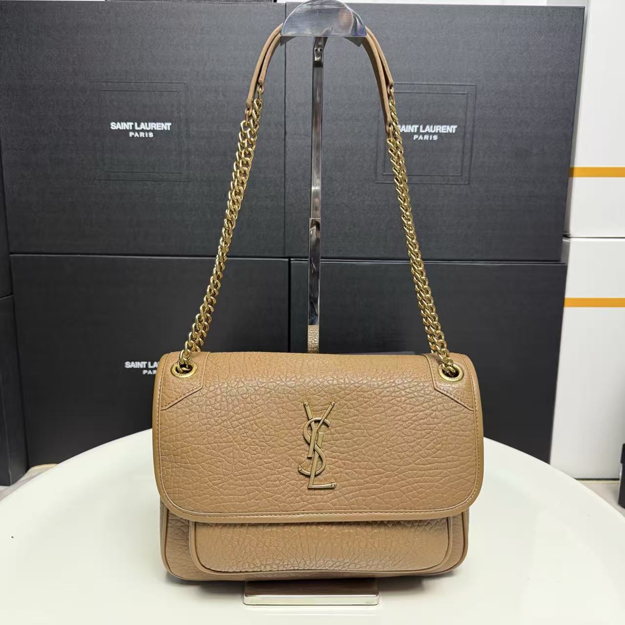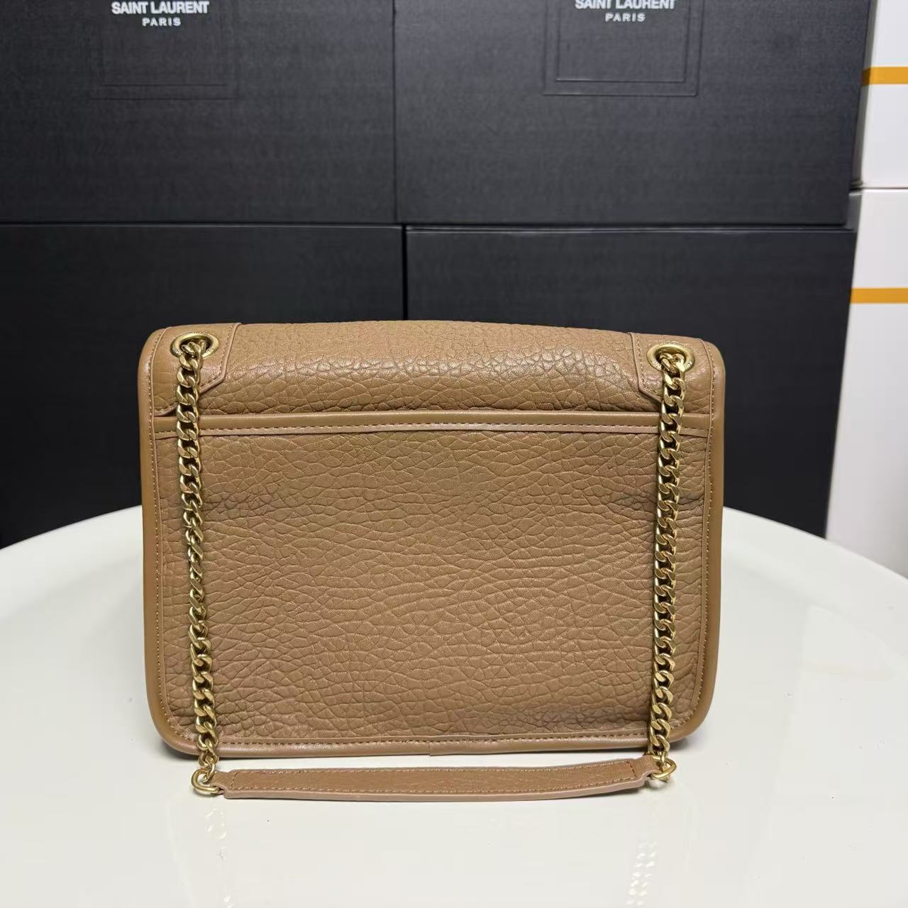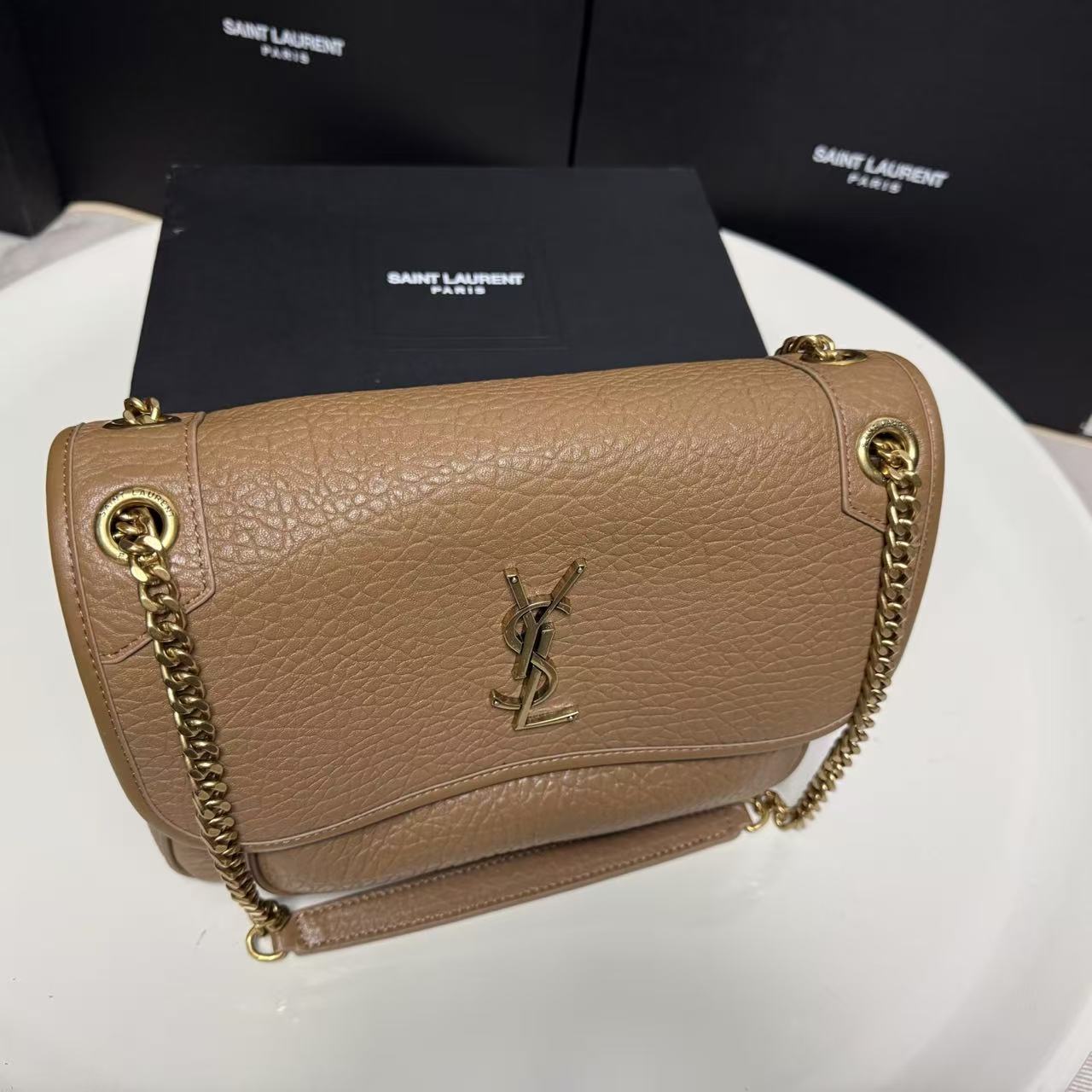 SAINT LAURENT YSL Niki metal brand, golden Logo, single-shoulder bag, large size for women, brown