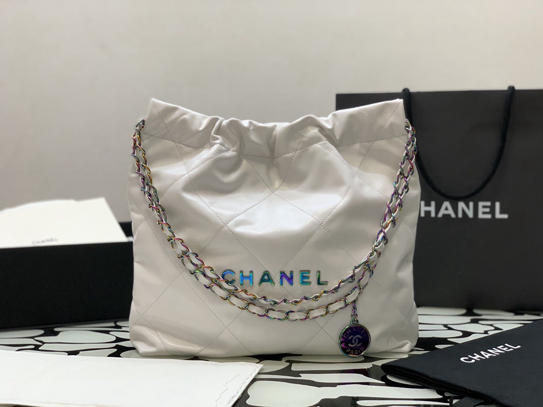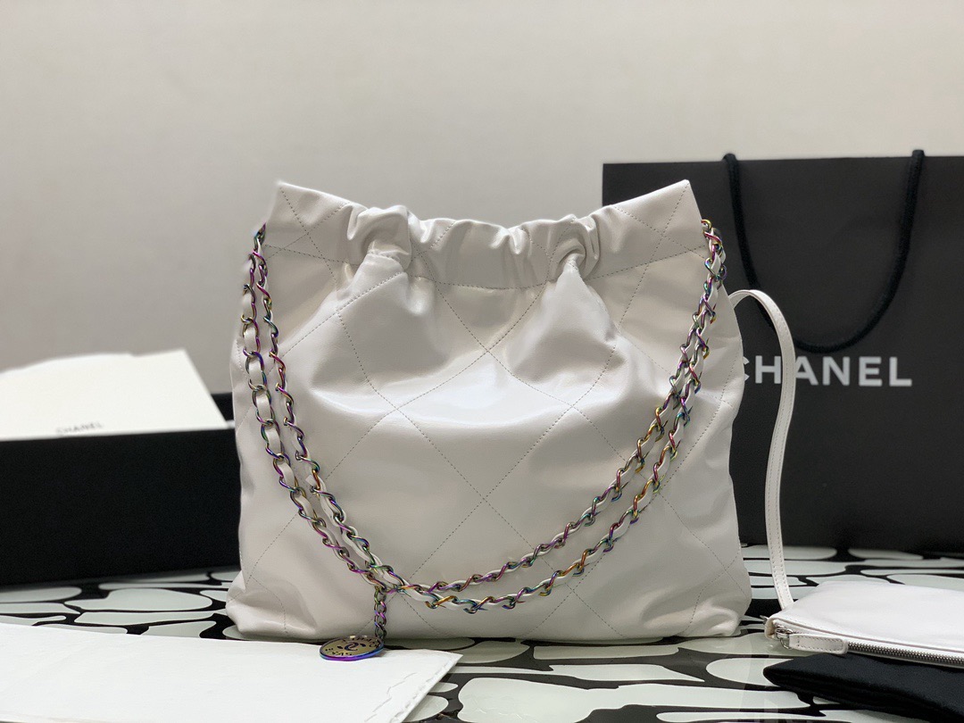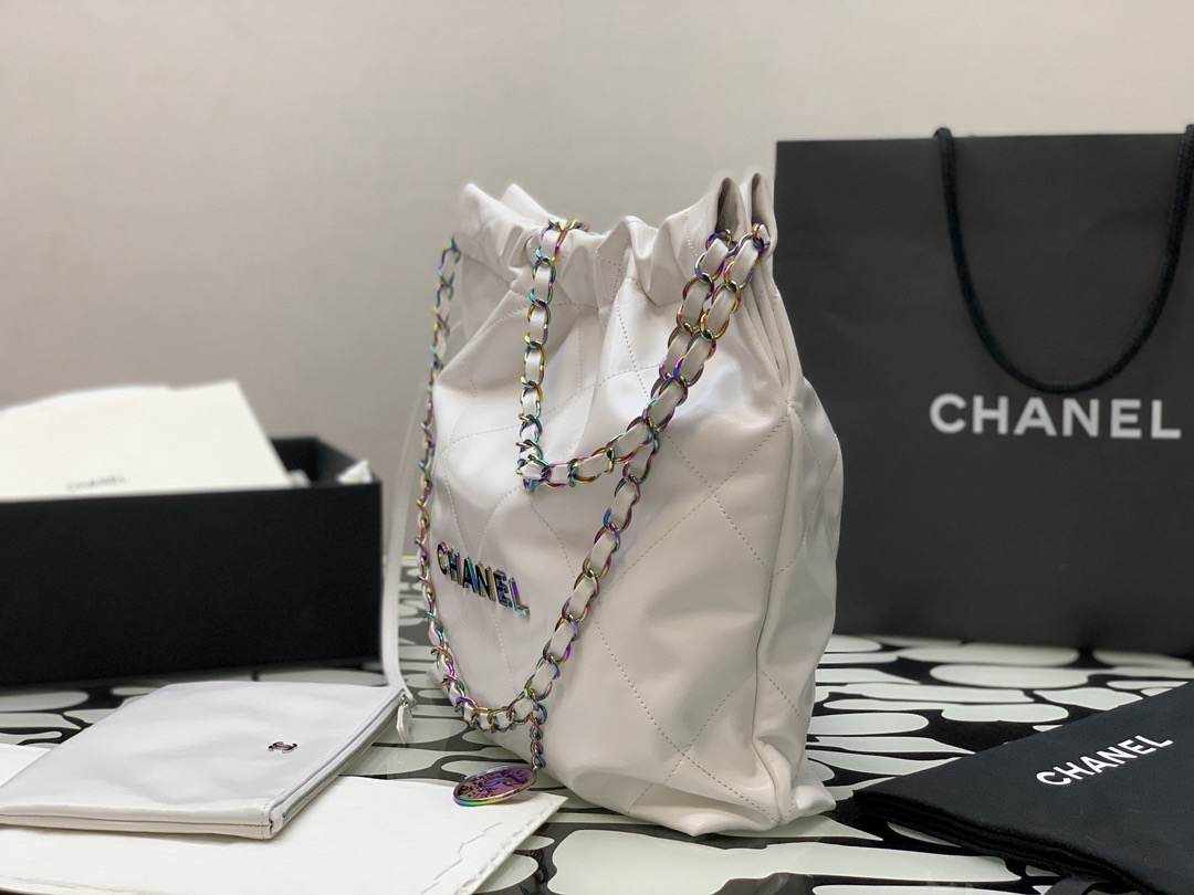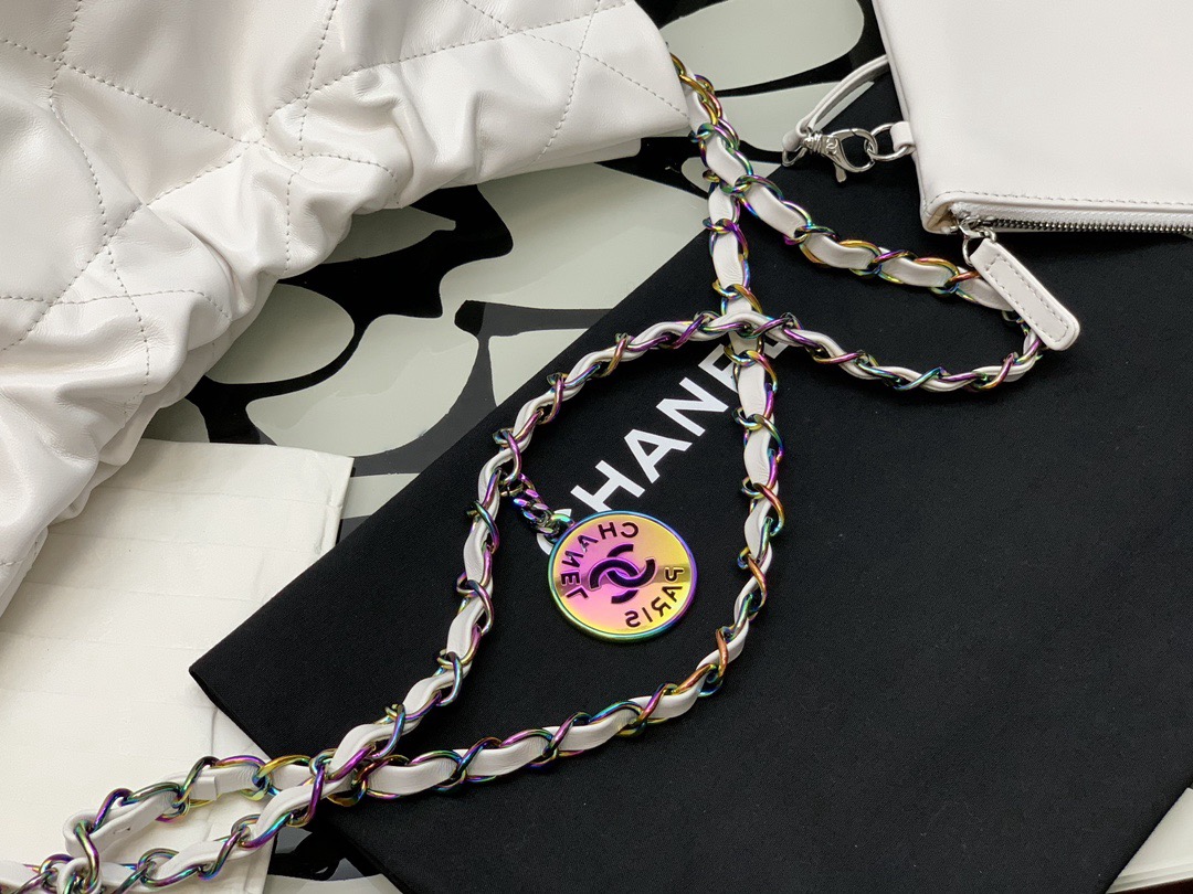 CHANEL 22Bag 24C Early Spring Resort Collection, letter Logo diamond-patterned leather chain strap, bill of lading shoulder bag, small size, regular white