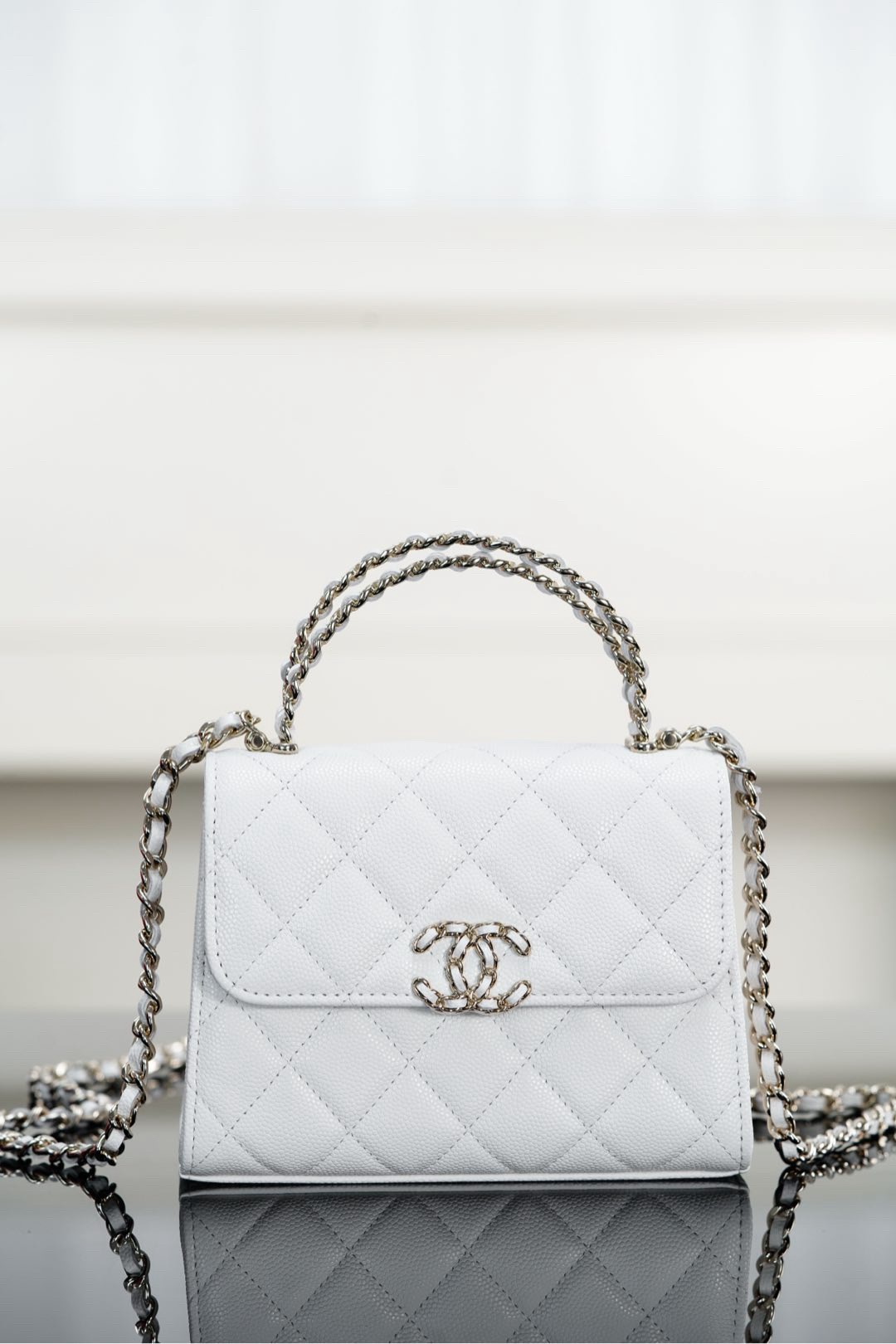 CHANEL 23P Spring/Summer Kelly diamond-shaped hollowed-out handle granular embossed shiny granular mouth cover bag, clutch, single-shoulder crossbody handbag, white