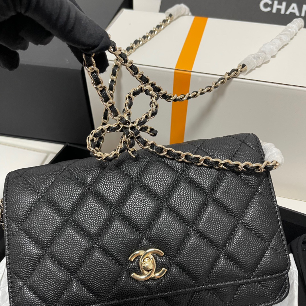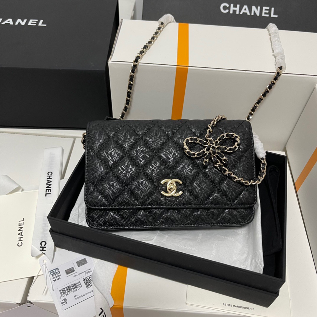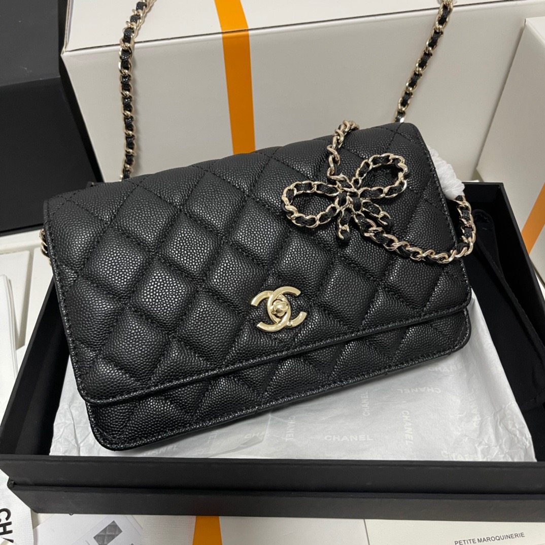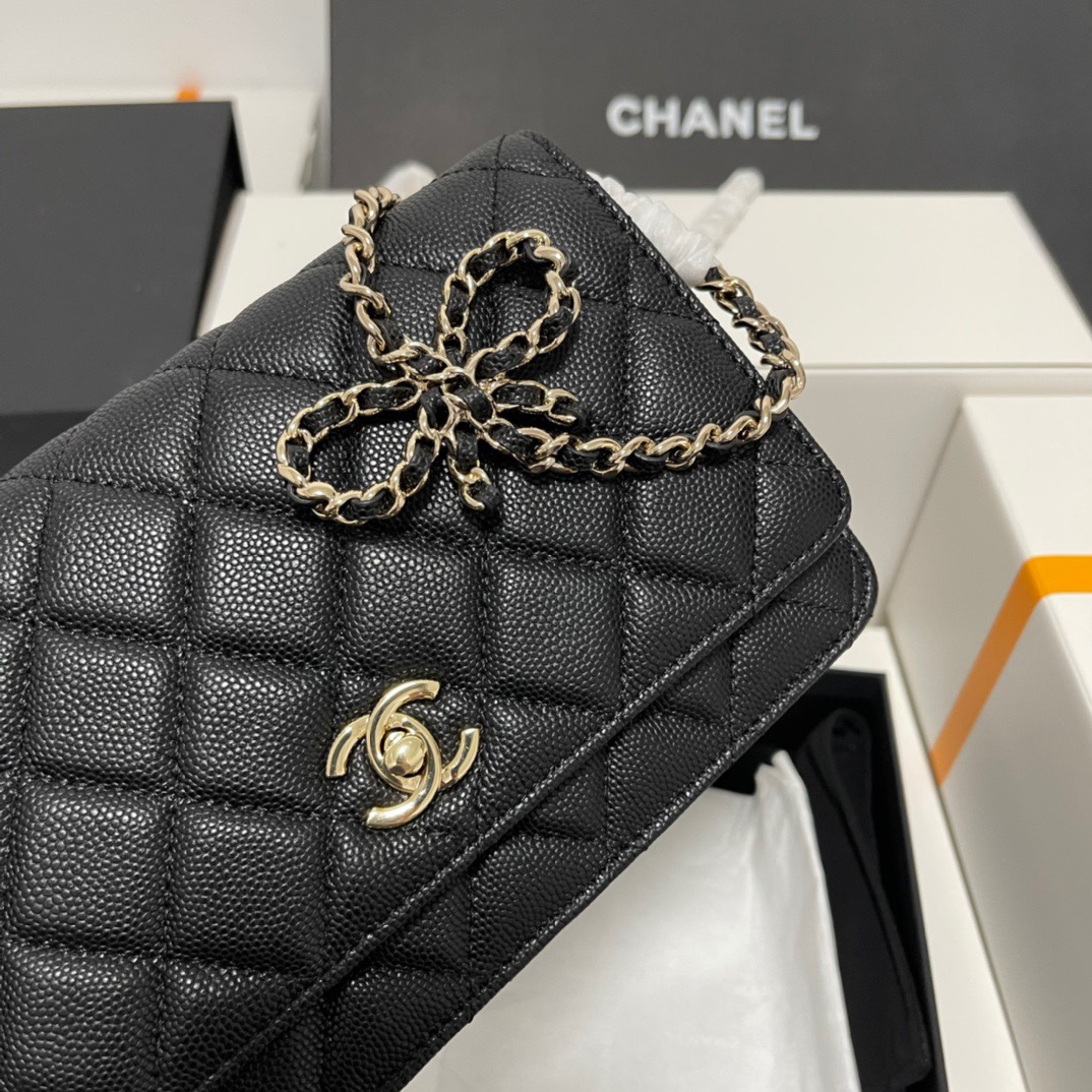 CHANEL gold buckle diamond-shaped bow, leather chain, chain grain surface, lychee pattern, single-shoulder crossbody wallet, black