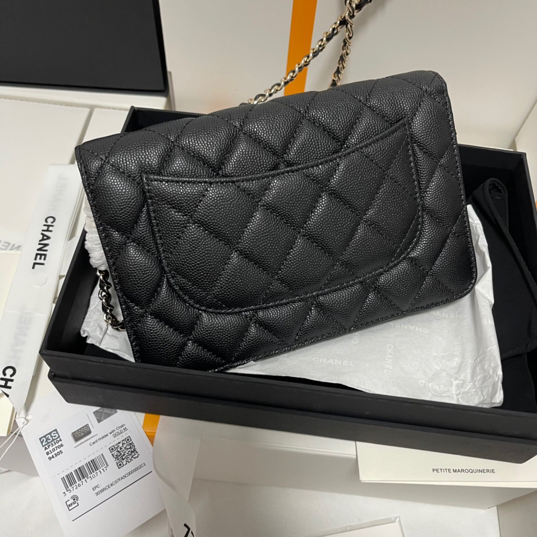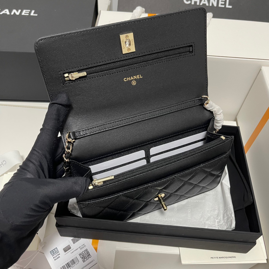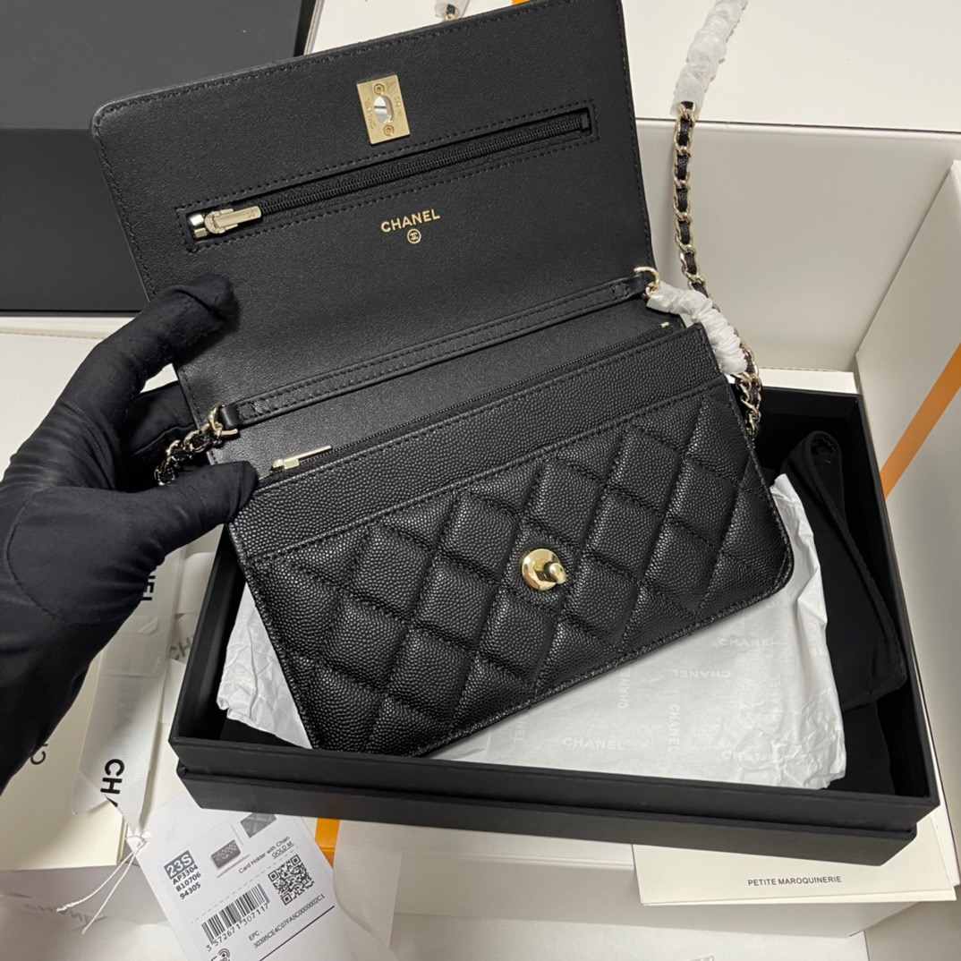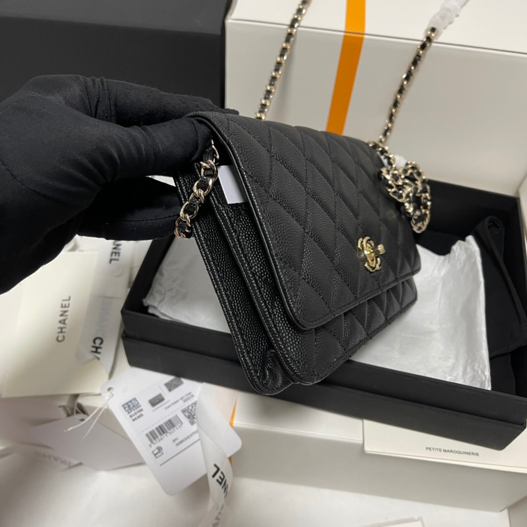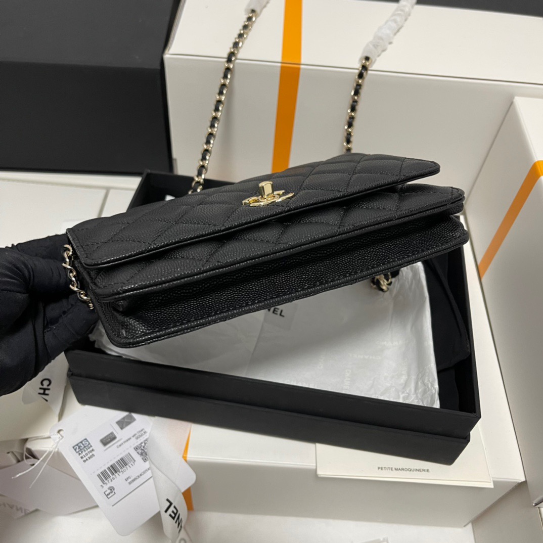 CHANEL gold buckle diamond-shaped bow, leather chain, chain grain surface, lychee pattern, single-shoulder crossbody wallet, black
