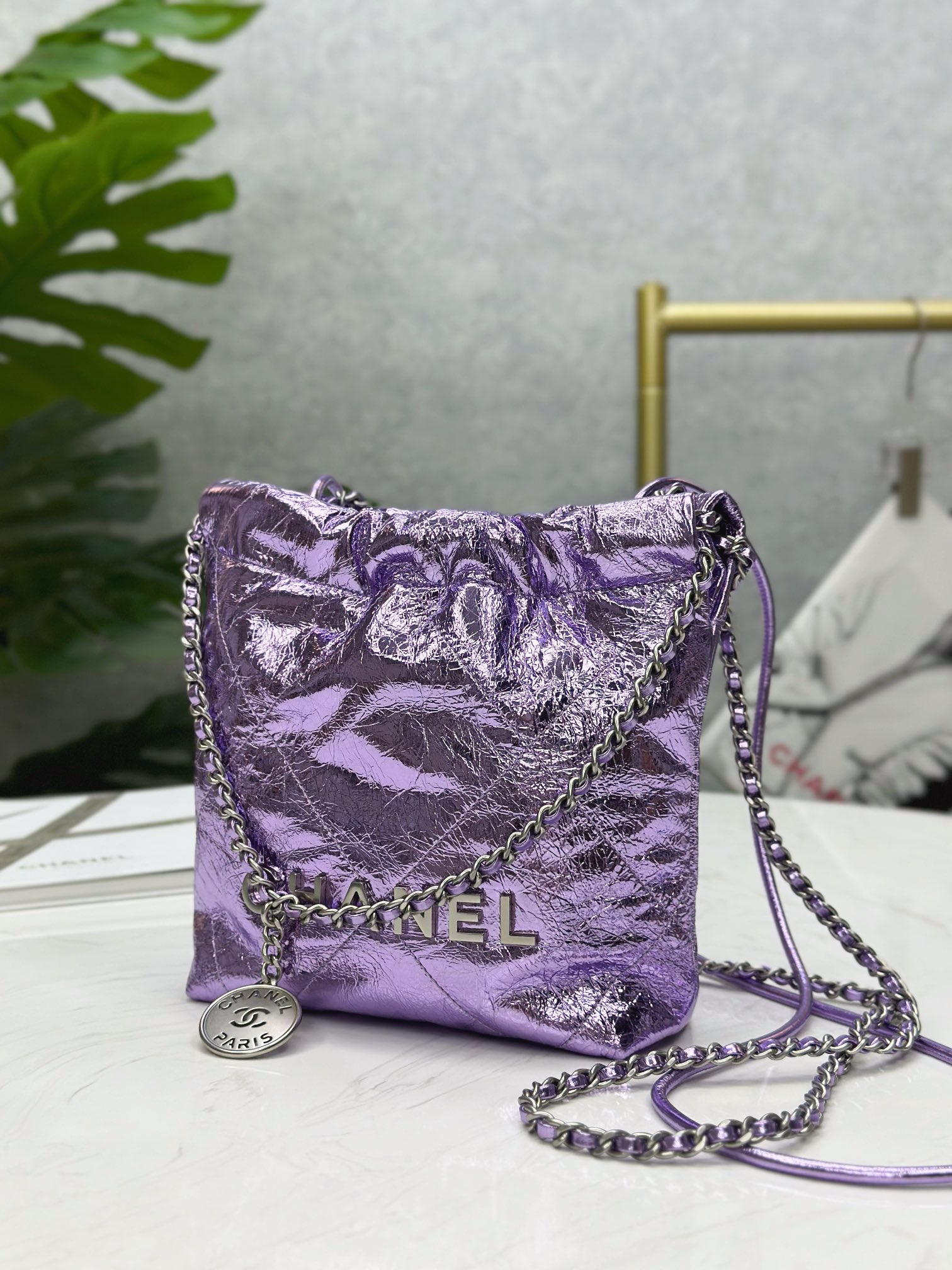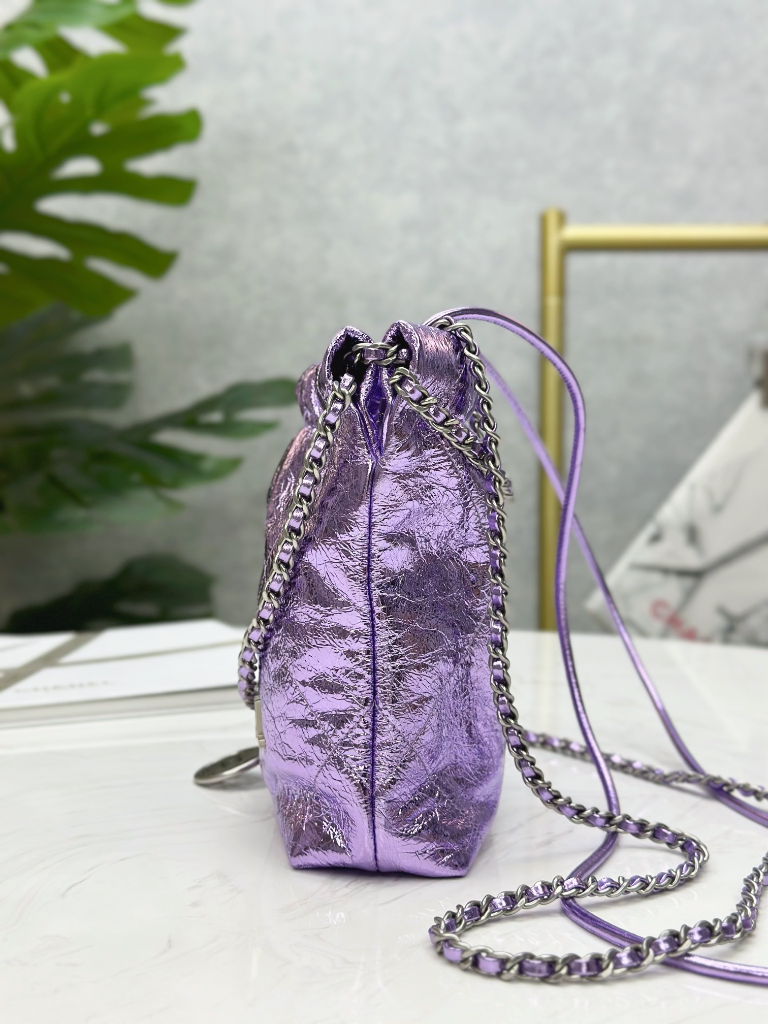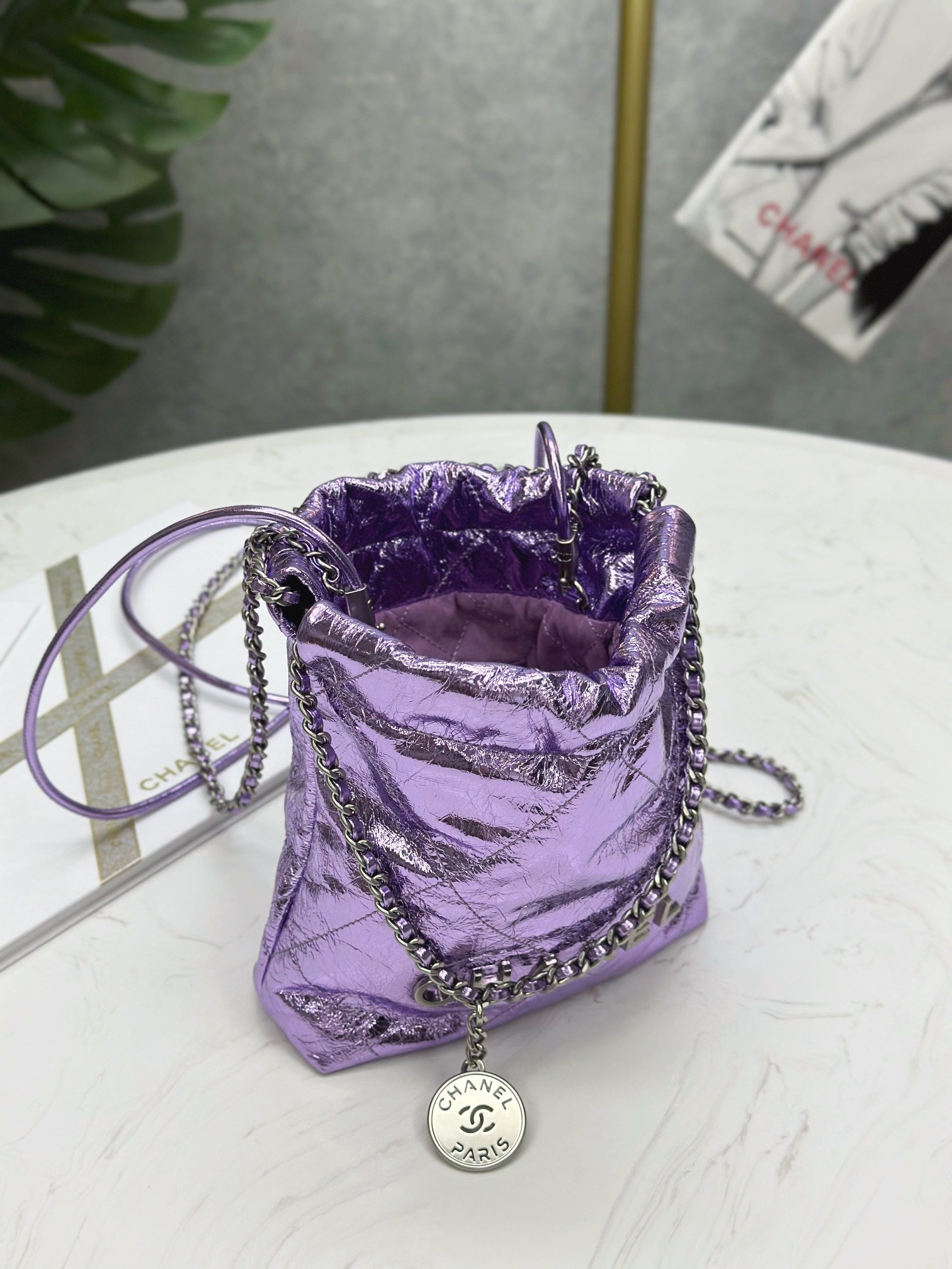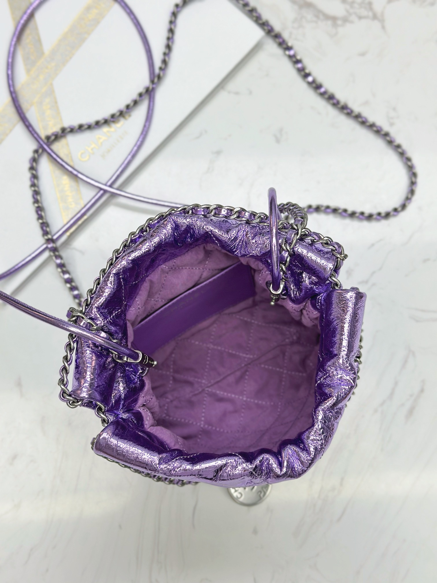 CHANEL 25C 22Bag, brand logo, metallic texture, drawstring, openable leather, chain diamond-shaped single-shoulder handbag, mini light purple