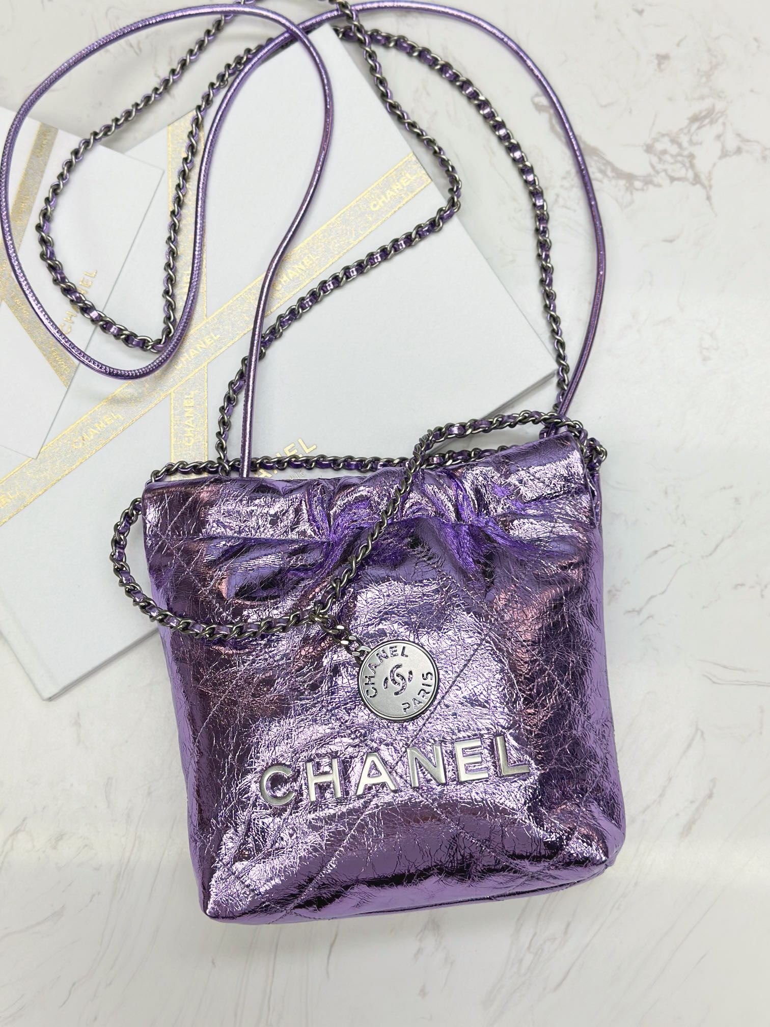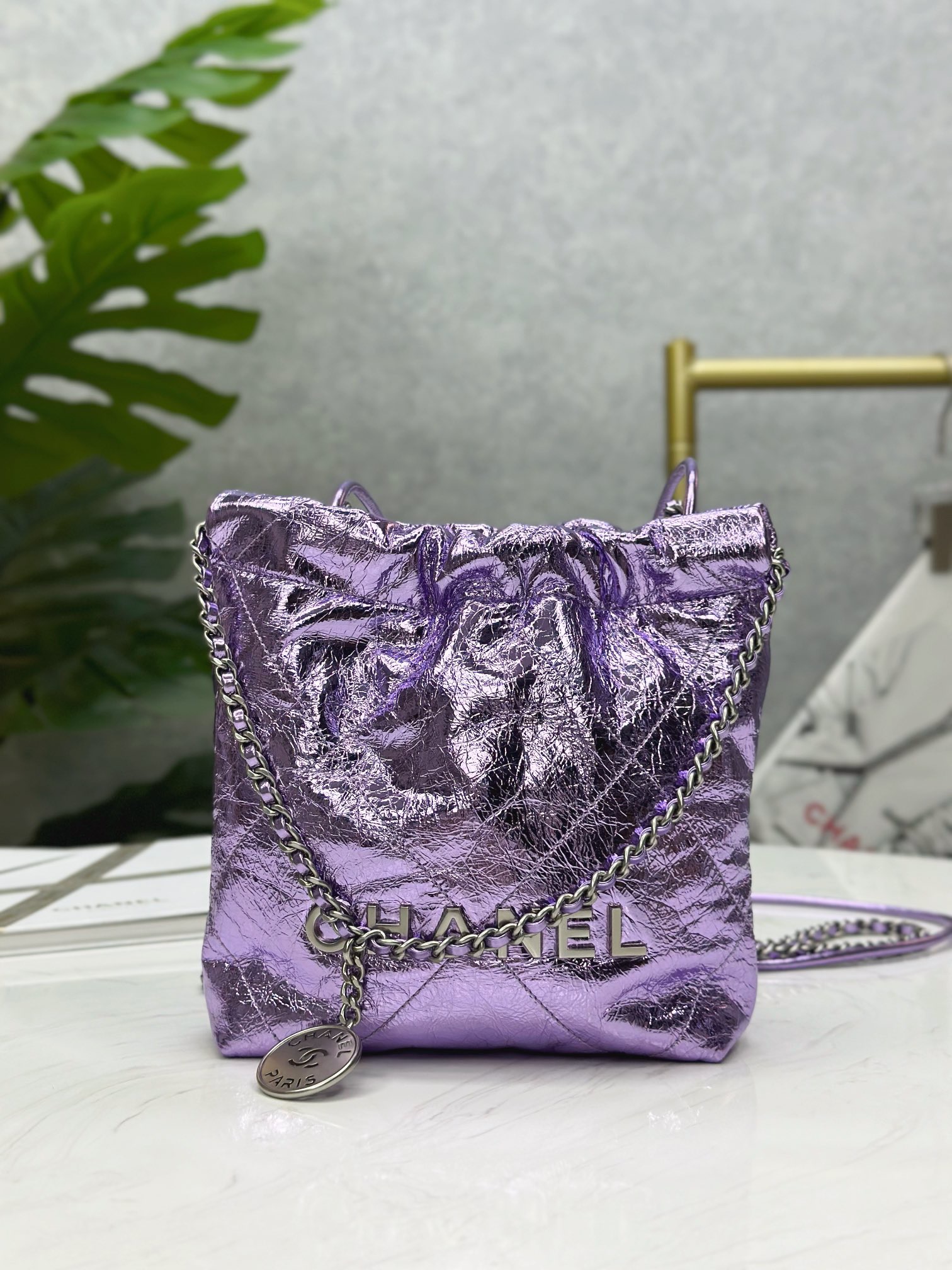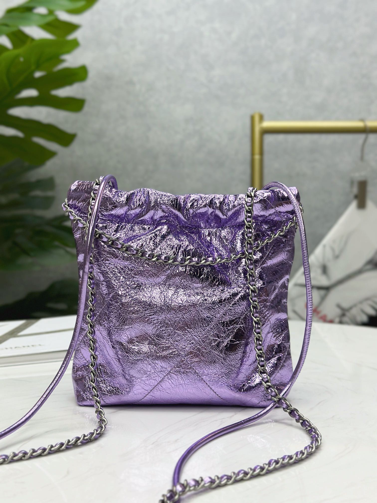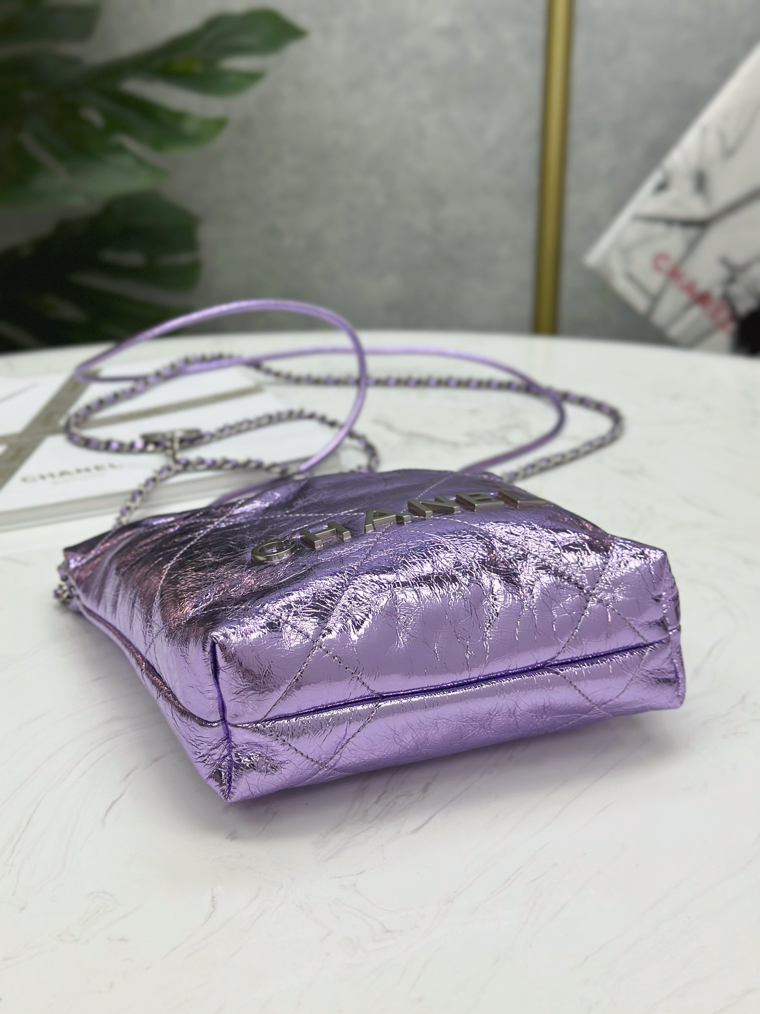 CHANEL 25C 22Bag, brand logo, metallic texture, drawstring, openable leather, chain diamond-shaped single-shoulder handbag, mini light purple